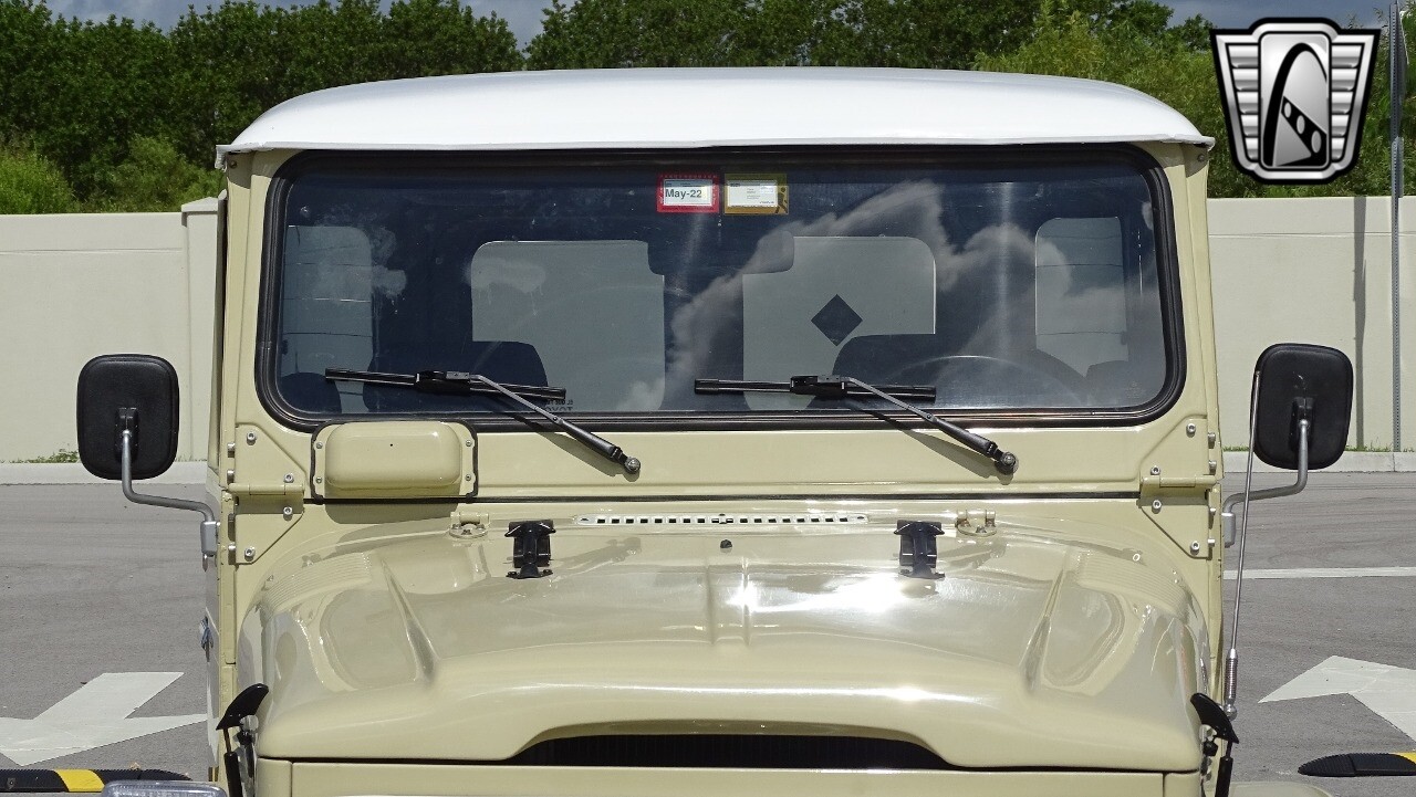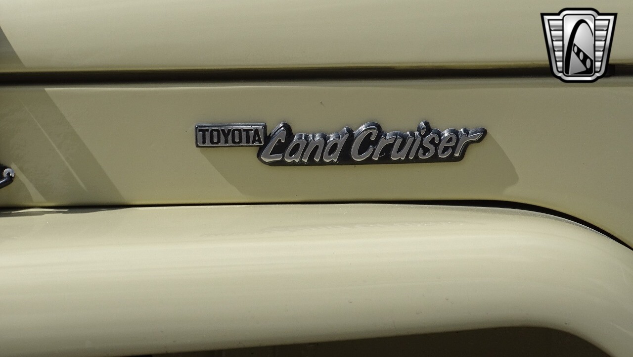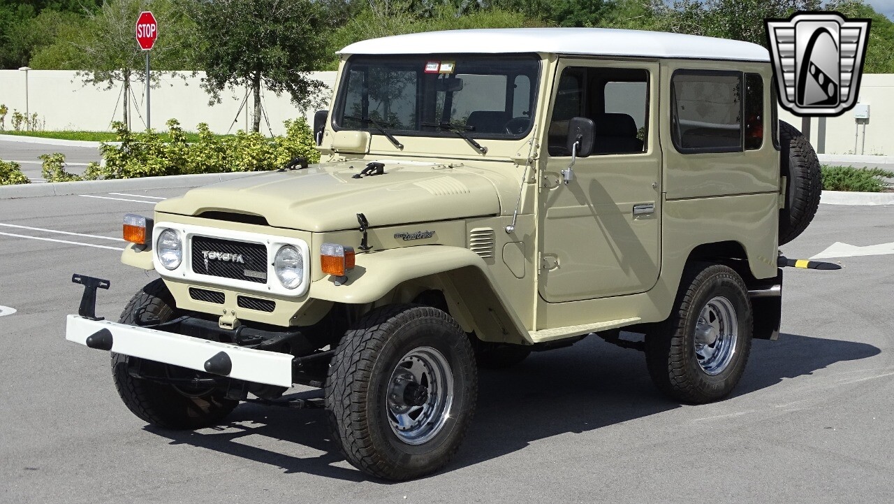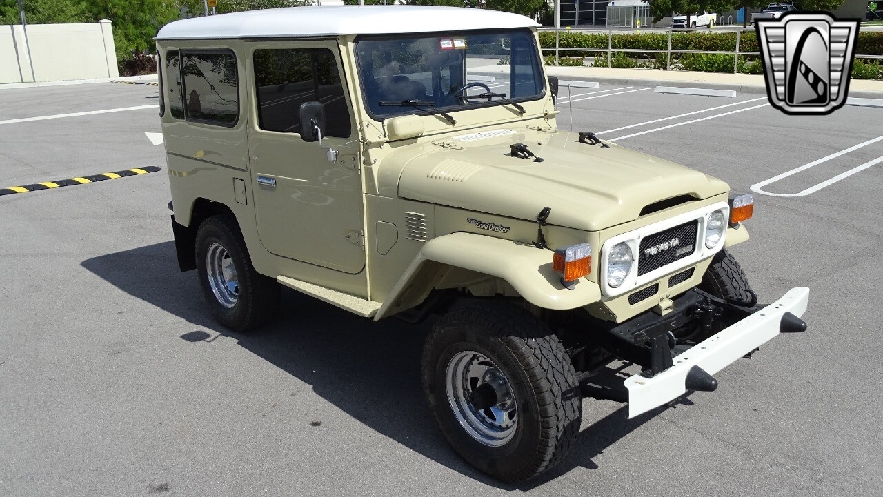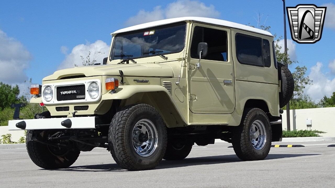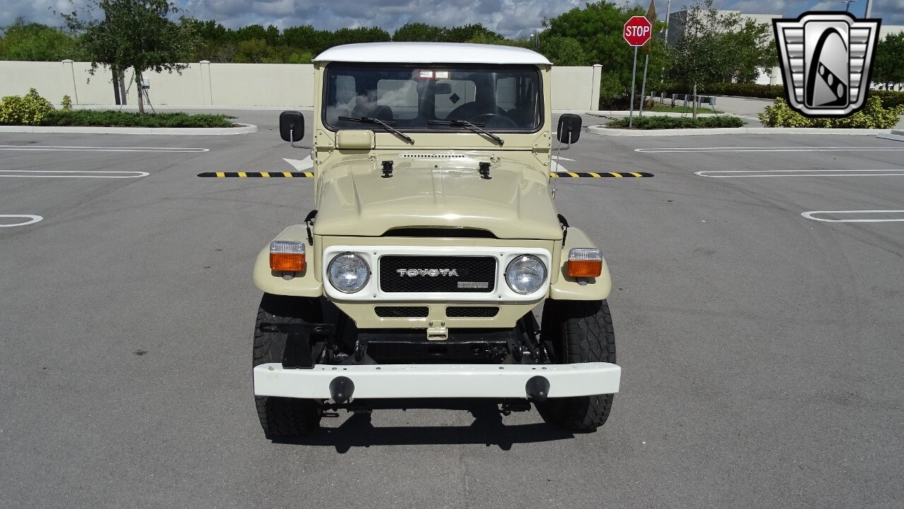 Introducing the classic 1979 Toyota Land Cruiser FJ40, a timeless symbol of off-road prowess and durability. This particular model sports a sophisticated beige exterior that exudes a sense of vintage charm, complemented by a sleek gray interior.