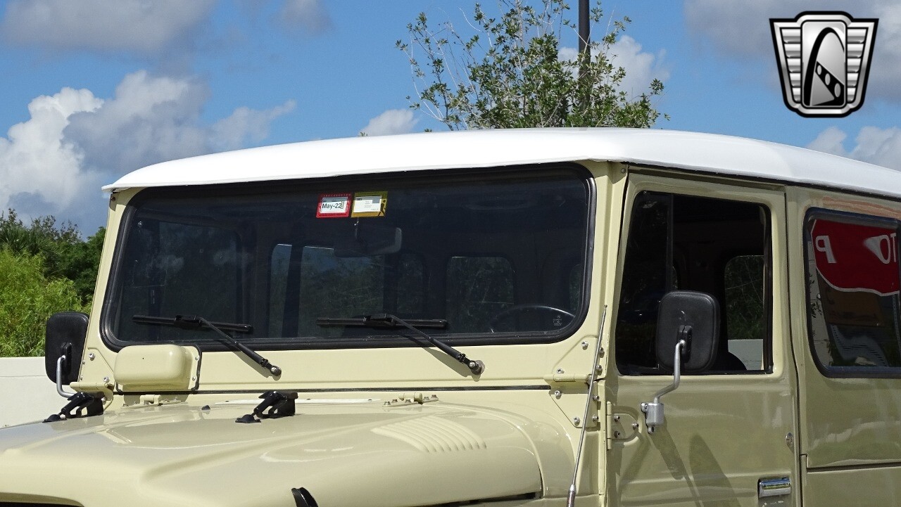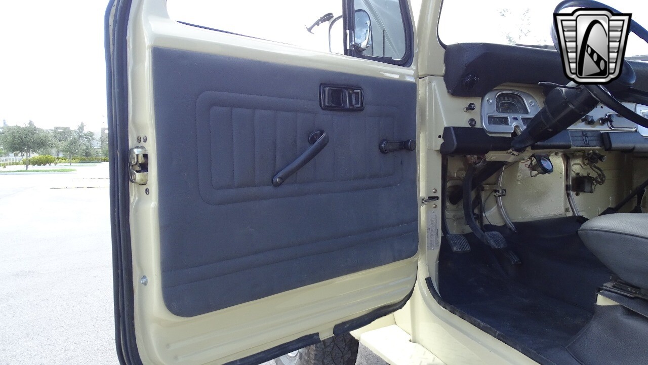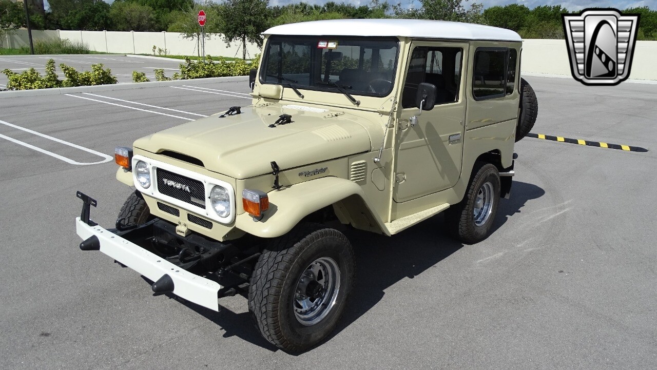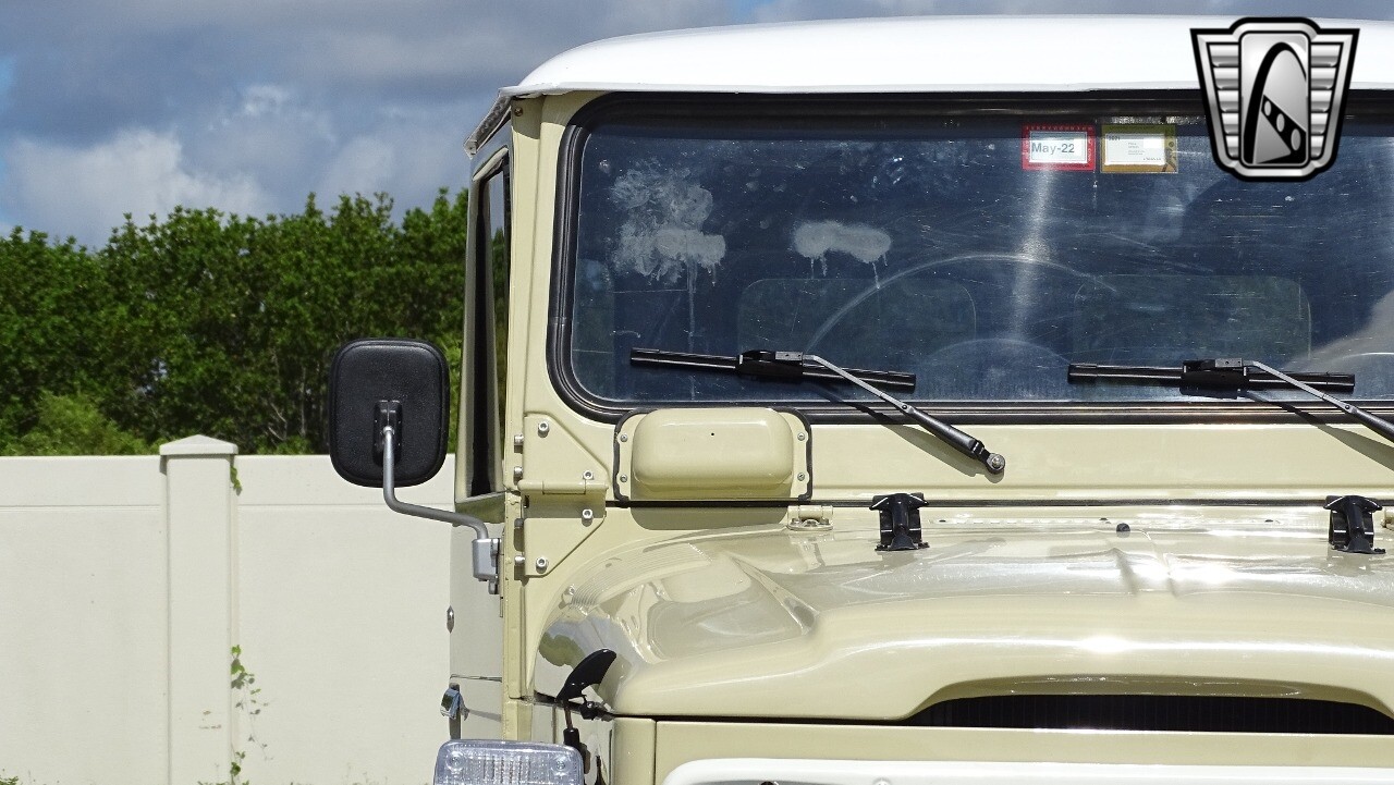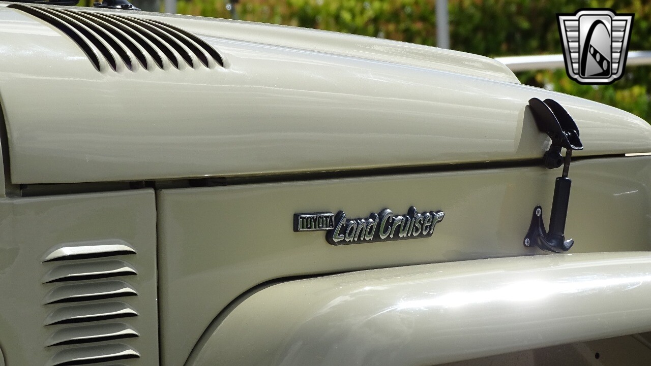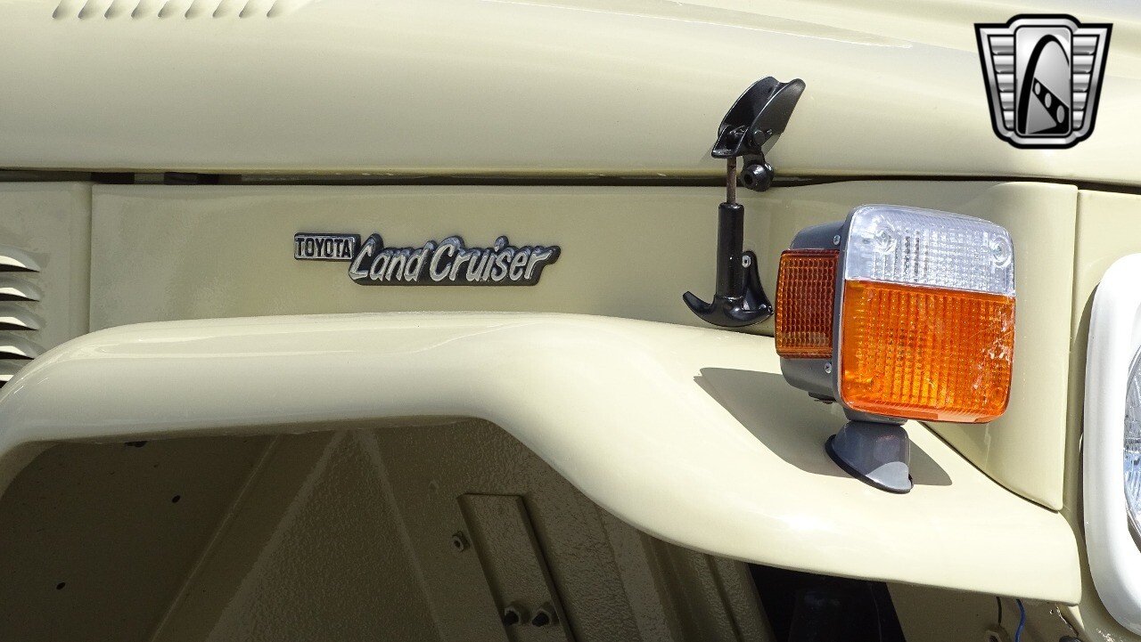 Introducing the classic 1979 Toyota Land Cruiser FJ40, a timeless symbol of off-road prowess and durability. This particular model sports a sophisticated beige exterior that exudes a sense of vintage charm, complemented by a sleek gray interior.