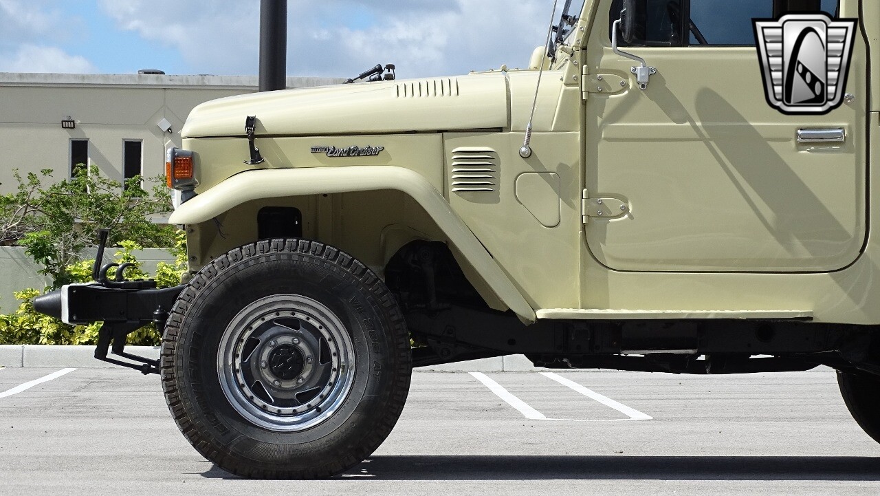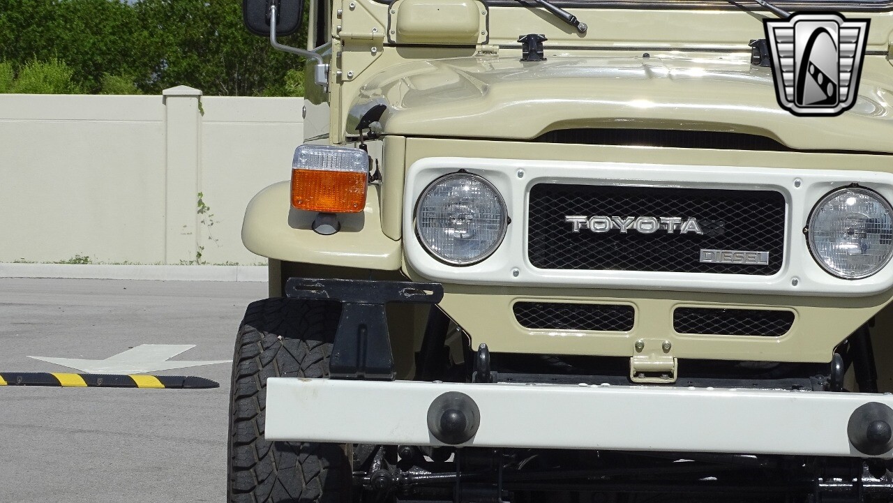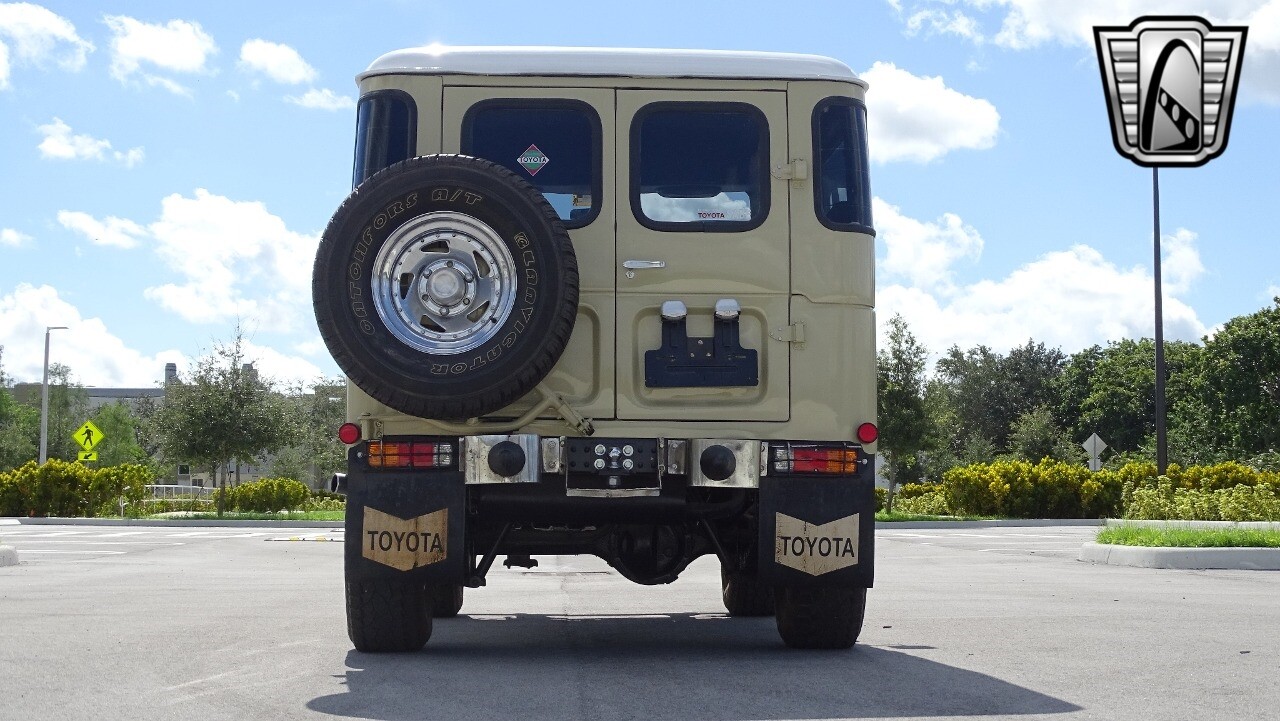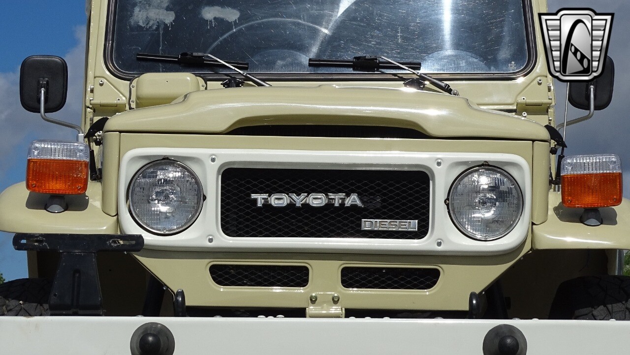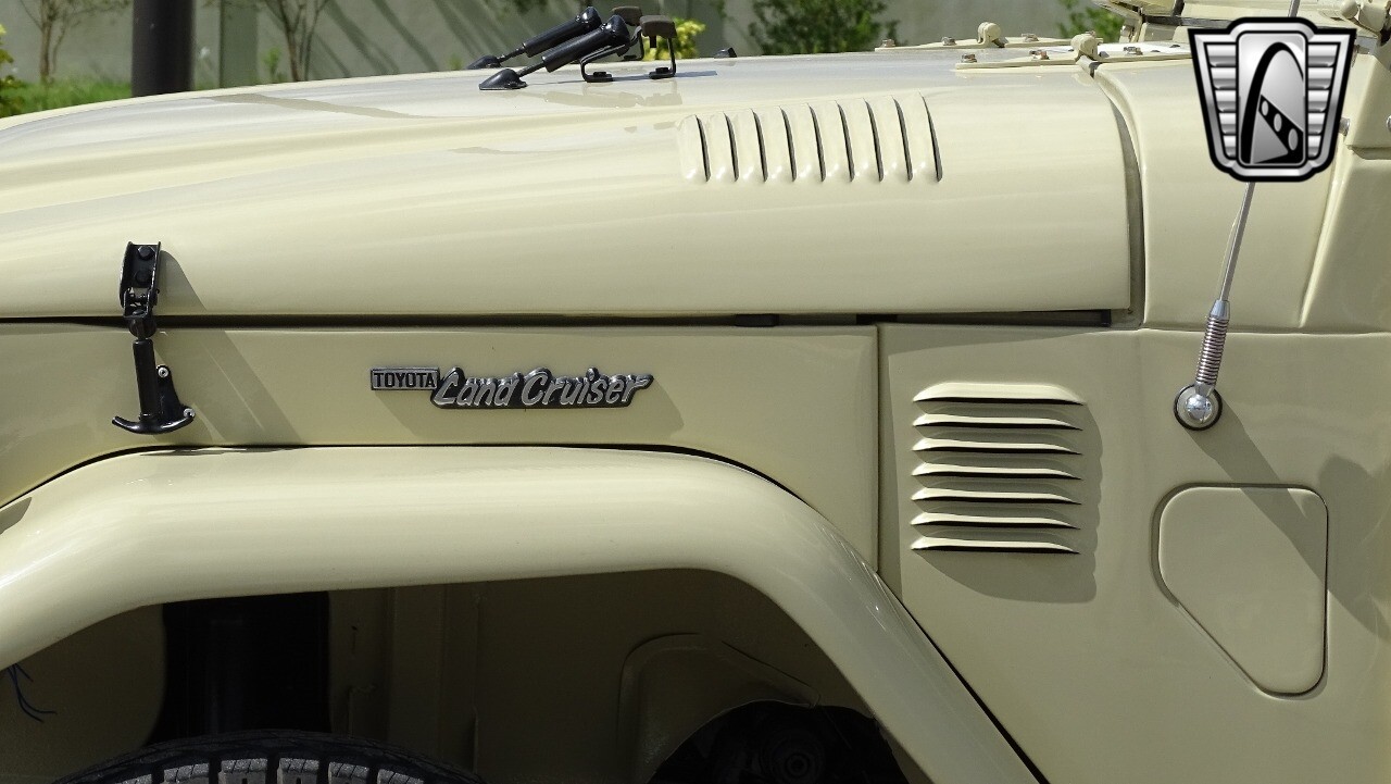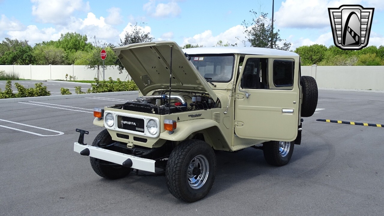 Introducing the classic 1979 Toyota Land Cruiser FJ40, a timeless symbol of off-road prowess and durability. This particular model sports a sophisticated beige exterior that exudes a sense of vintage charm, complemented by a sleek gray interior.