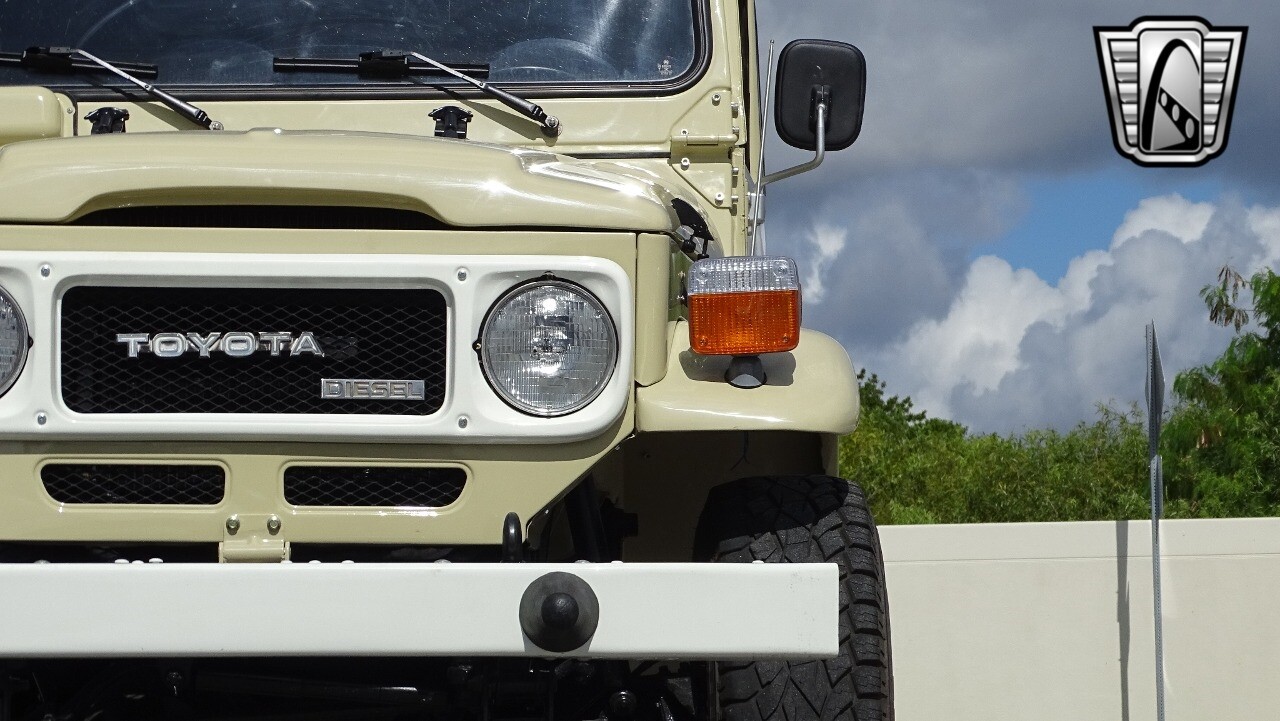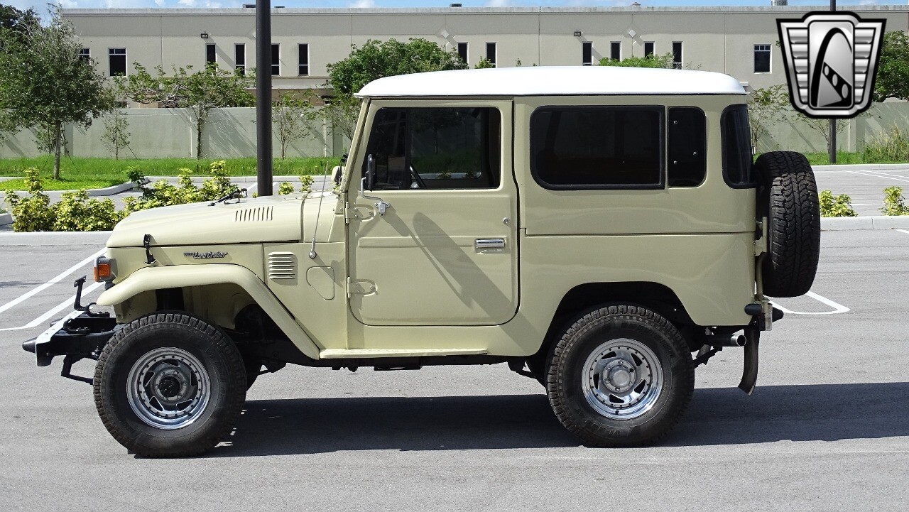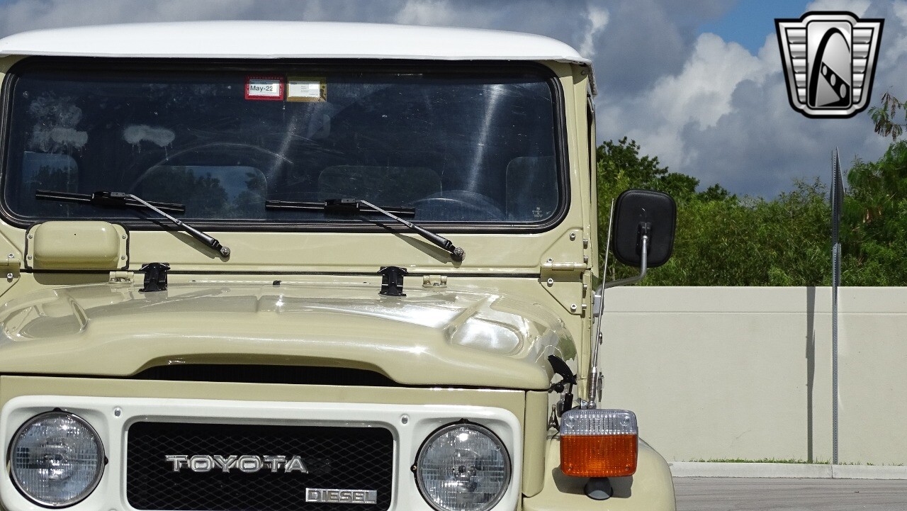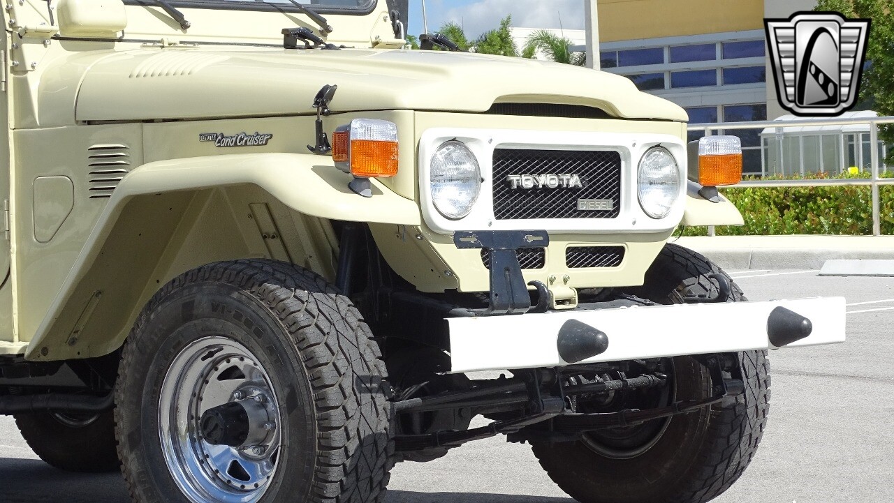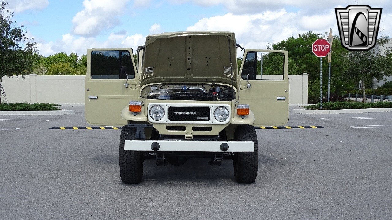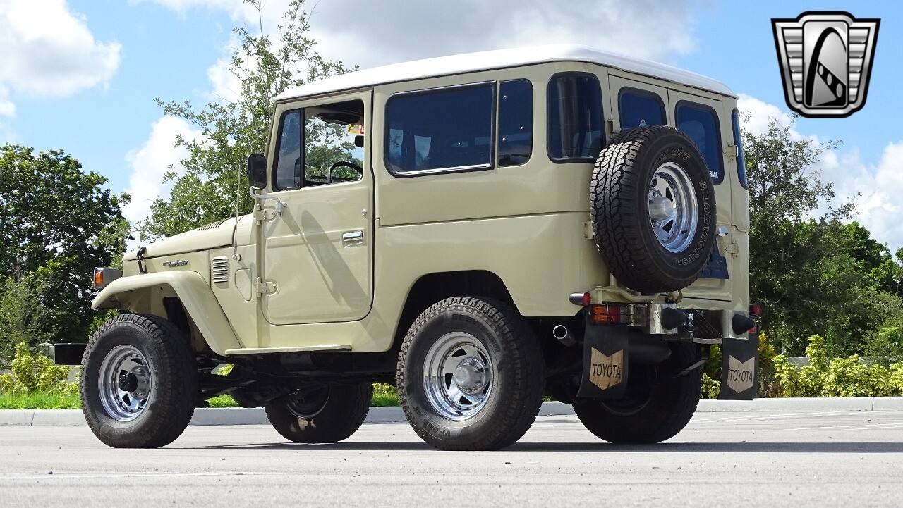 Introducing the classic 1979 Toyota Land Cruiser FJ40, a timeless symbol of off-road prowess and durability. This particular model sports a sophisticated beige exterior that exudes a sense of vintage charm, complemented by a sleek gray interior.