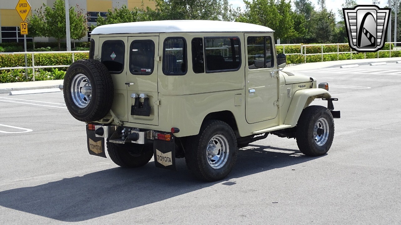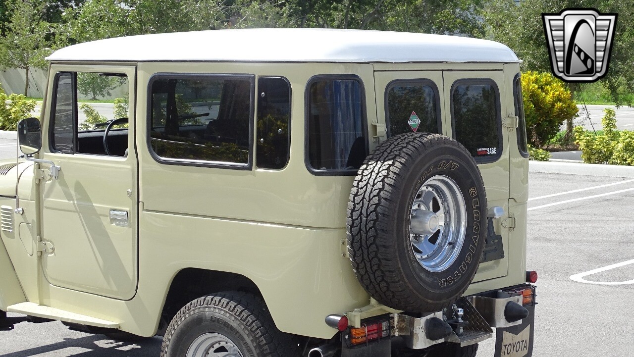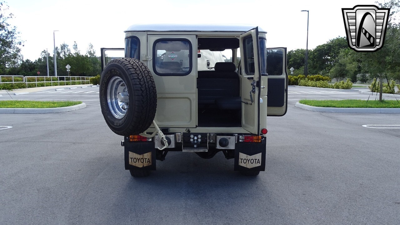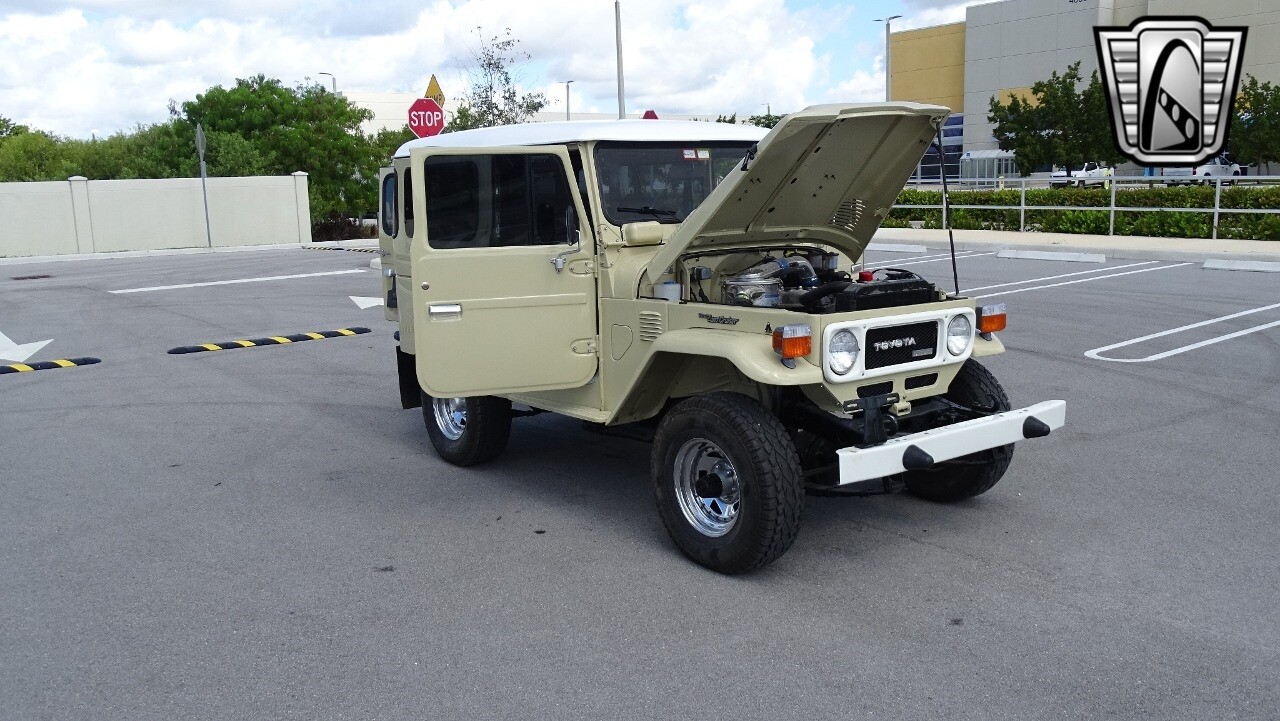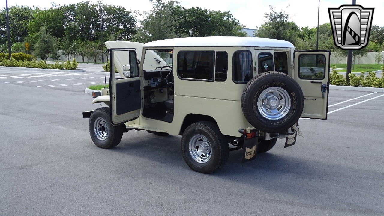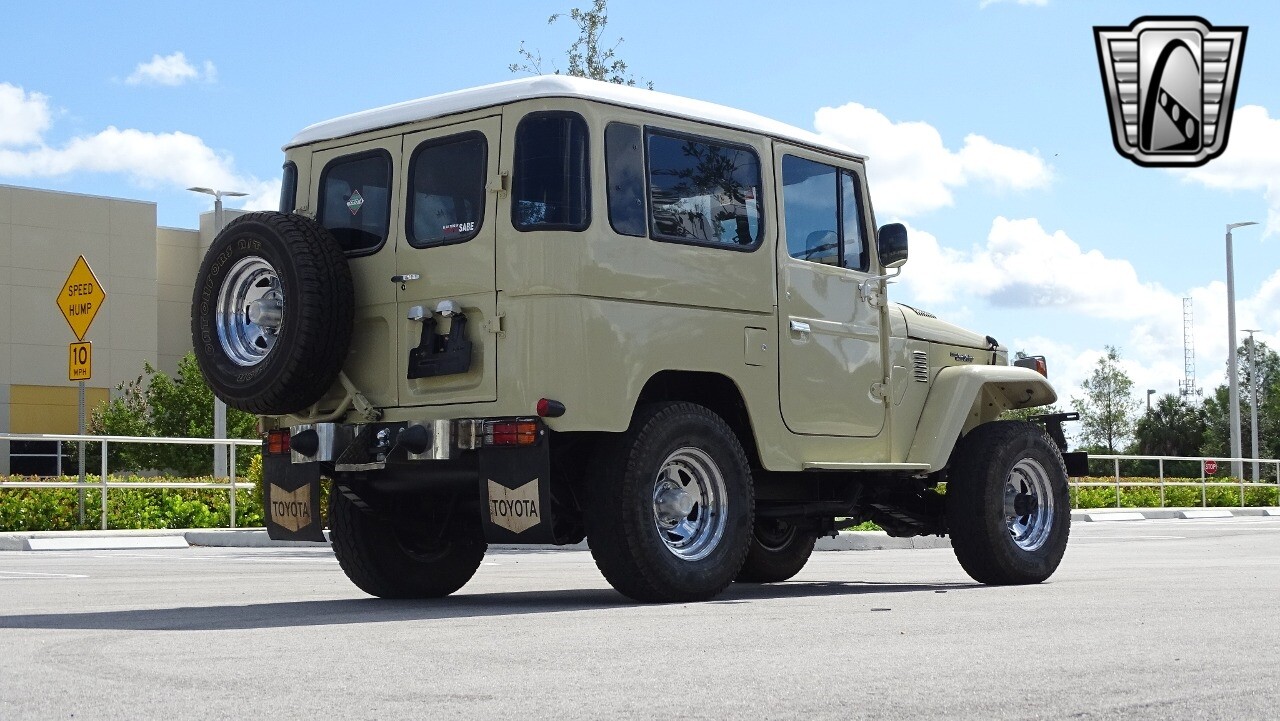 Introducing the classic 1979 Toyota Land Cruiser FJ40, a timeless symbol of off-road prowess and durability. This particular model sports a sophisticated beige exterior that exudes a sense of vintage charm, complemented by a sleek gray interior.