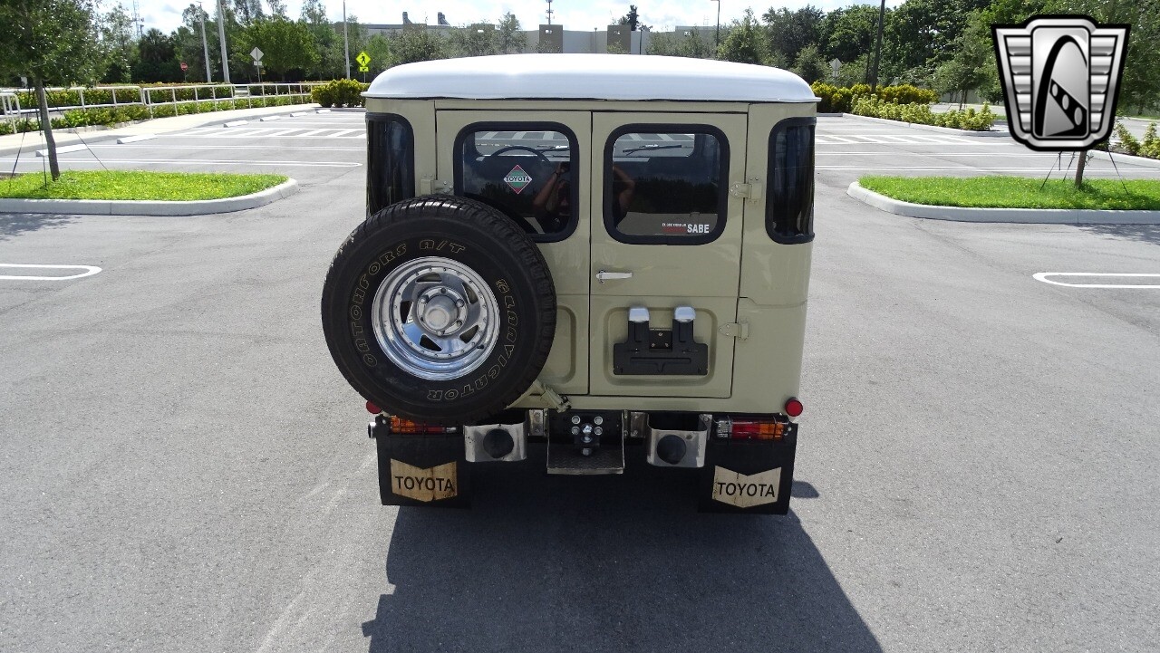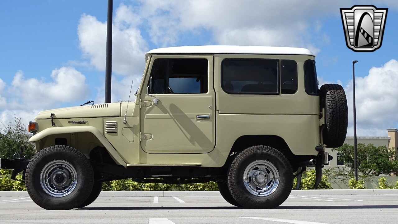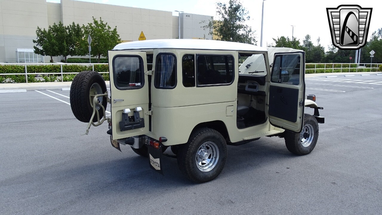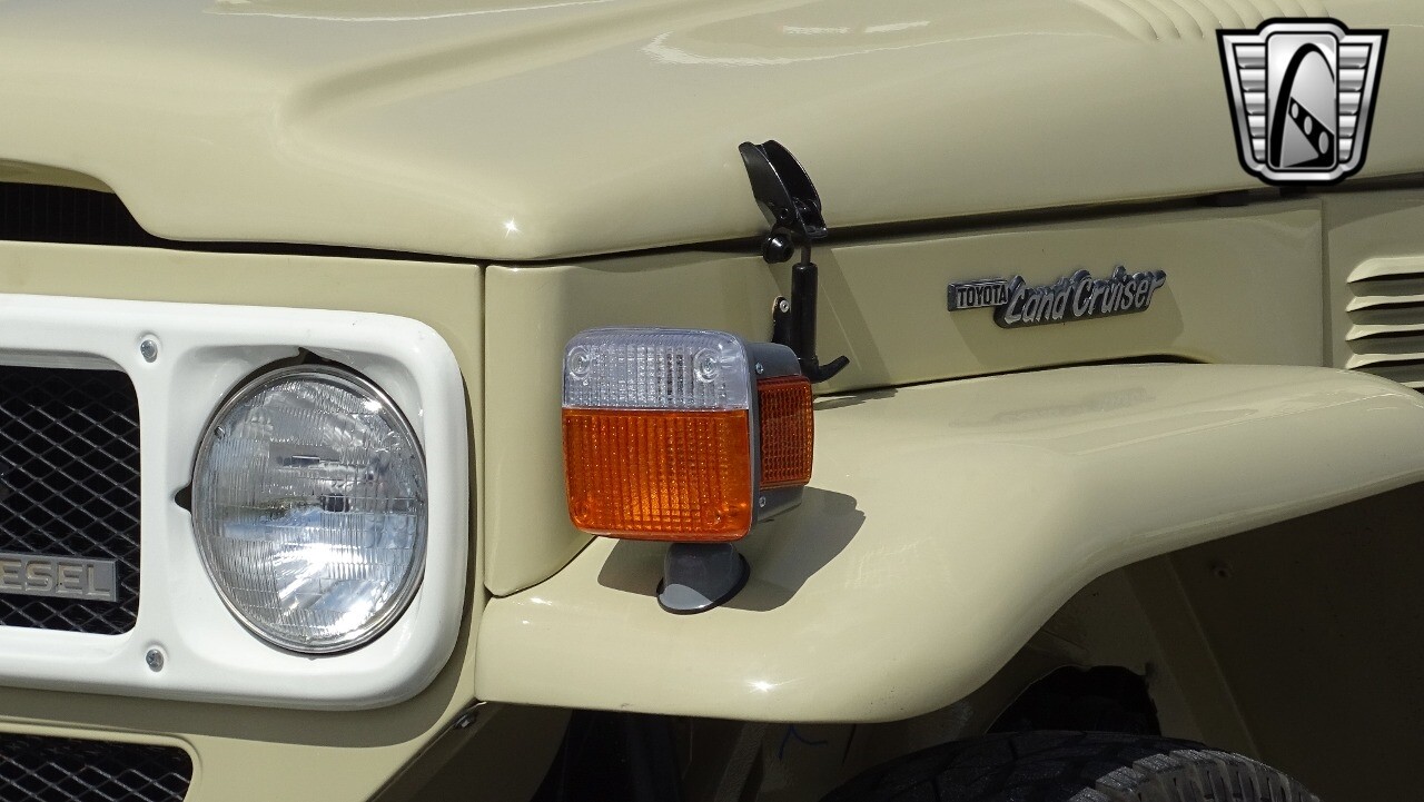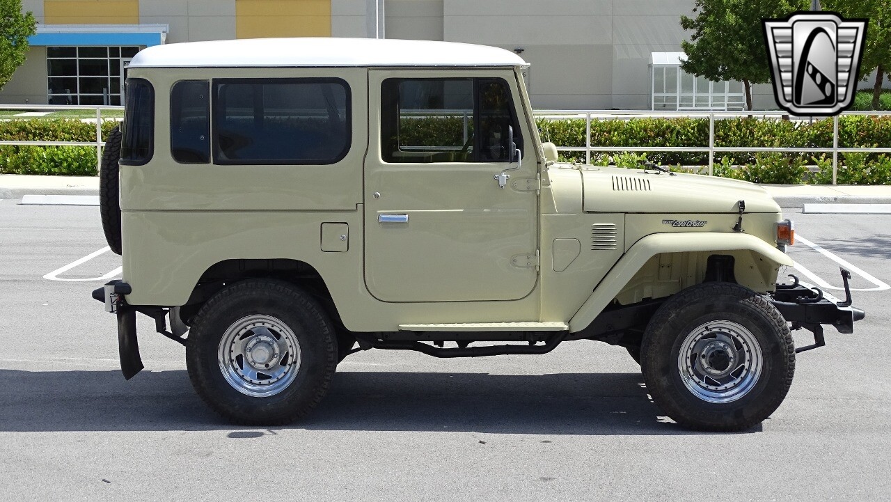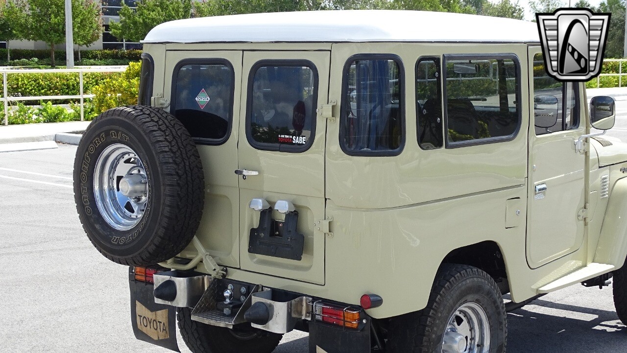 Introducing the classic 1979 Toyota Land Cruiser FJ40, a timeless symbol of off-road prowess and durability. This particular model sports a sophisticated beige exterior that exudes a sense of vintage charm, complemented by a sleek gray interior.
