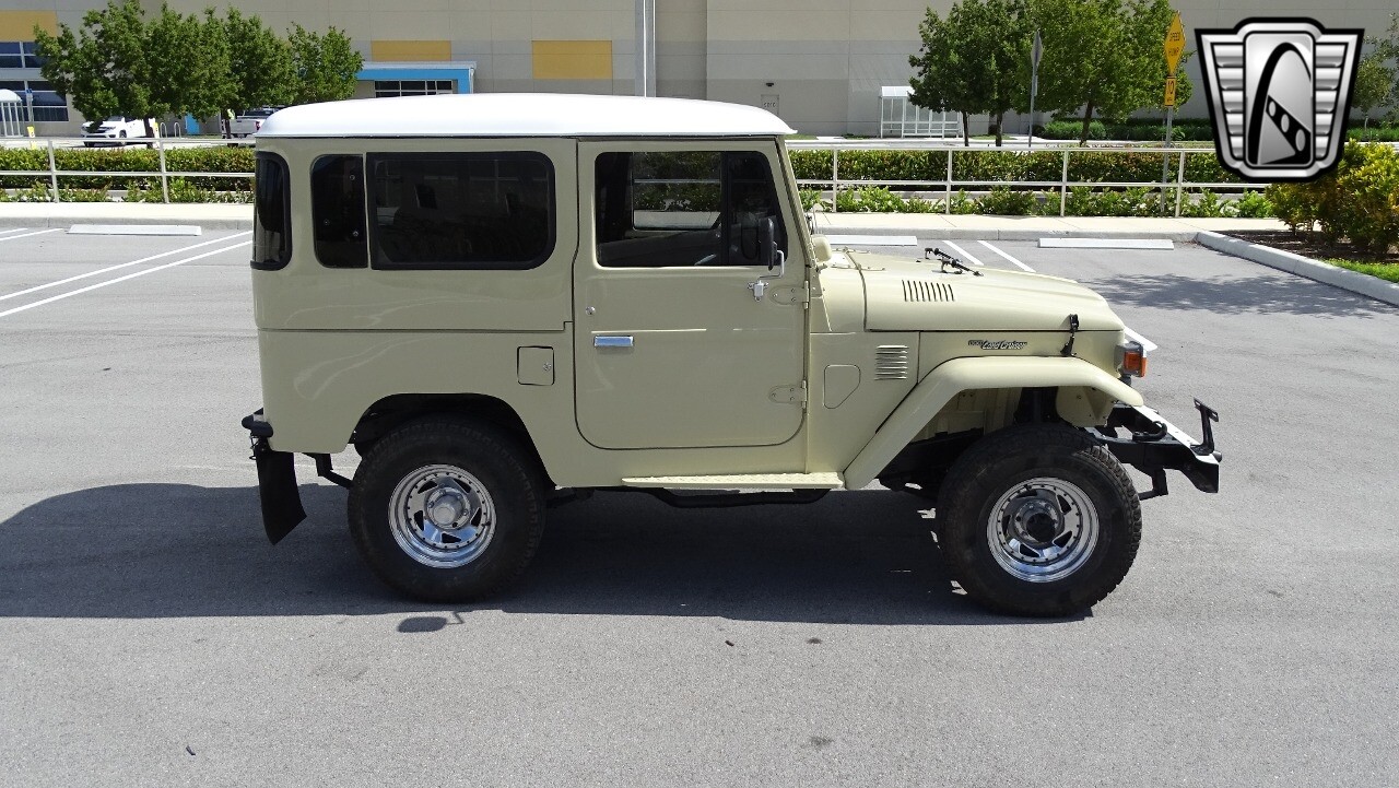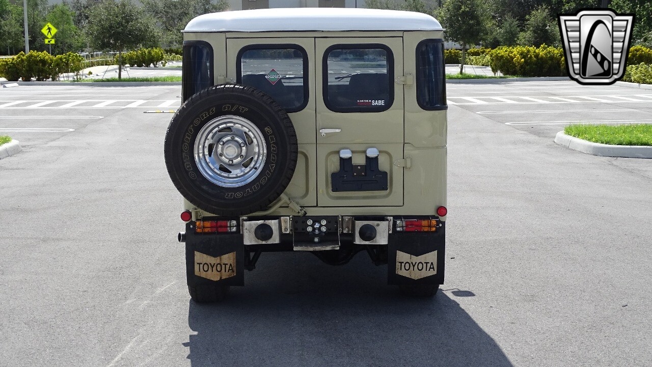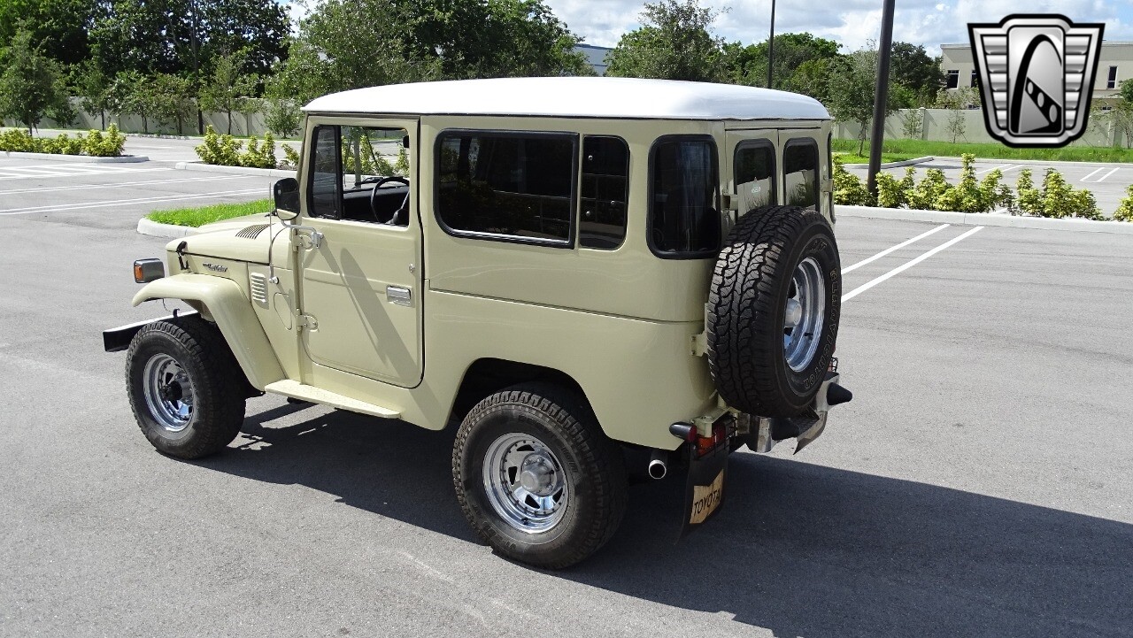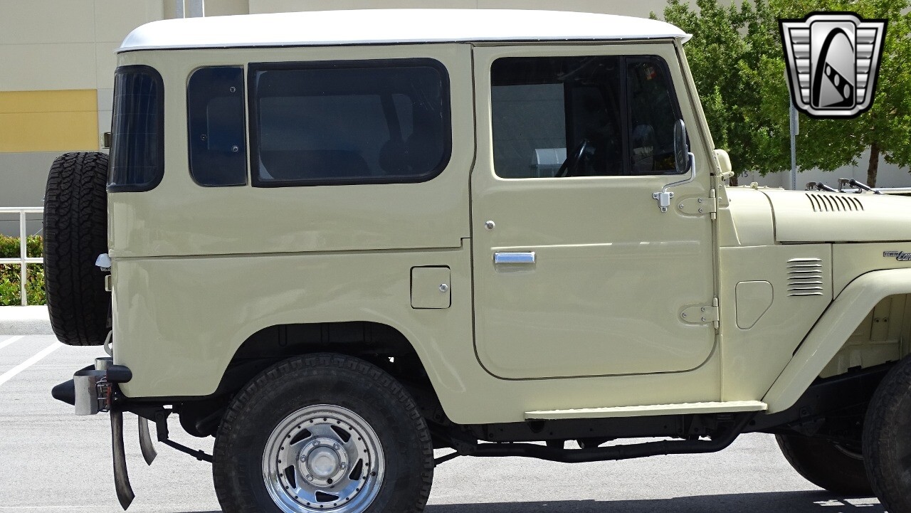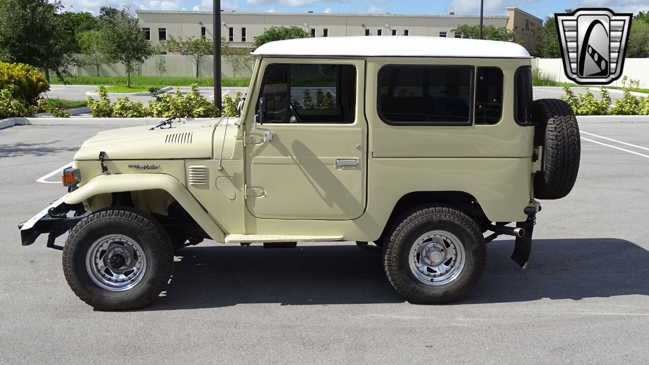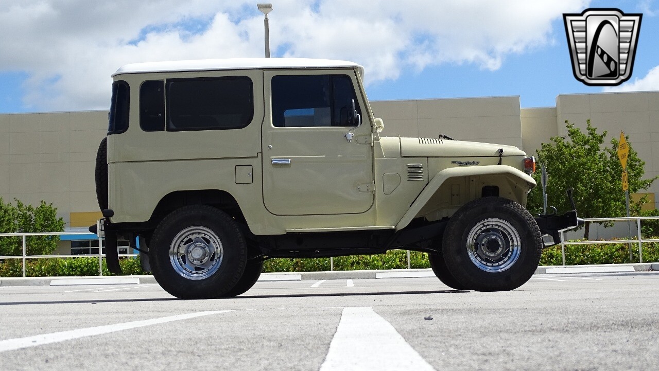 Introducing the classic 1979 Toyota Land Cruiser FJ40, a timeless symbol of off-road prowess and durability. This particular model sports a sophisticated beige exterior that exudes a sense of vintage charm, complemented by a sleek gray interior.
