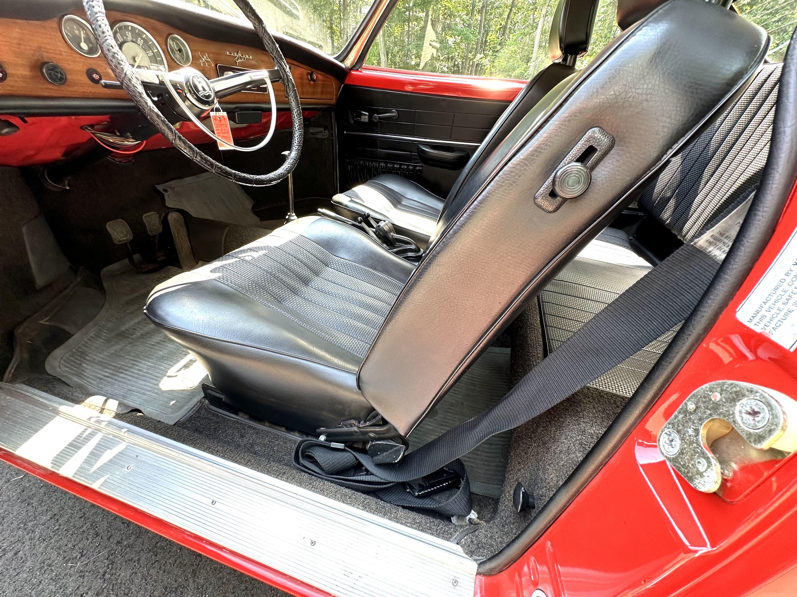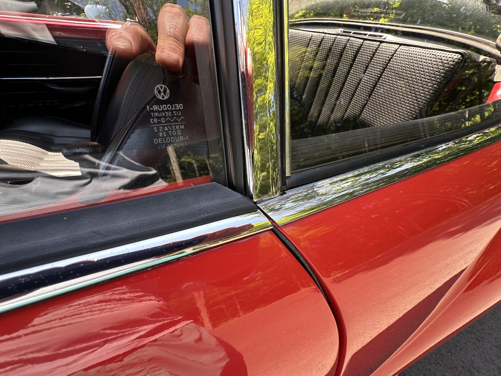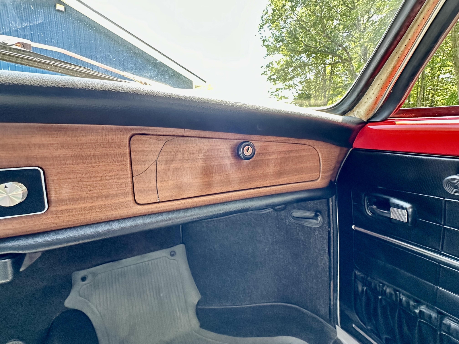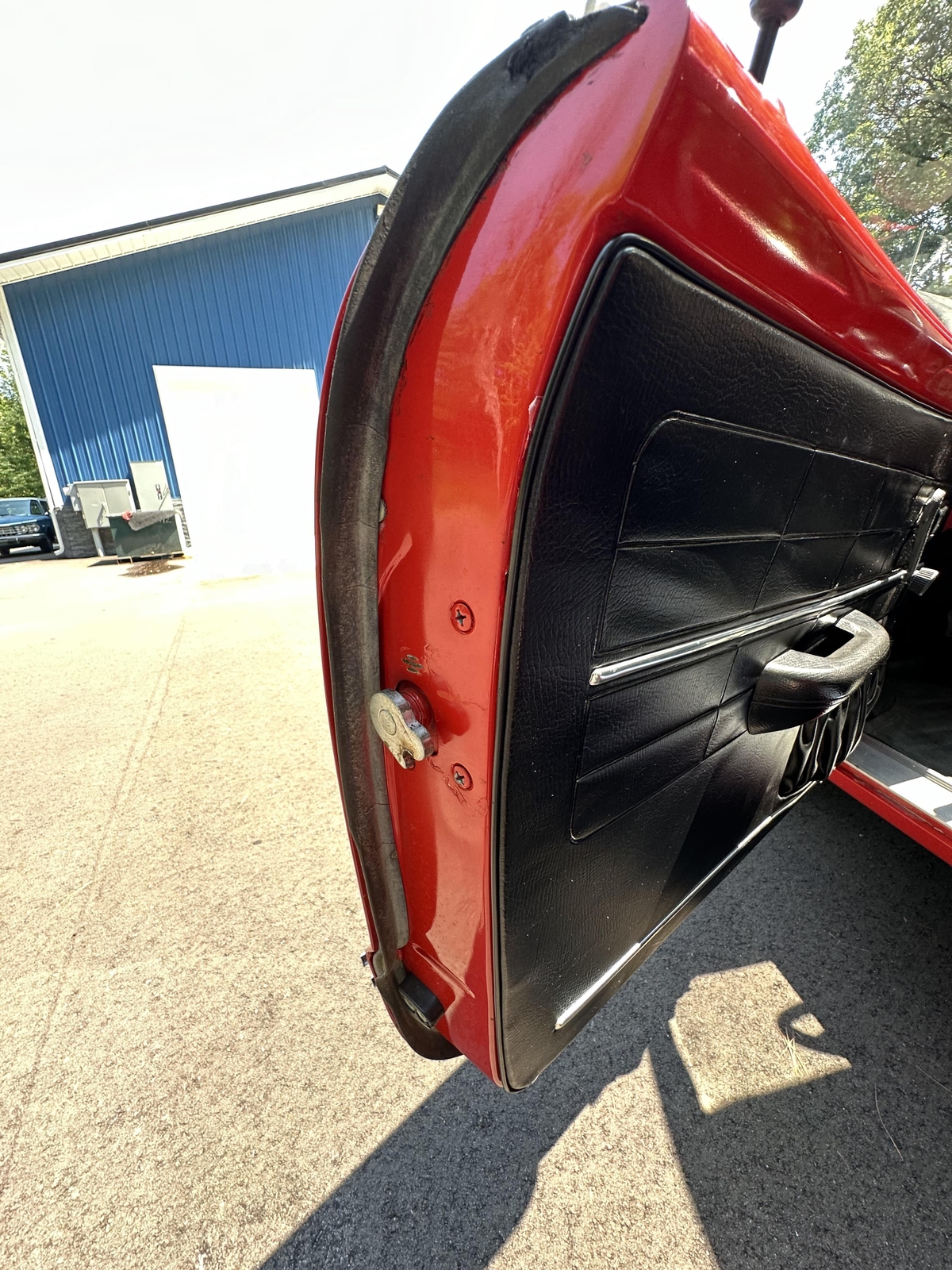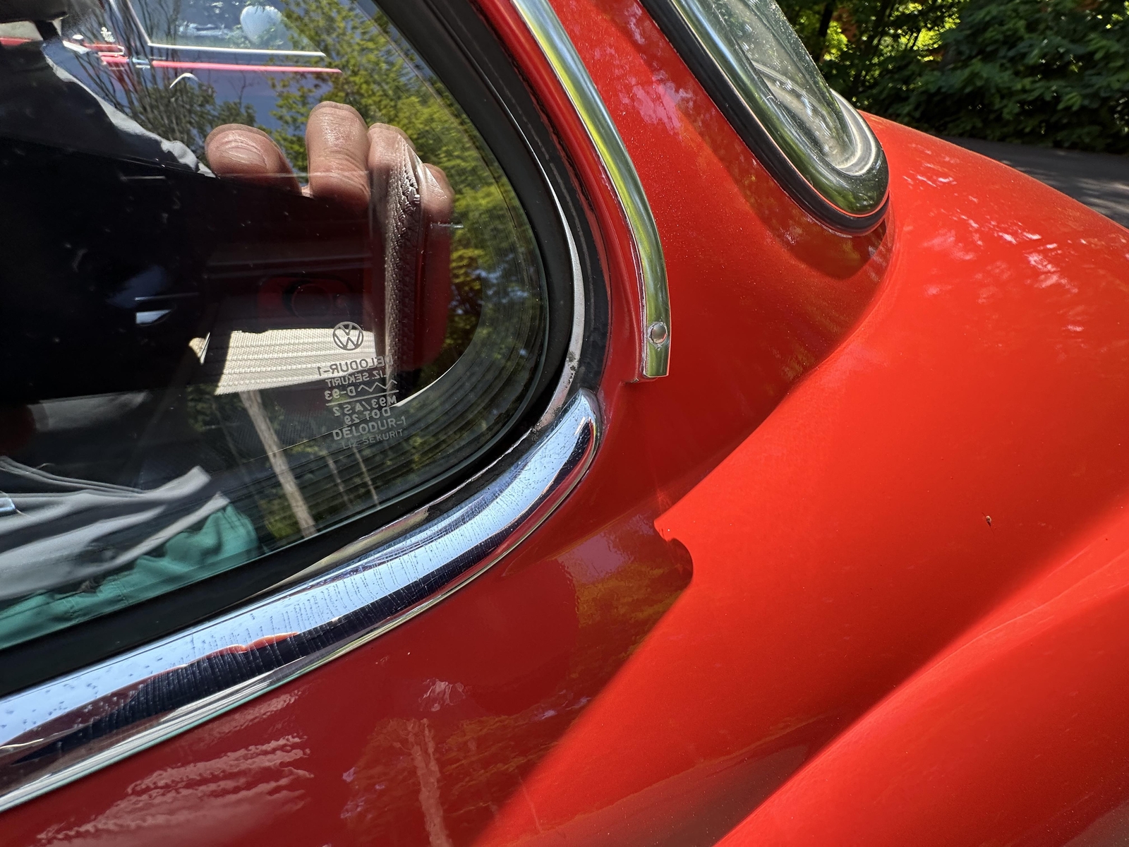 The exterior of this car presents beautifully, with minimal blemishes and excellent trim and hardware. It retains its straight lines without any signs of concerning repairs. The Italian repaint enhances its appearance, giving it a beautiful shine. Some light checking in the paint on the nose adds character and reflects its history well. The original glass is in great condition, and all trim pieces are intact and well-maintained. There is a small door ding on the driver's side, which could easily be remedied with paintless dent repair (PDR). Overall, the exterior of this Ghia Coupe is truly fantastic.