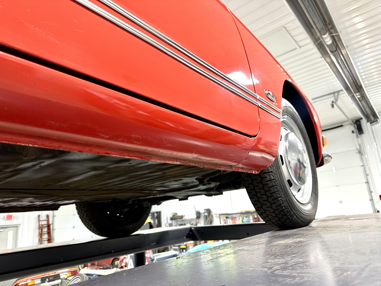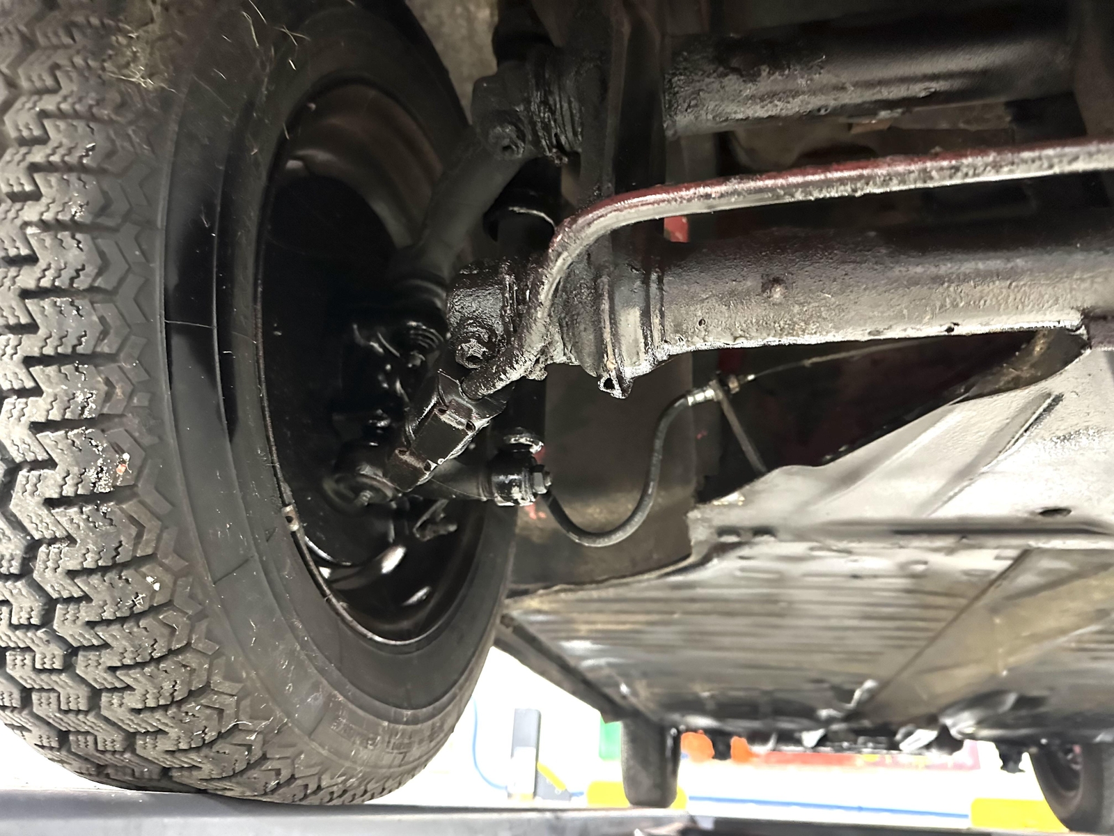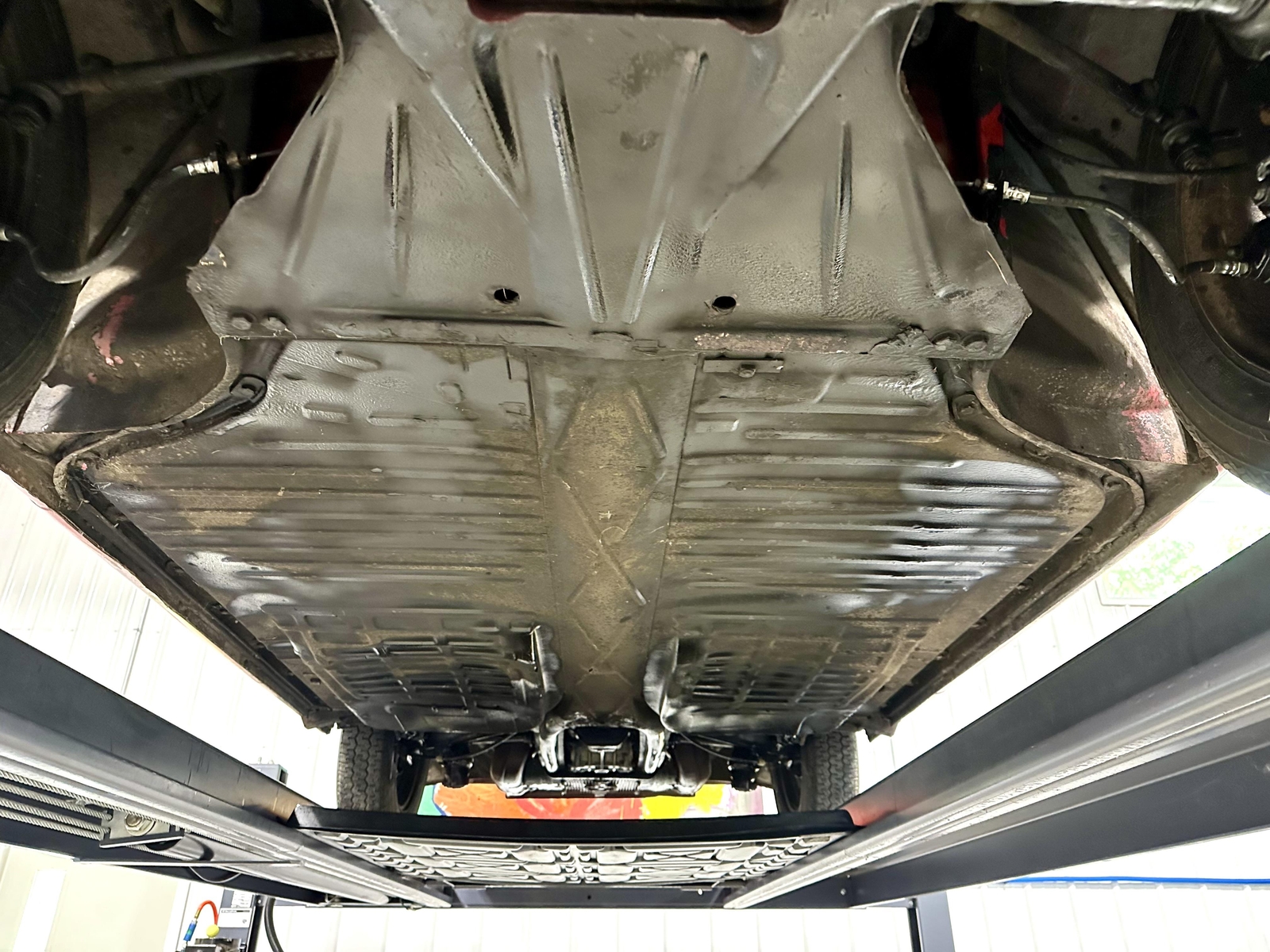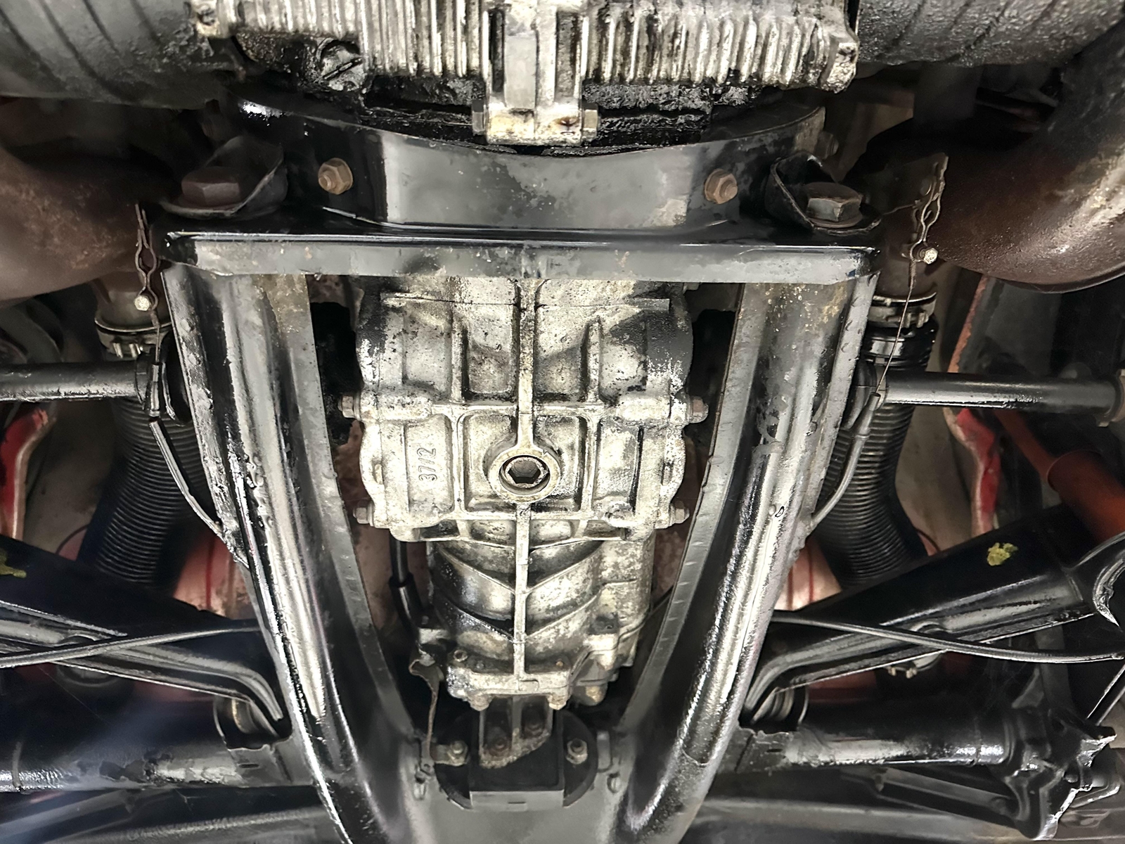 This car is exceptionally solid throughout, reflecting its origins in California and its recent garage-kept status. The pinch welds are dry and appear original, indicating the car's structural integrity. The suspension is fully intact and appears to be in good working condition.