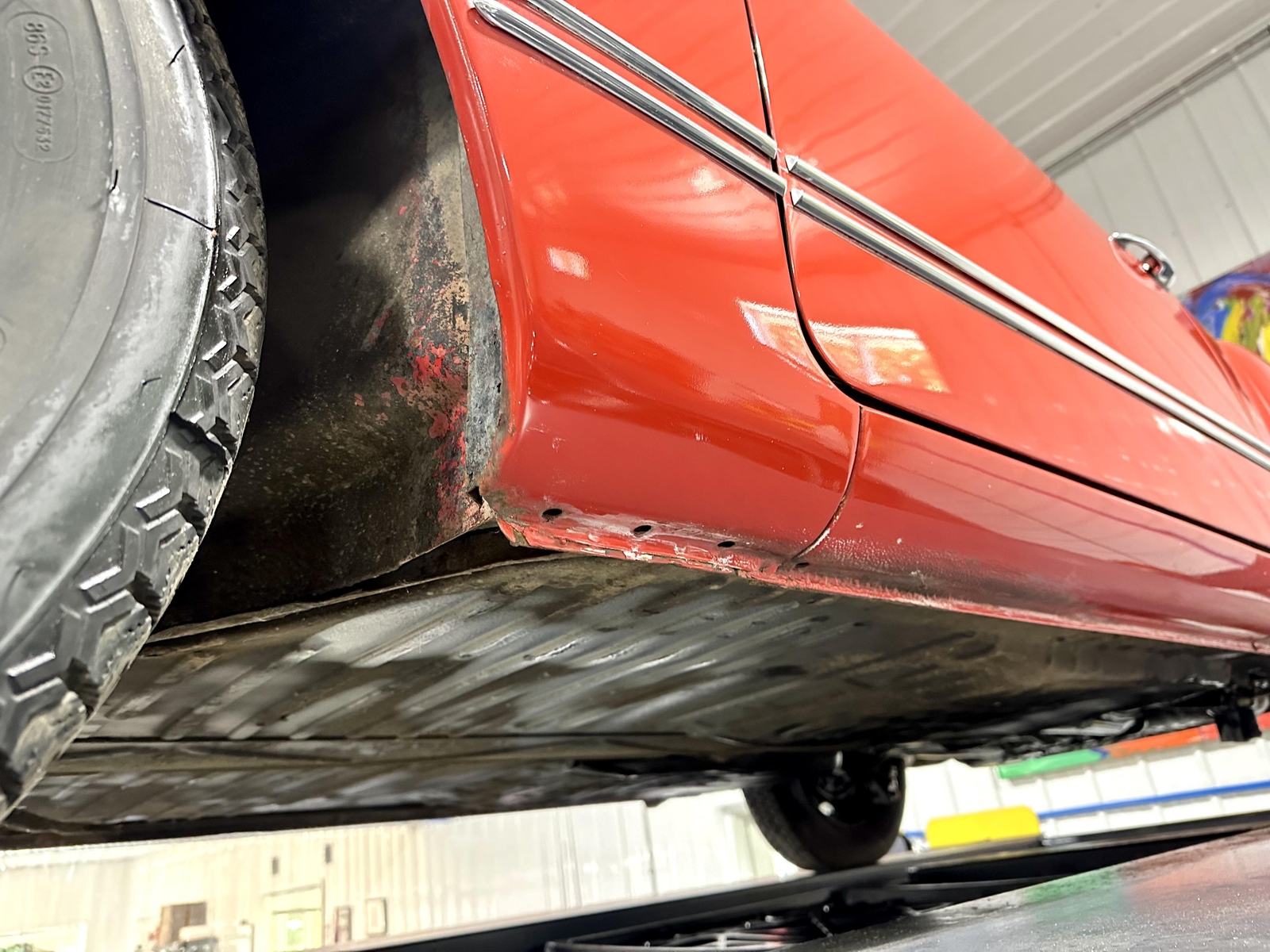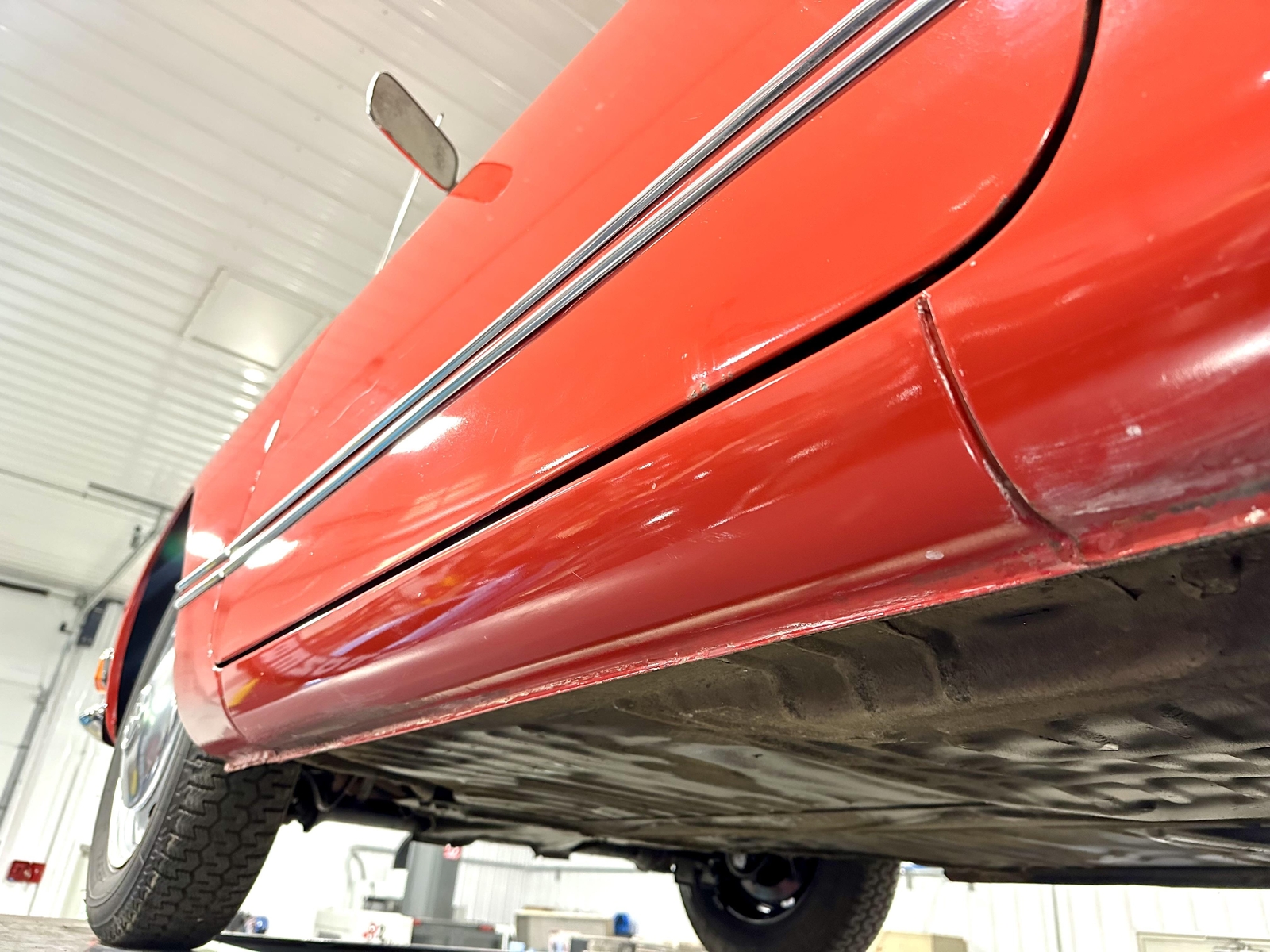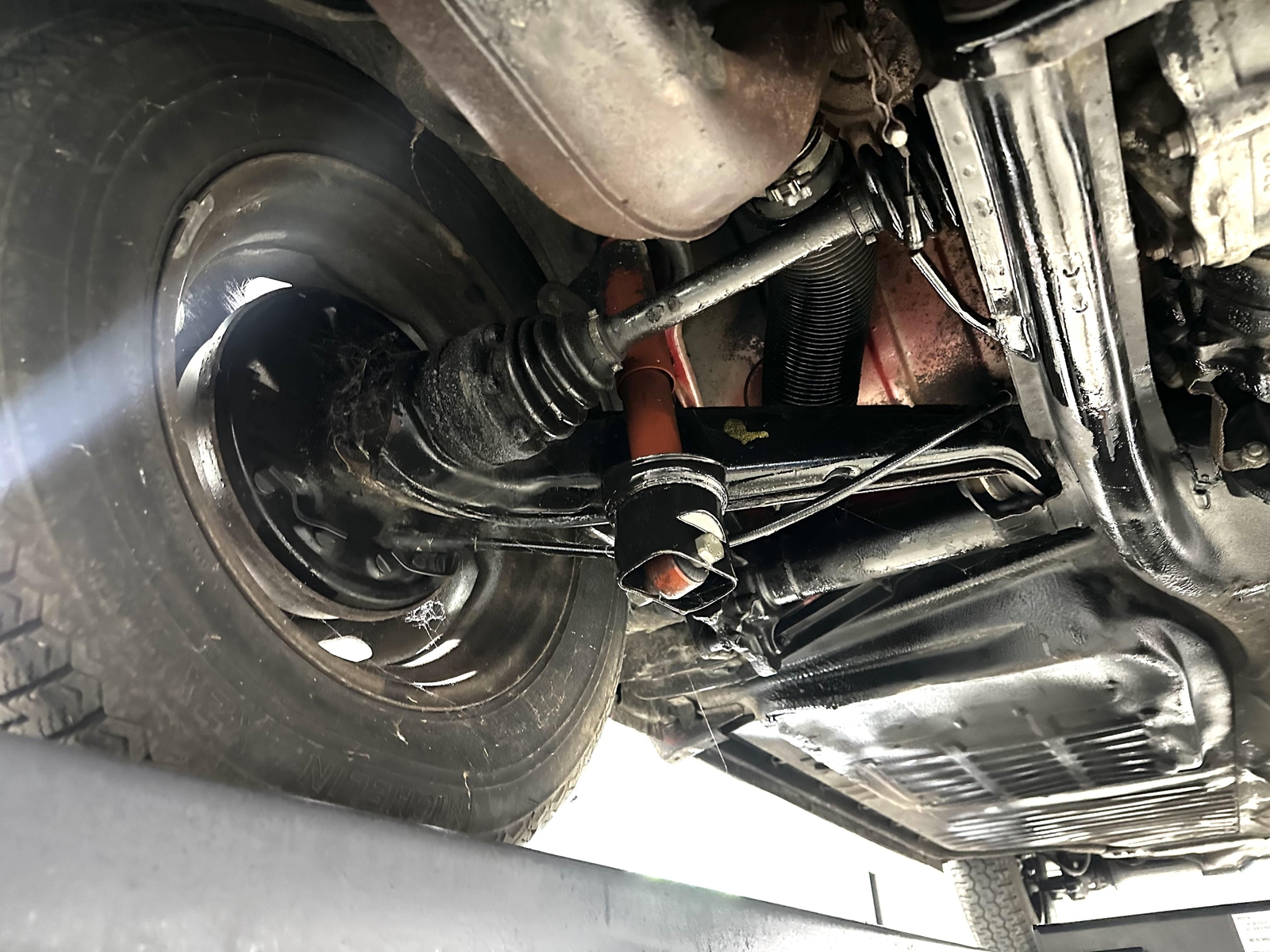 This car is exceptionally solid throughout, reflecting its origins in California and its recent garage-kept status. The pinch welds are dry and appear original, indicating the car's structural integrity. The suspension is fully intact and appears to be in good working condition.