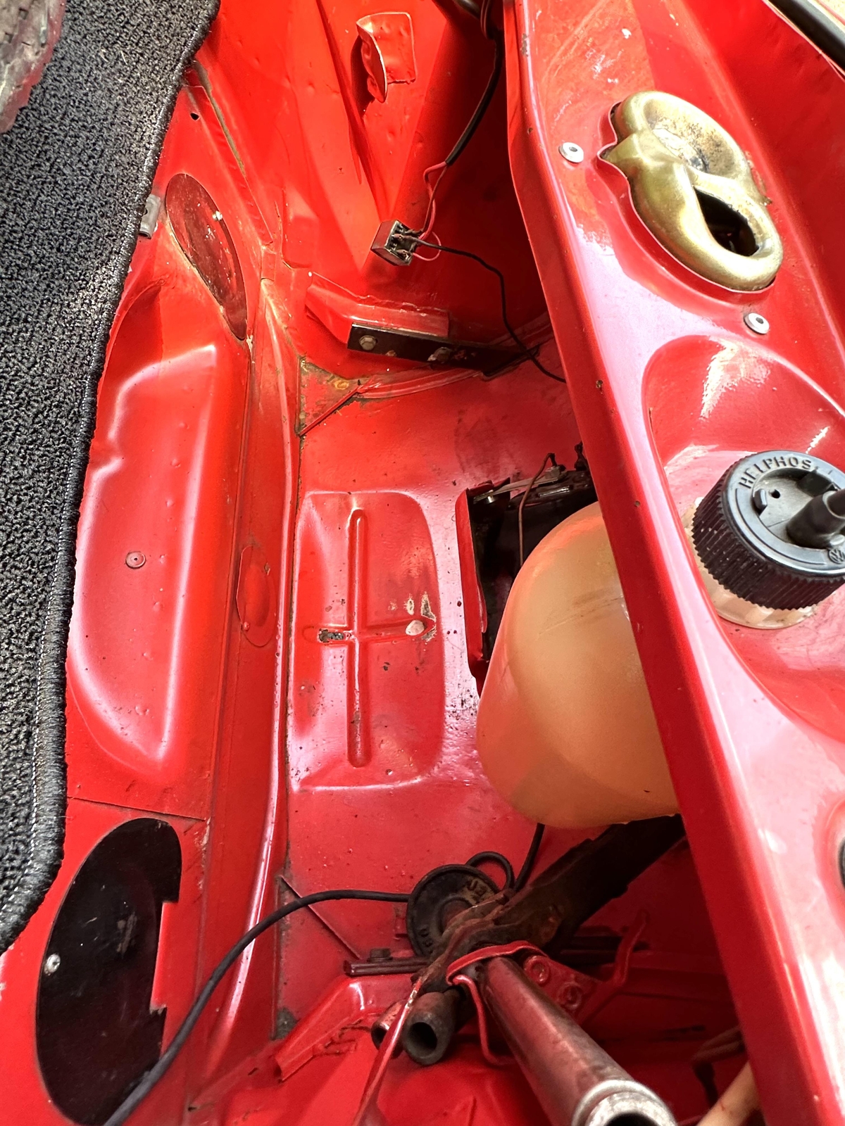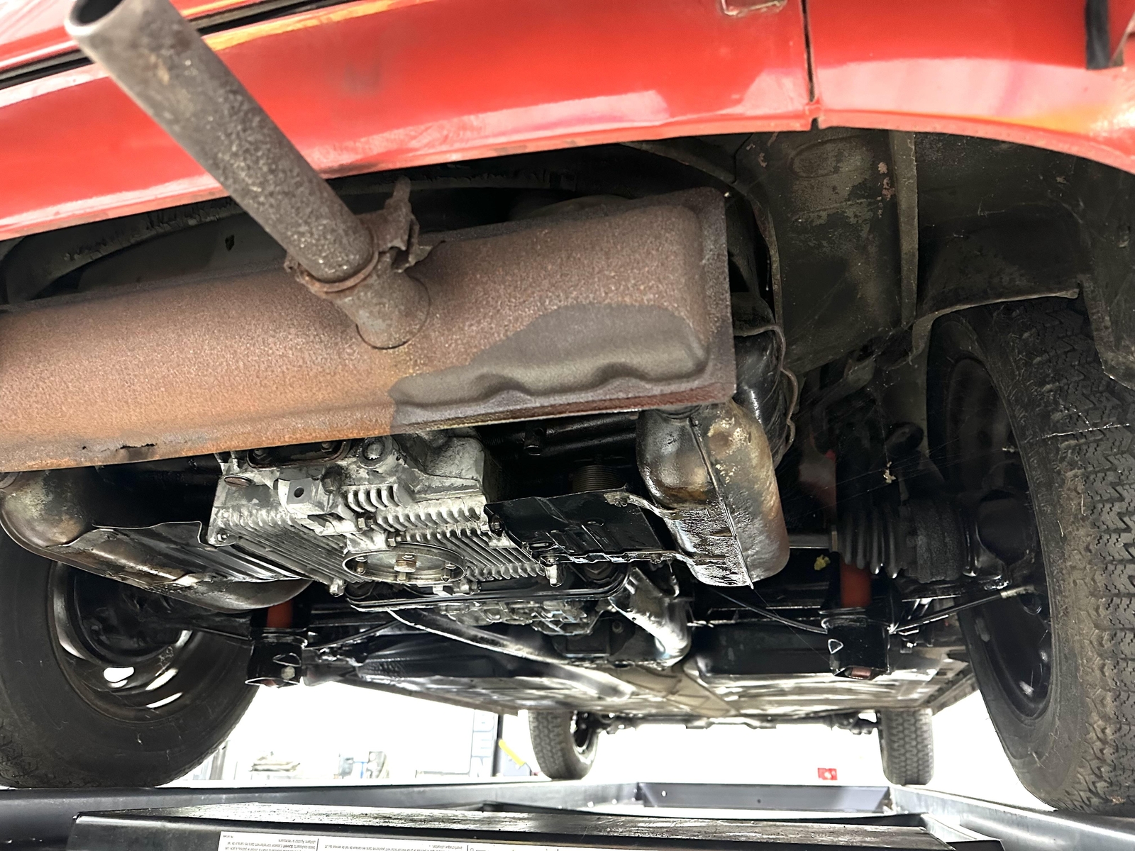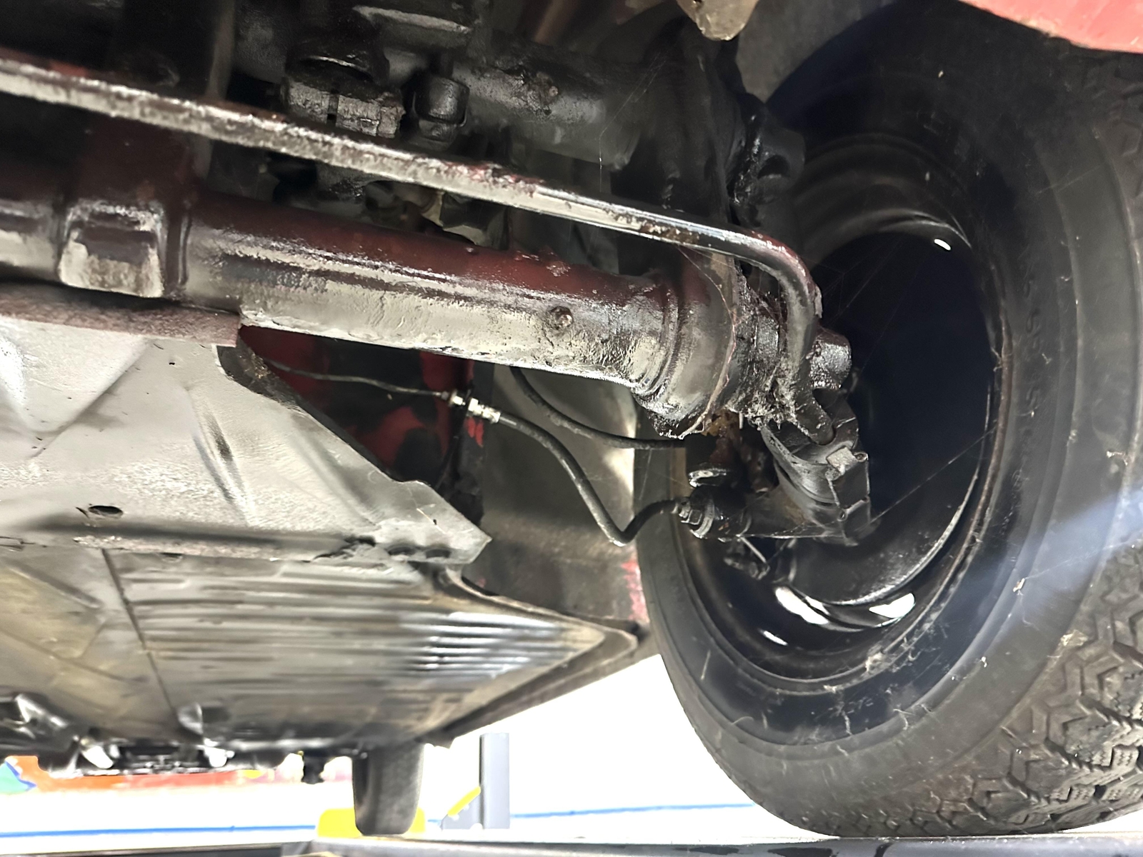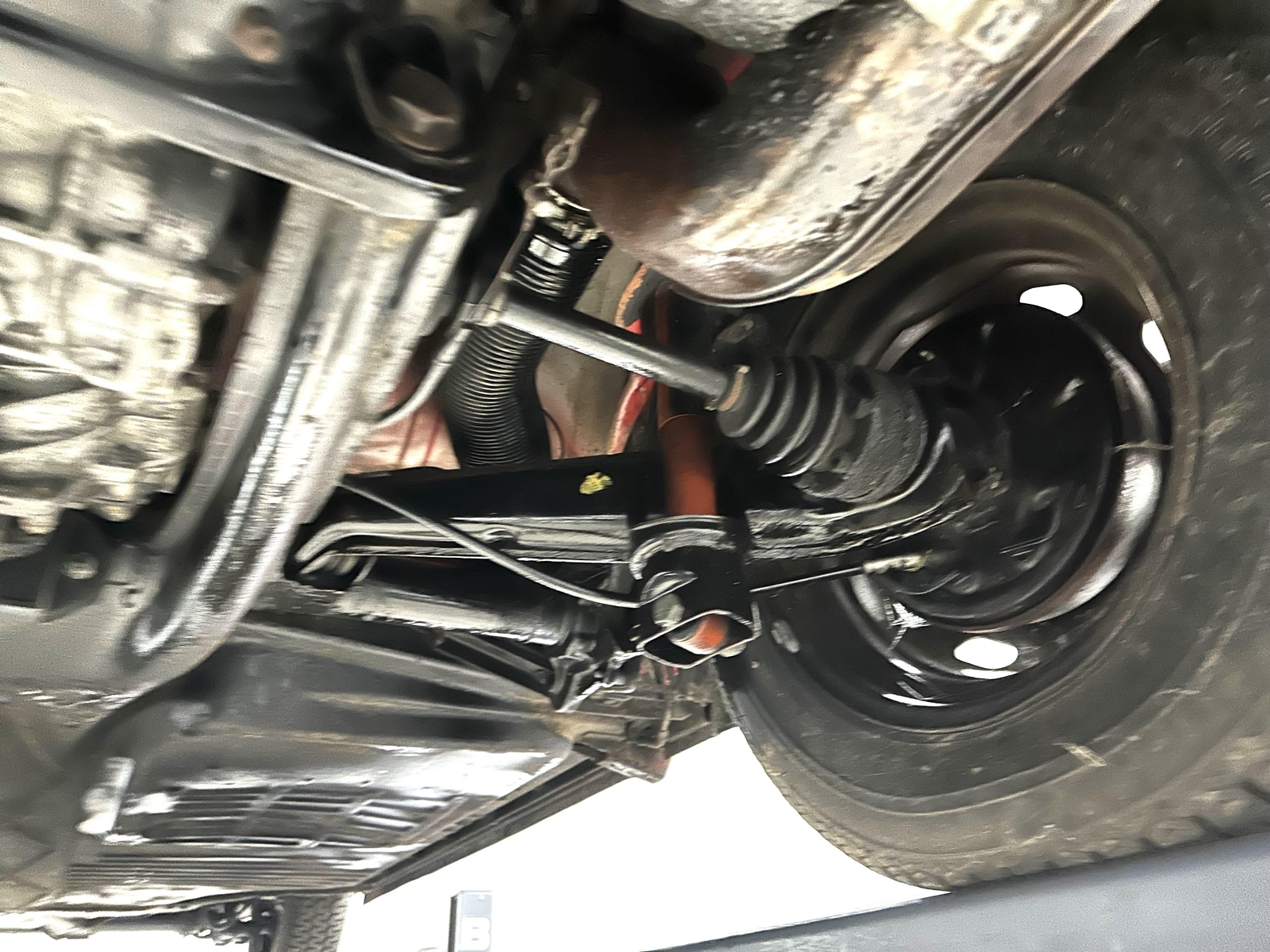 This car is exceptionally solid throughout, reflecting its origins in California and its recent garage-kept status. The pinch welds are dry and appear original, indicating the car's structural integrity. The suspension is fully intact and appears to be in good working condition.
