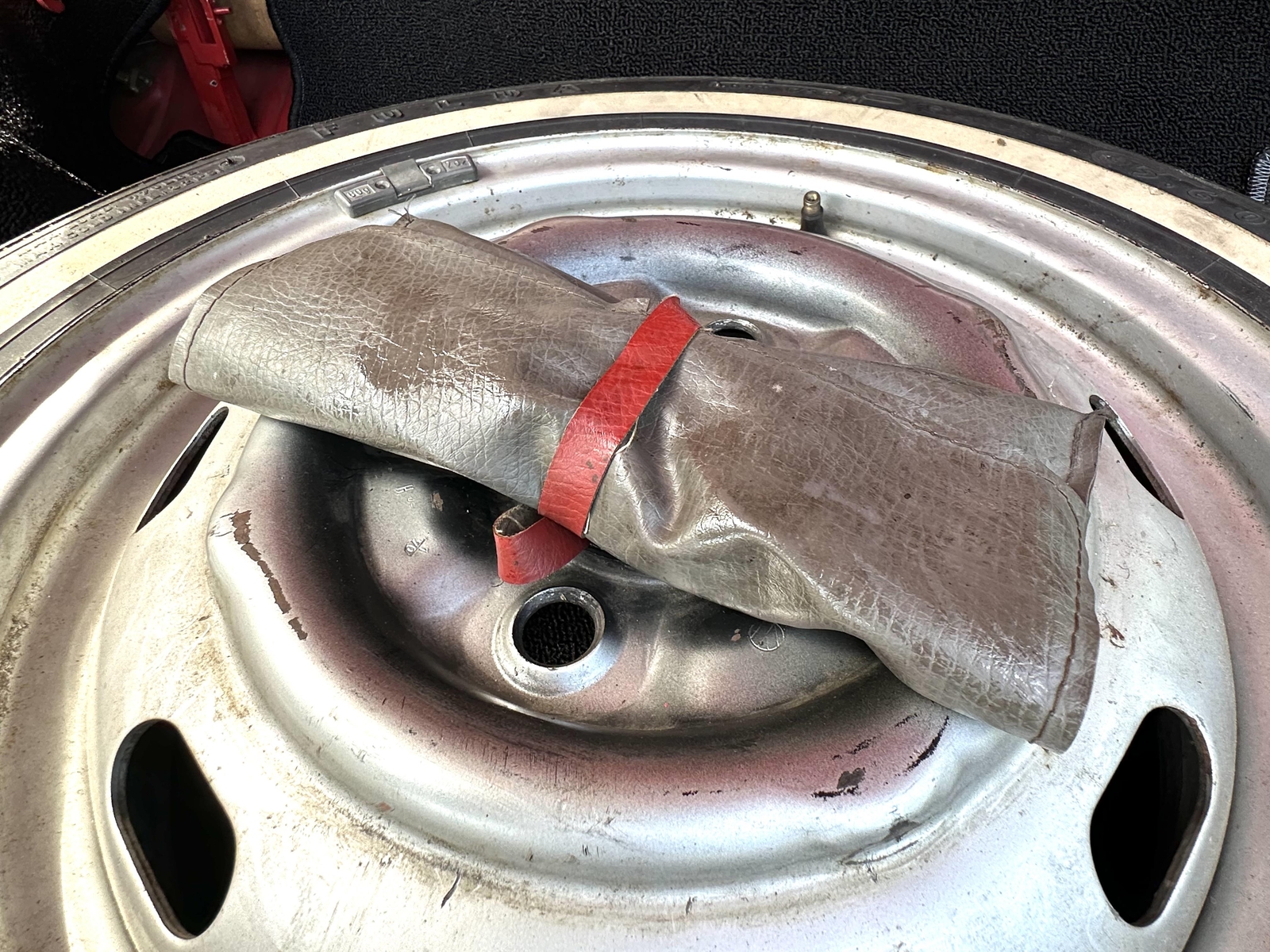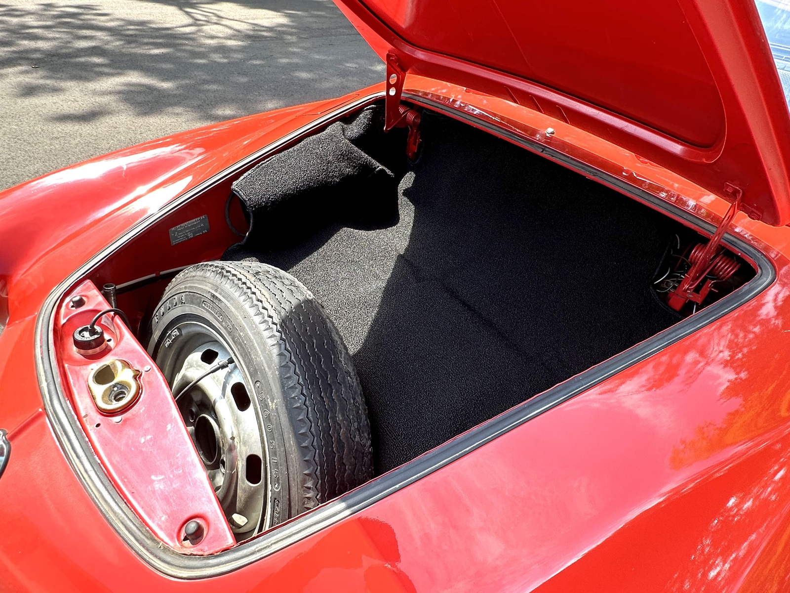Moving to the trunk area, it is clean and features a new carpet mat. The spare tire basin is dry, and the original spare tire and tool kit are included, completing the package nicely.
