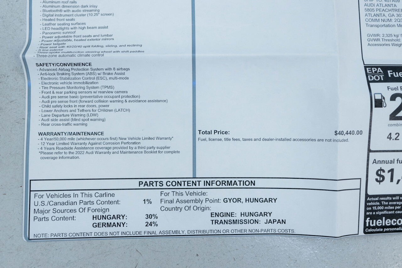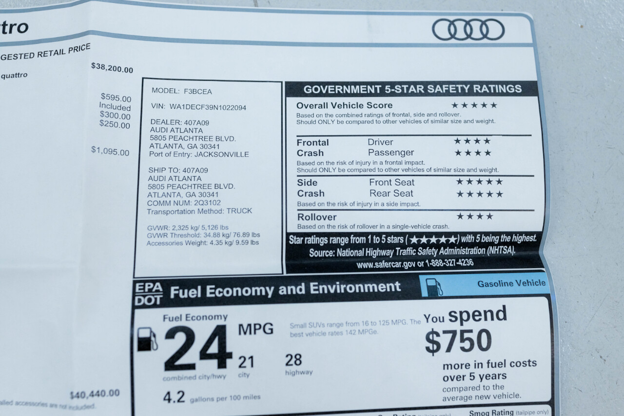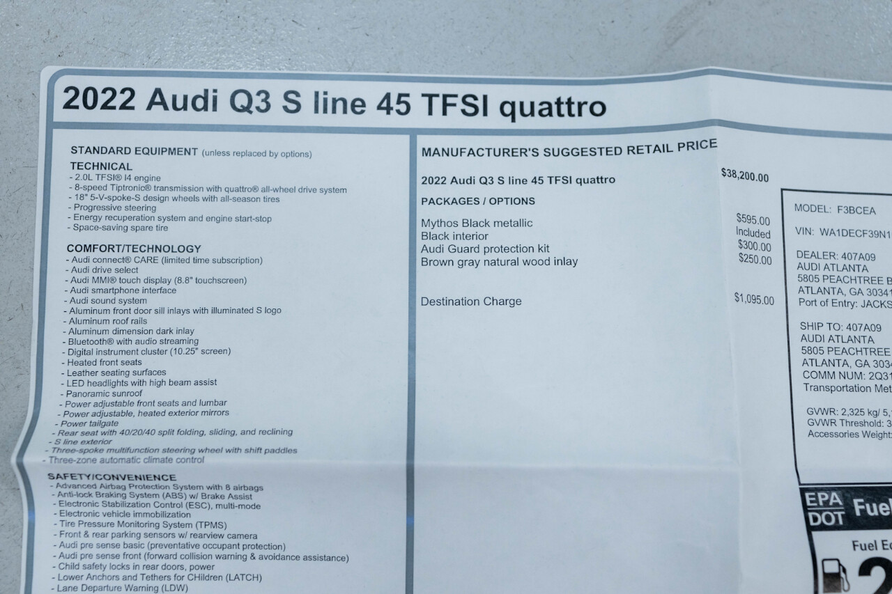 FULL HIGH RESOLUTION PHOTOS AND DETAILED DESCRIPTION ON YOU HAVE A VEHICLE YOU ARE LOOKING TO SELL, PLEASE CALL US AT 770-455-8494WE SHOW VEHICLES BY APPOINTMENT ONLY. PLEASE CALL TO SCHEDULE AN APPOINTMENT IN ORDER TO VIEW A LISTING IN PERSON.NEW ARRIVAL!! QUALIFIES FOR CERTIFIED EXTENDED WARRANTY, PLEASE INQUIRE FOR MORE DETAILS! LOCALLY OWNED, WELL MAINTAINED AUDI Q3 S-LINE PREMIUM! COMES WITH BOOKS, MANUALS, RUBBER TRUNK MAT, AND ORIGINAL WINDOW STICKER. $40,440 ORIGINAL MSRP!!EXTERIOR IS FINISHED IN MYTOS BLACK METALLIC OVER BLACK LEATHER INTERIOR.FACTORY OPTIONS AND FEATURES INCLUDE:2.0L TURBOCHARGED INLINE 4 CYLINDER ENGINEAUTOMATIC TRANSMISSIONQUATTRO ALL WHEEL DRIVE5 STAR DESIGN WHEELSAUDI GUARD PROTECTION KITBROWN GRAY NATURAL WOOD INLAYPANORAMIC ROOFPOWER TAIL GATEHEATED FRONT SEATSBACKUP CAMERAAUDI SIDE ASSISTAND MORE.GAS MOTORCARS IS A FAMILY OWNED AND OPERATED CAR DEALERSHIP LOCATED IN MARIETTA, GA. WE ONLY SELL VEHICLES OF THE HIGHEST QUALITY. WE SHIP VEHICLES WORLDWIDE AT THE BUYER'S EXPENSE. WE TAKE CONSIGNMENTS AS WELL AS TRADES.WE SHOW VEHICLES BY APPOINTMENT ONLY.PLEASE CALL AHEAD TO SCHEDULE A DATE AND TIME IN ORDER TO VIEW A LISTING IN PERSON.CONNECT WITH US ON INSTAGRAM @GASMOTORCARSIt is the customers sole responsibility to verify the existence and condition of any equipment listed. Neither the dealership nor DealerCarSearch is responsible for misprints on prices or equipment. It is the customers sole responsibility to verify the accuracy of the prices with the dealer, including the pricing for all added accessories. Visit Gas Motorcars online at to see more pictures of this vehicle or call us at770-455-8494 today to schedule your test drive.