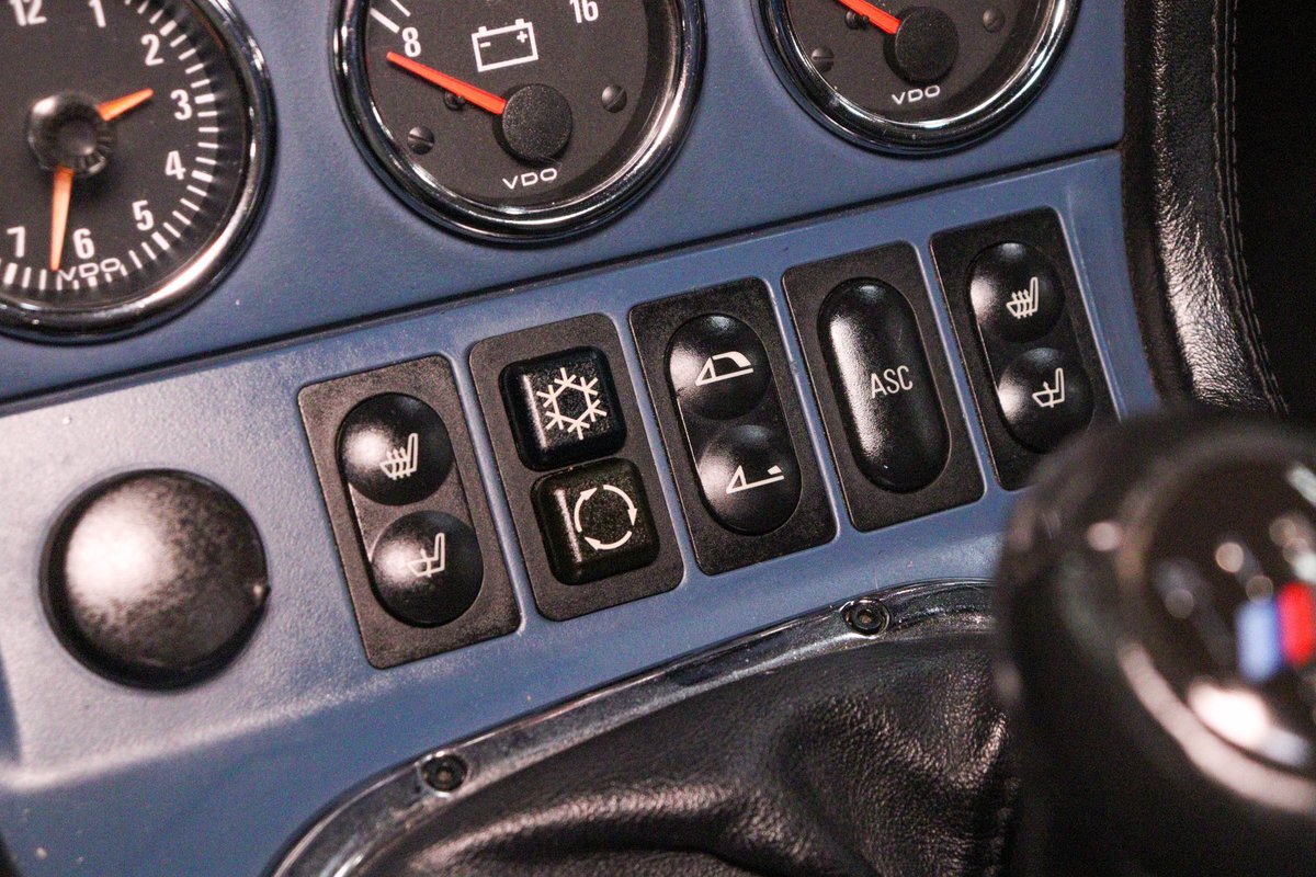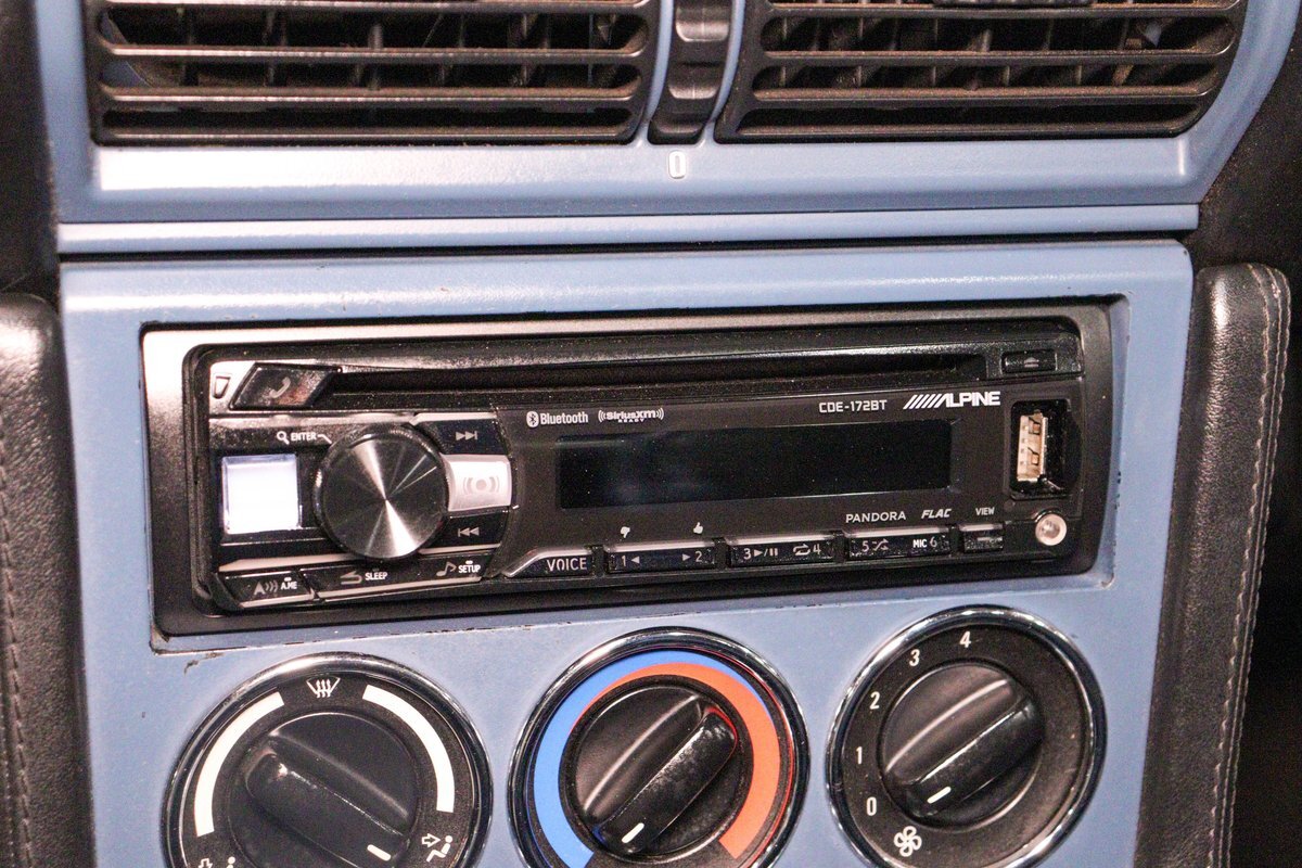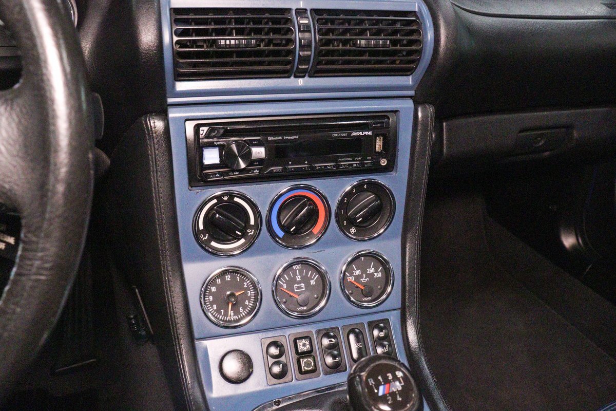 Inside, the M Roadster features a unique blue/black two-tone leather interior that perfectly complements the exterior paint. The heated seats add a touch of comfort for those cooler drives, while the power soft top allows for effortless open-air motoring. The cabin is further enhanced by the aftermarket Alpine single DIN radio with AM/FM and Bluetooth compatibility, ensuring you stay connected and entertained on the go.