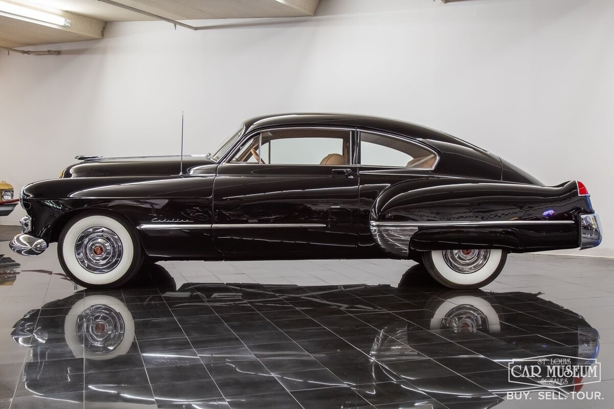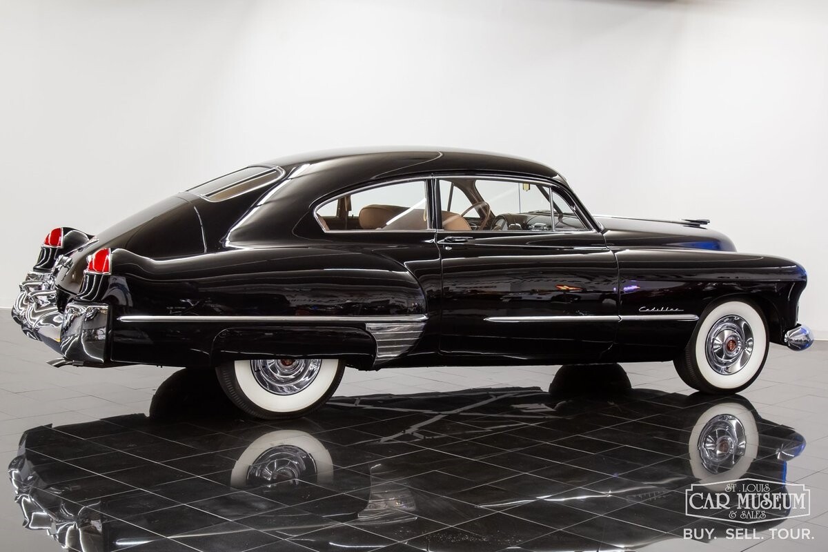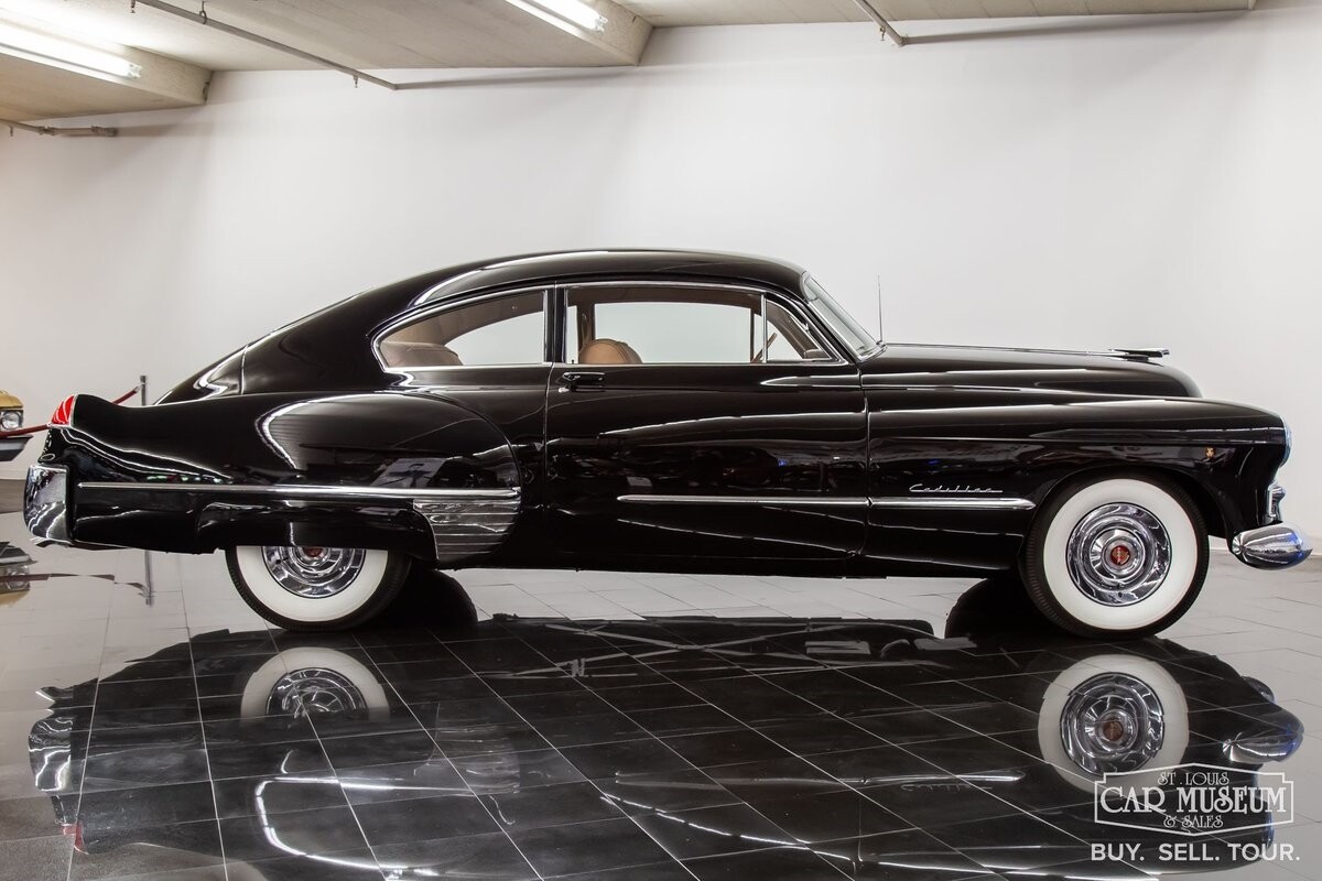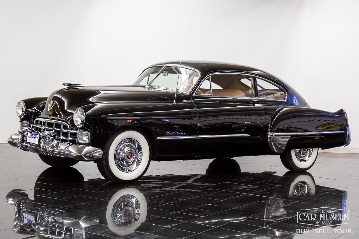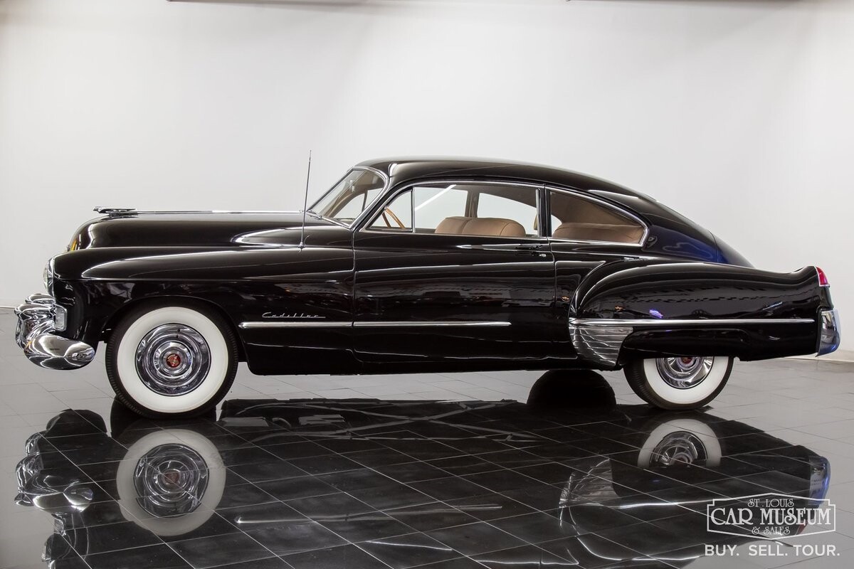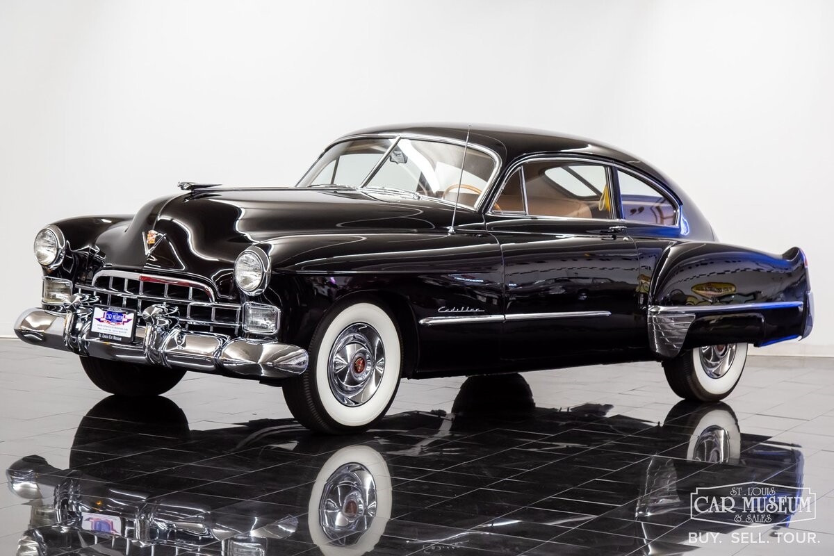 We are delighted to offer this beautifully restored 1948 Cadillac Series 61 Club Coupe, also referred to as the Sedanette Fastback by enthusiasts, finished in gorgeous high gloss Black over Tan dual cord broadcloth! Still powered by its original, factory issued 346ci V8 producing 150 horsepower and 283 ft lobs of torque through a Hydra-Matic transmission and 3.77:1 rear axle gearing. Features and accessories include working AM pushbutton radio, heater/defrost, working electric dash clock, rear assist handles, courtesy map light, carpeted front floor mats, cigar lighter, day/night Glareproof mirror, windshield washer system, locking glovebox, reverse light, fender skirts, stainless fender guards, full chrome wheel covers, Auburn Deluxe 8.20R15 tubeless radial wide whitewall tires, and engine oil filtration system.