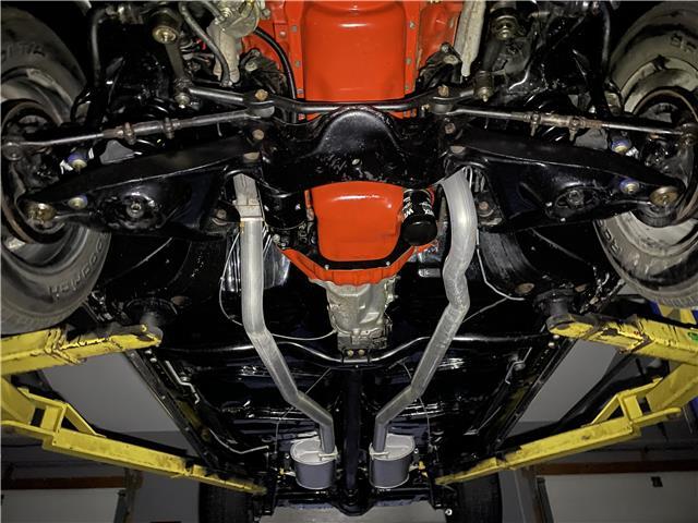 The undercarriage is all clean metal that appears to be all original. The front end suspension looks good and appears to be all new. The bottom of the motor is clean and the Muncie M20 4-speed transmission is clean. It has a 12 bolt rear end with 3:31 gears, new gas tank and straps, dual FlowMaster exhaust system that dumps out behind the rear wheel and sounds very aggressive.