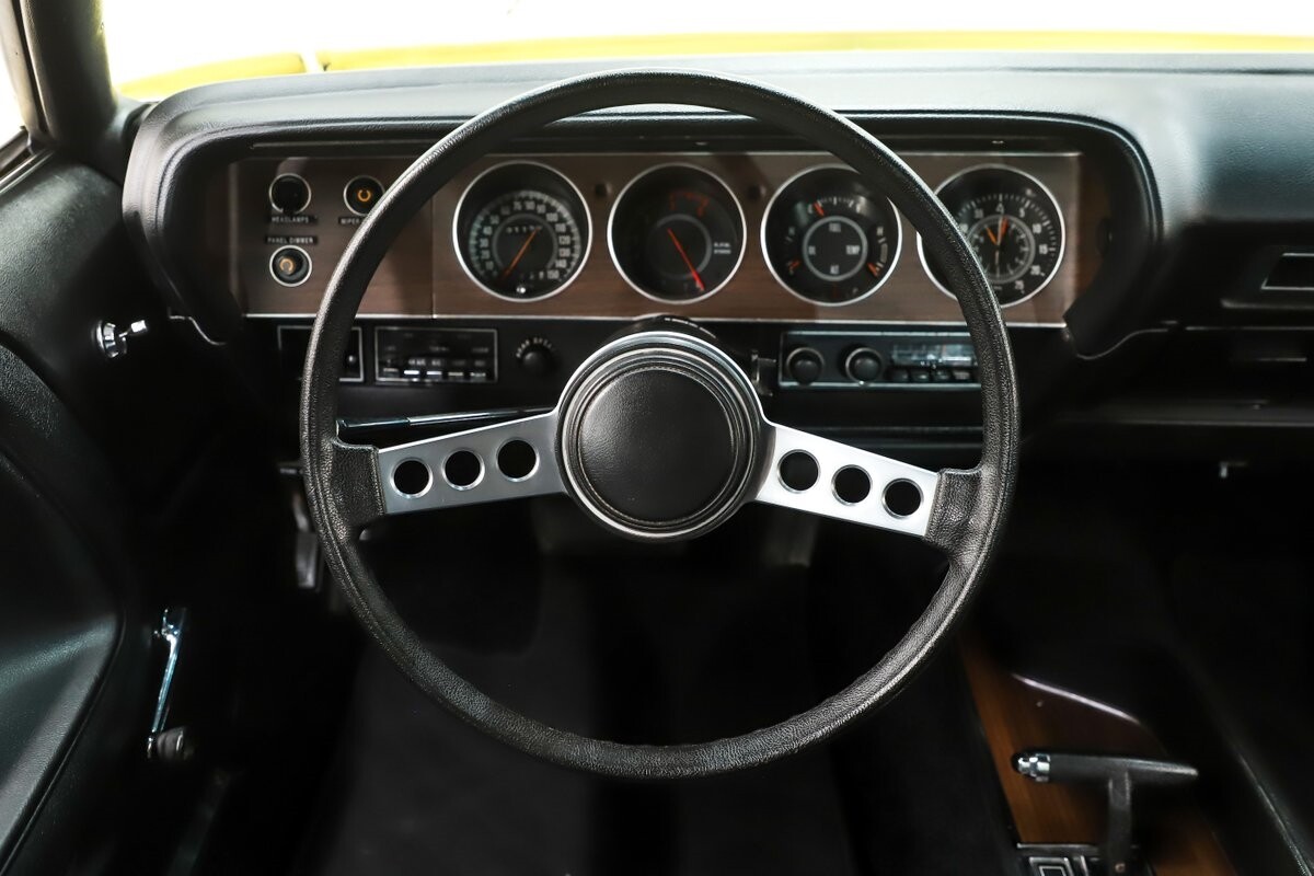 EXTERIOR: This is a sexy looking car! Great lines, eye popping color and stripes. The fit and finish is amazing, it is really straight. The panels fit precisely, I don't see any rust or damage. Factory the power bulge scooped hood and sport mirrors. The Top Banana Yellow paint is polished smooth like glass. Cool looking strobe stripe decals on each side. The vinyl top is replaced. All the glass is new. Up front the grill is restored, bumper, bezels, rubber fillers are mint. The rear bumper is new. The jambs are painted slick, weather strips and seals were replaced.