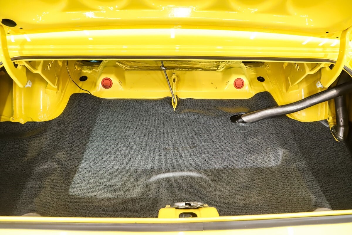 TRUNK COMPARTMENT: Under the trunk lid and jamb are glossy. Clean metal inside, no rust or patches that I found. It's all been painted yellow. New mat, weatherstrip, and seat insulation.