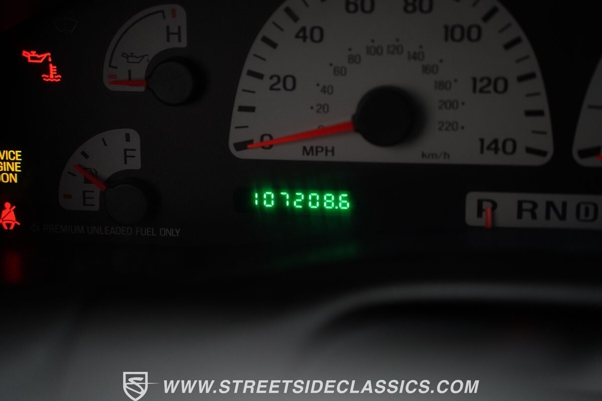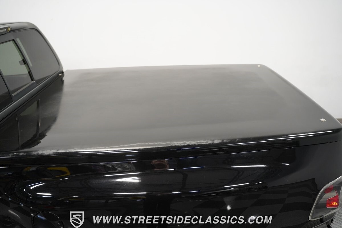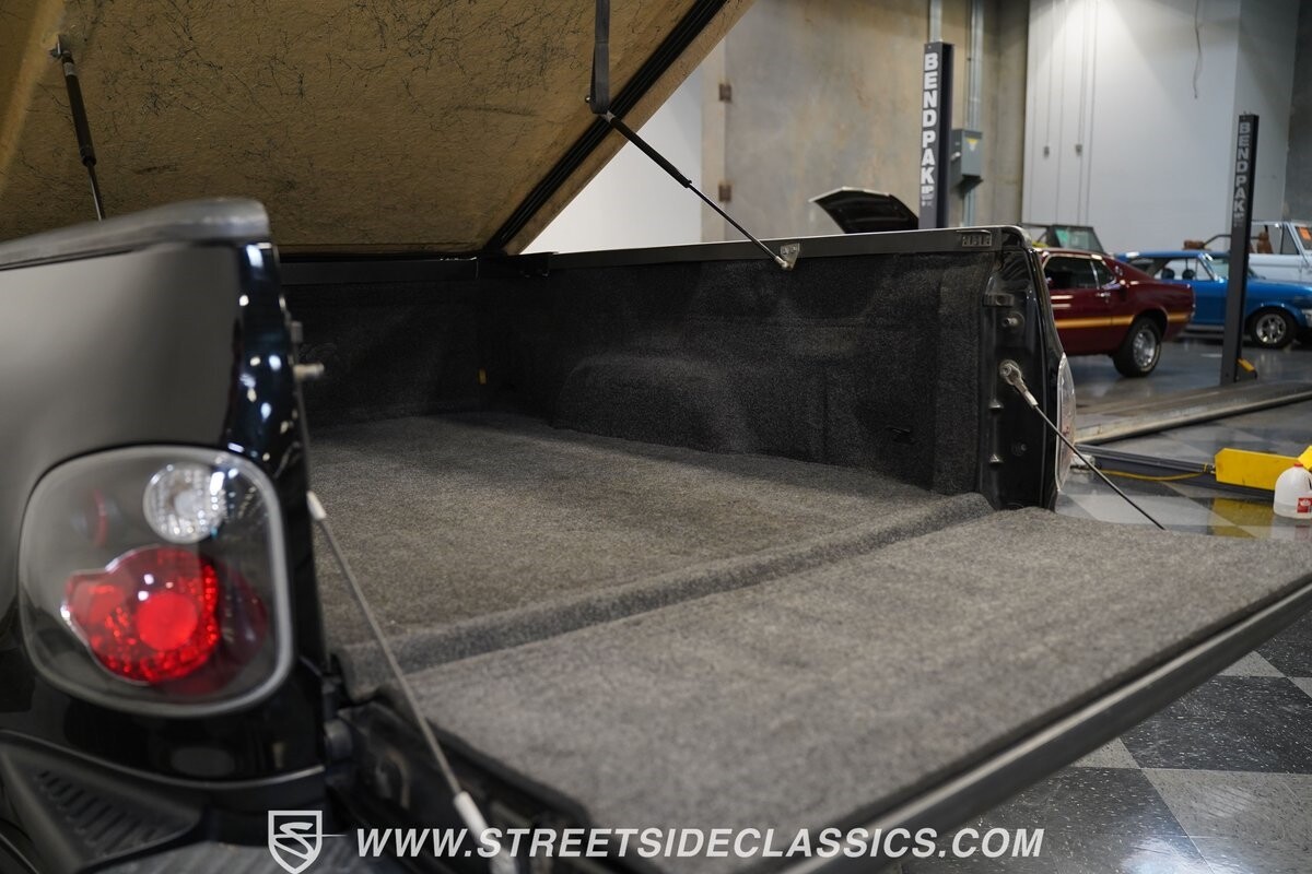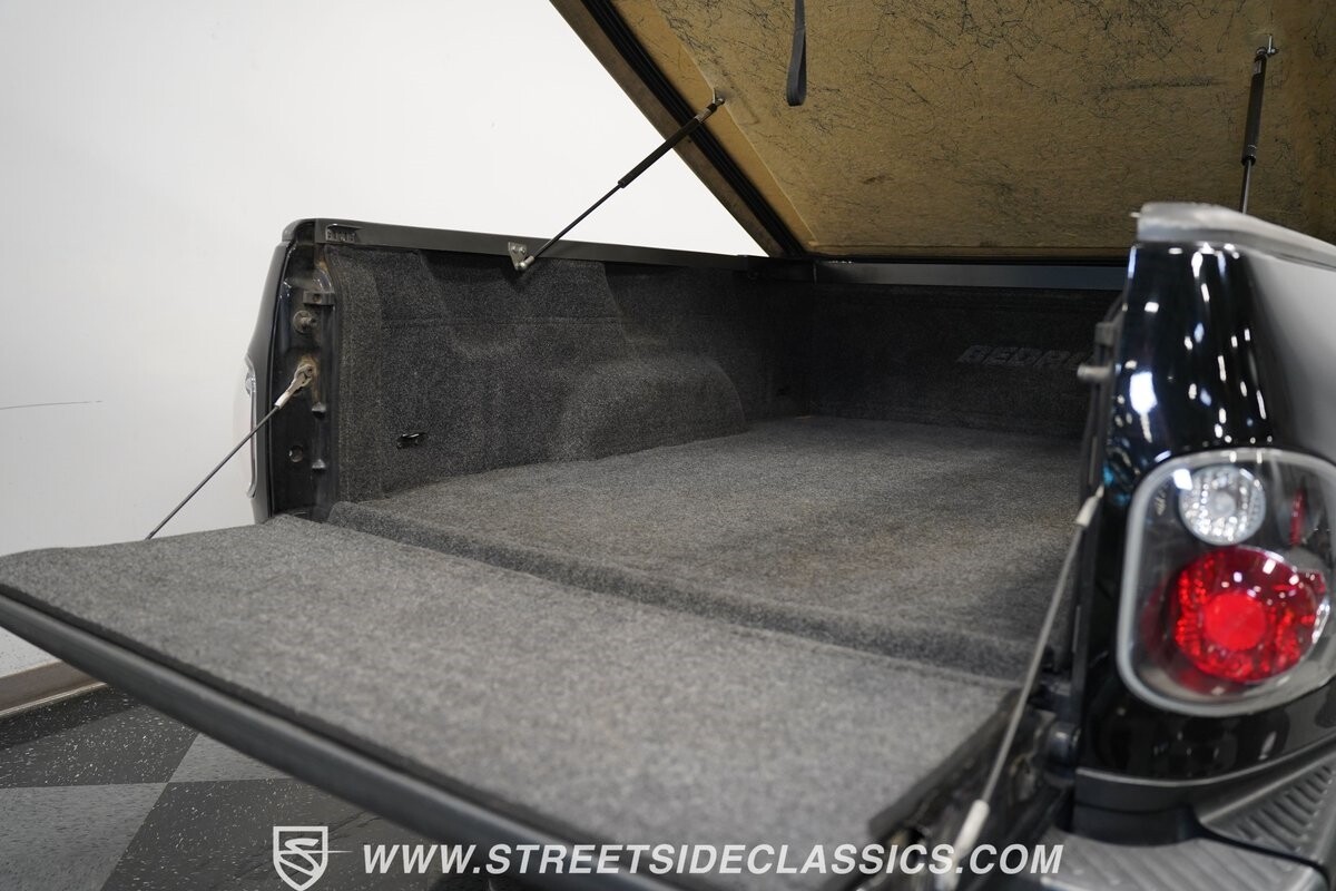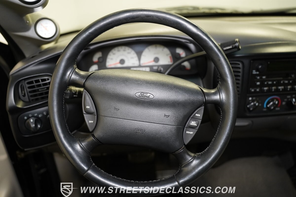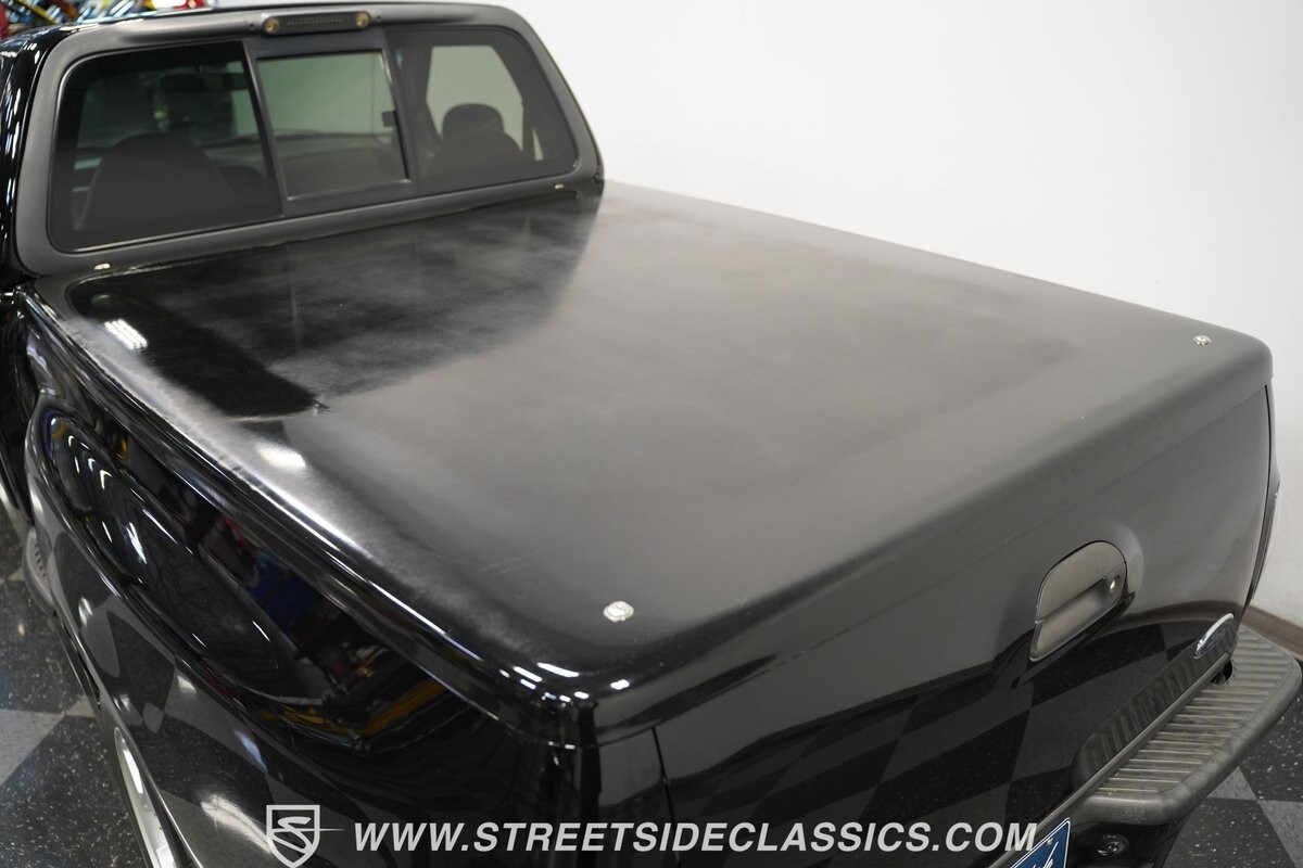 Inside the cab of this black beast, where the Medium Graphite cloth bucket seats beckon, offering a stark contrast to the ominous exterior. The well-preserved stock dash and headliner whisper tales of thrilling drives past and those yet to come. Every detail, from the AM/FM stereo and CD Changer to the air conditioning and cruise control, and A-pillar aux readouts, is meticulously designed for control and comfort. The power seats adjust to your will, while the anti-theft system stands guard, ensuring this Lightning strikes only when you command it.