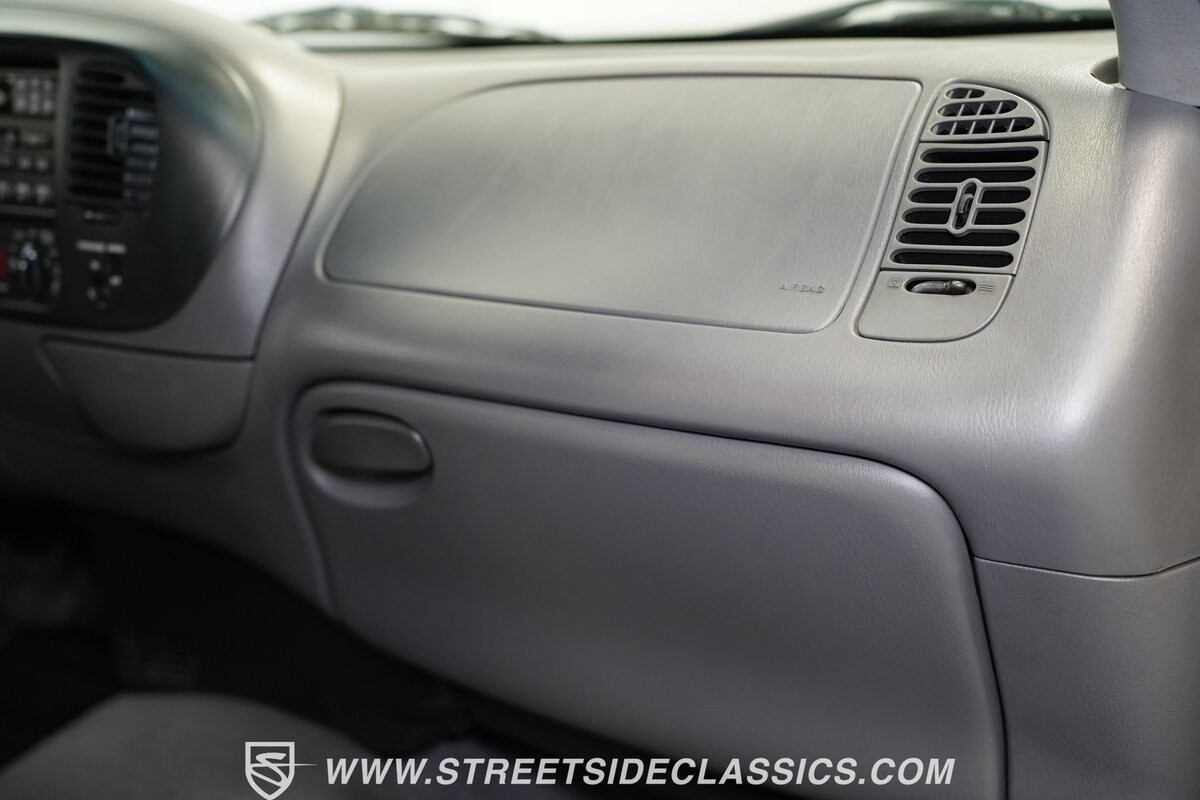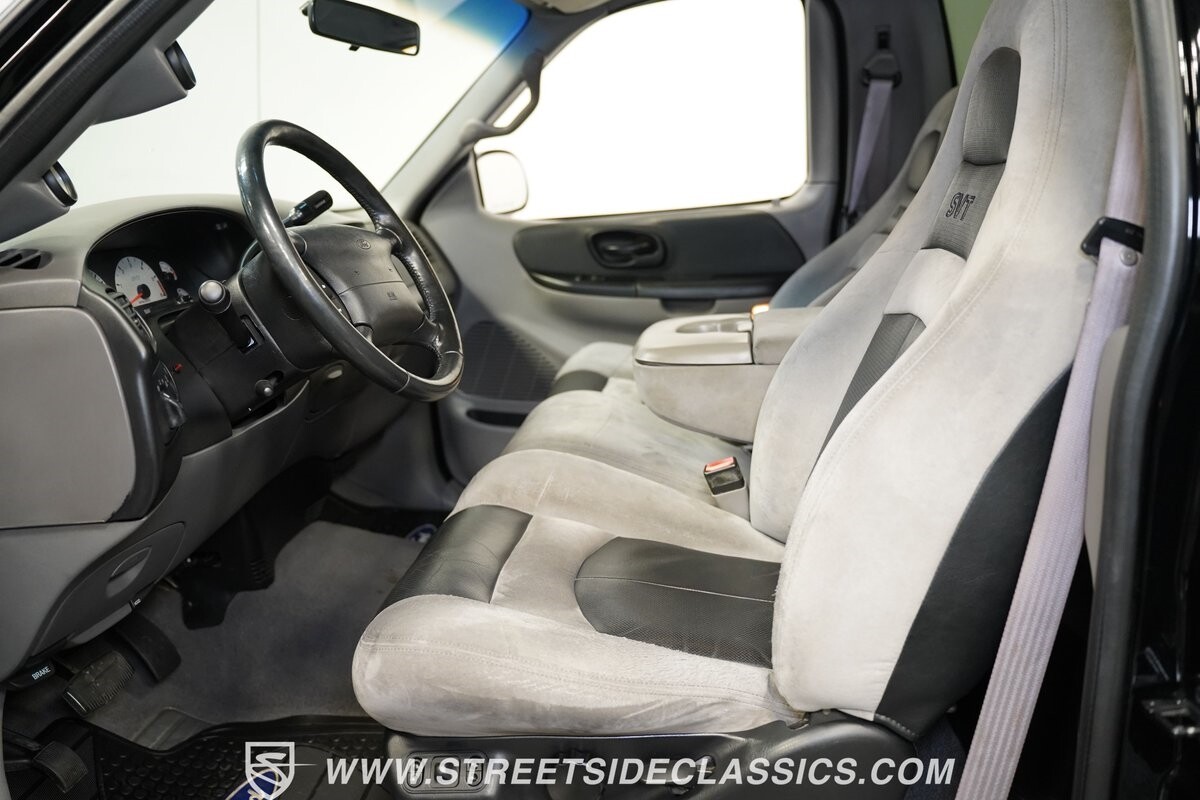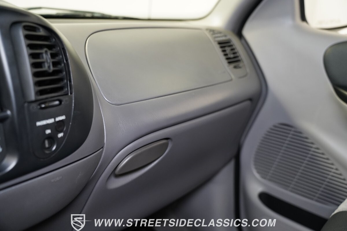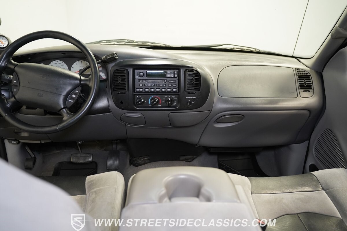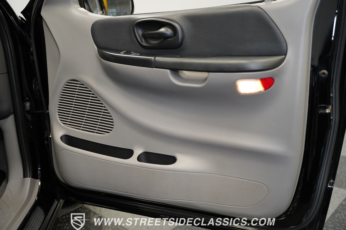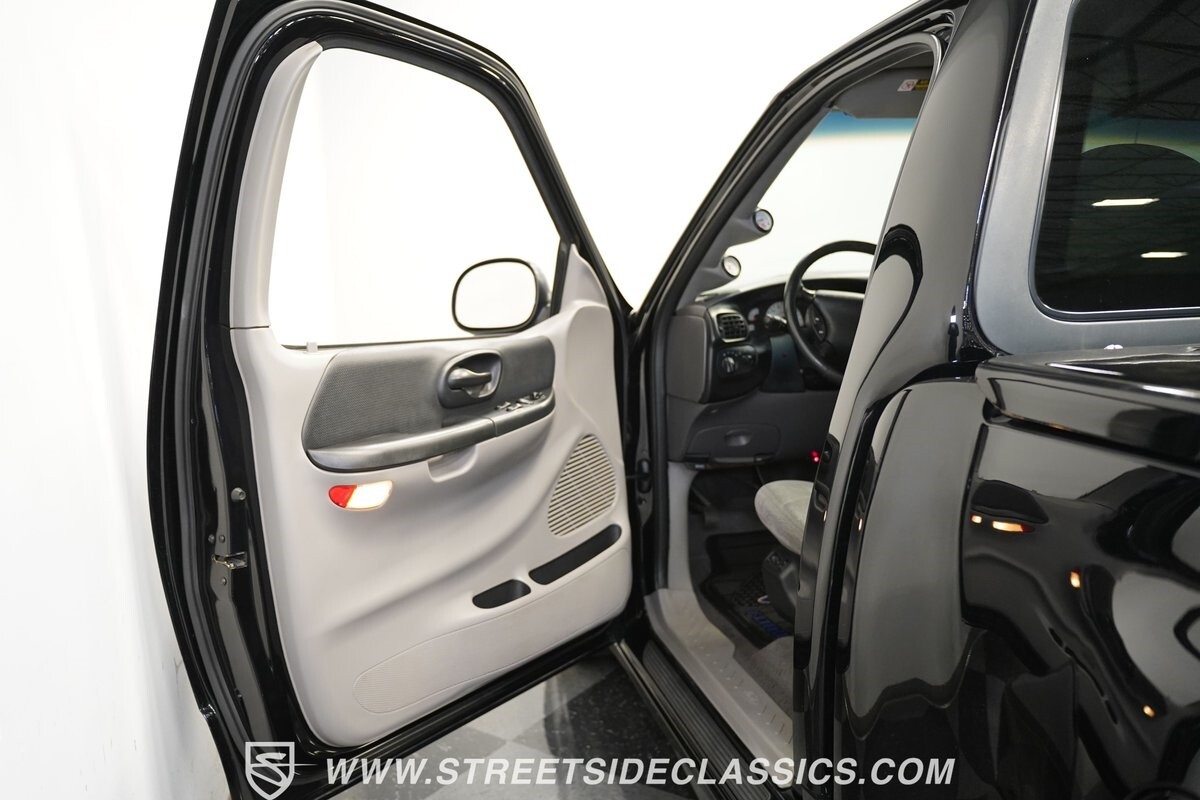 Inside the cab of this black beast, where the Medium Graphite cloth bucket seats beckon, offering a stark contrast to the ominous exterior. The well-preserved stock dash and headliner whisper tales of thrilling drives past and those yet to come. Every detail, from the AM/FM stereo and CD Changer to the air conditioning and cruise control, and A-pillar aux readouts, is meticulously designed for control and comfort. The power seats adjust to your will, while the anti-theft system stands guard, ensuring this Lightning strikes only when you command it.