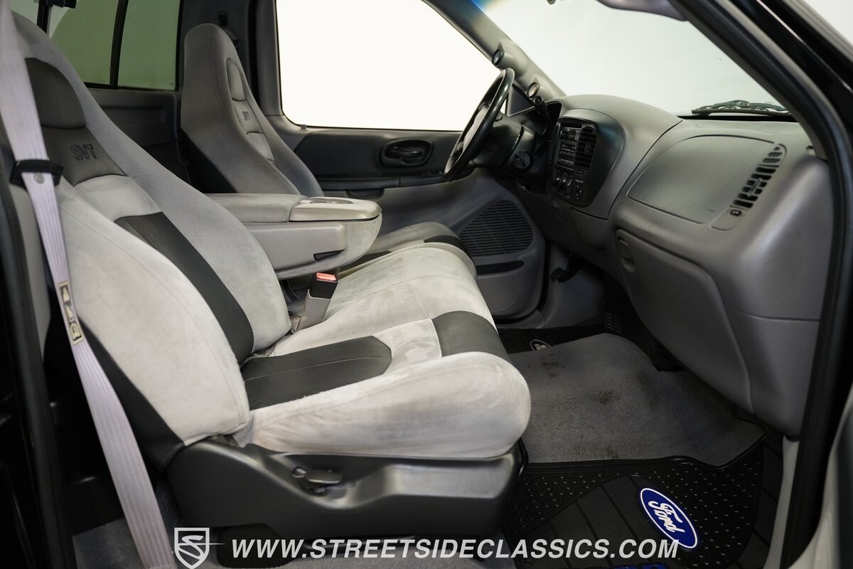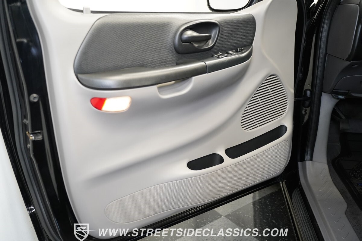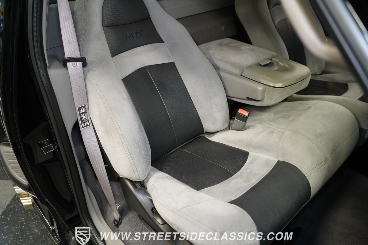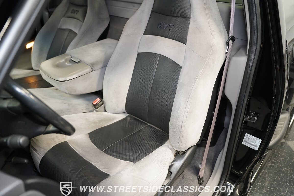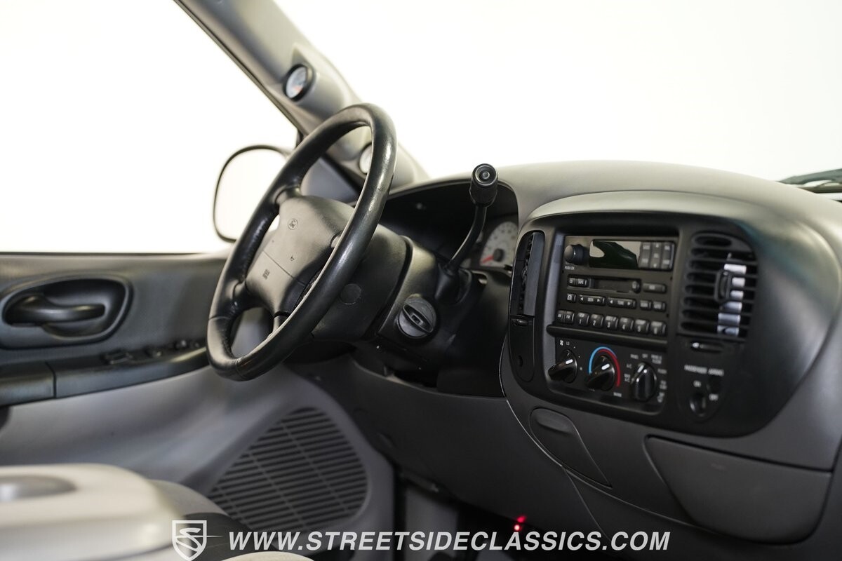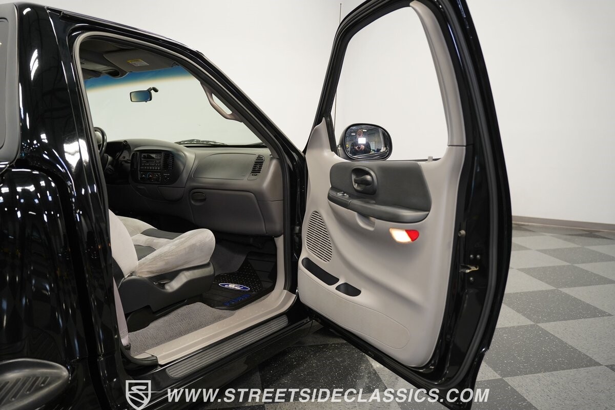Inside the cab of this black beast, where the Medium Graphite cloth bucket seats beckon, offering a stark contrast to the ominous exterior. The well-preserved stock dash and headliner whisper tales of thrilling drives past and those yet to come. Every detail, from the AM/FM stereo and CD Changer to the air conditioning and cruise control, and A-pillar aux readouts, is meticulously designed for control and comfort. The power seats adjust to your will, while the anti-theft system stands guard, ensuring this Lightning strikes only when you command it.