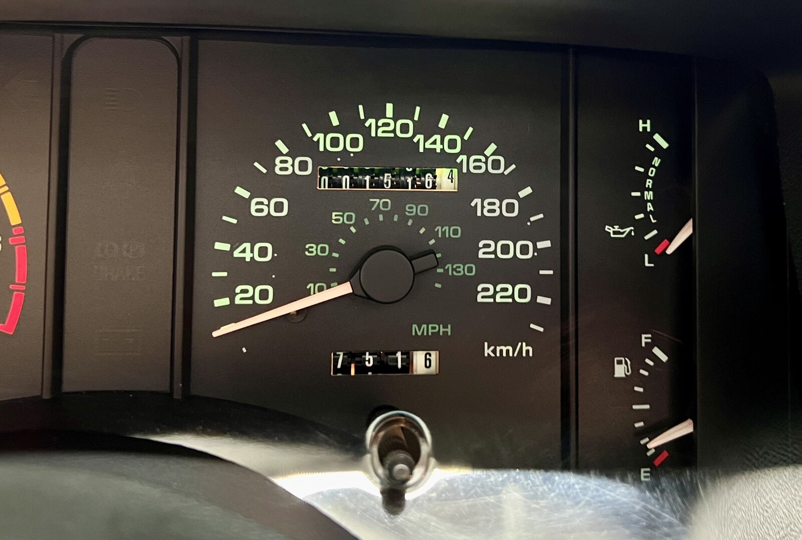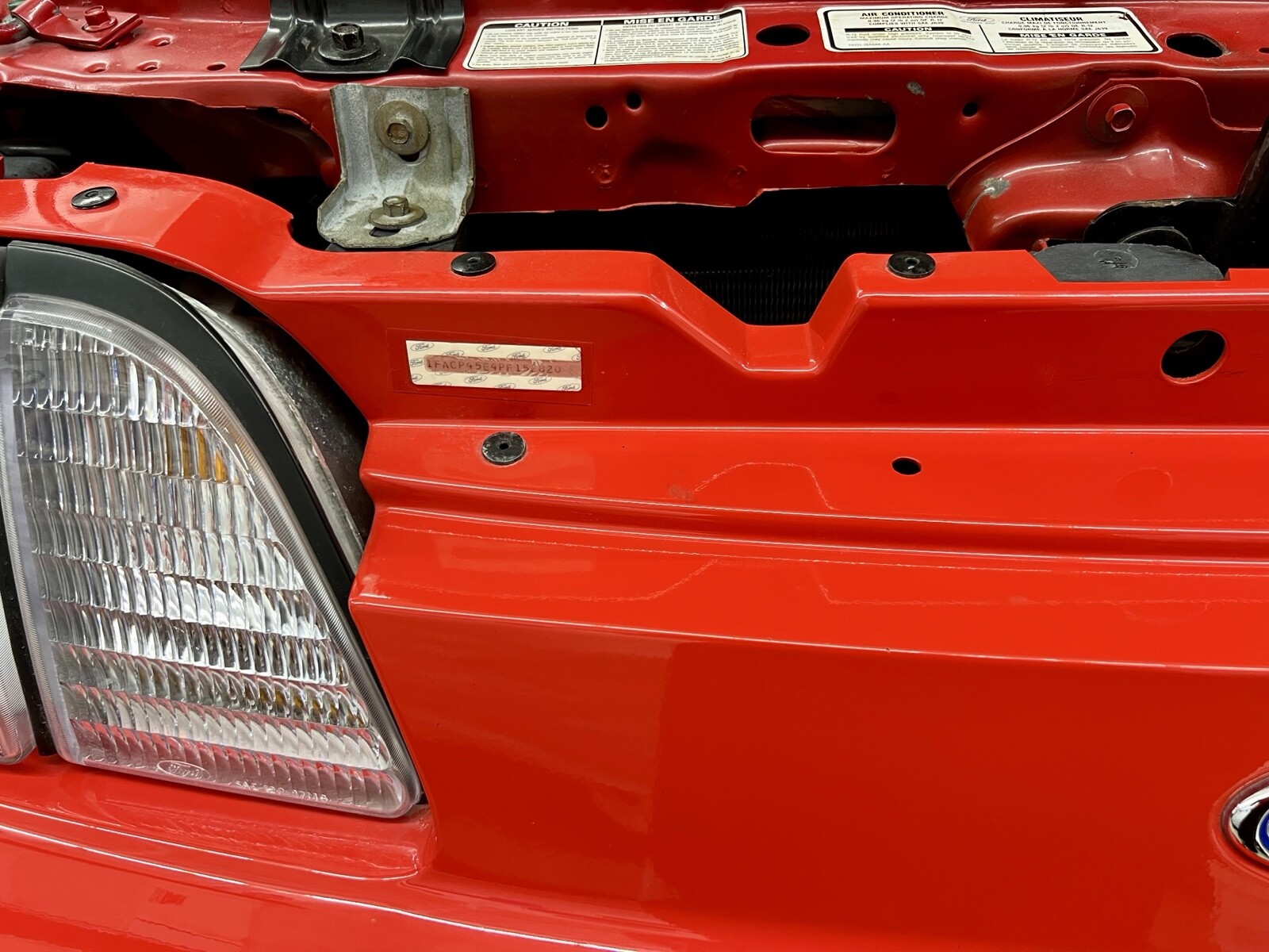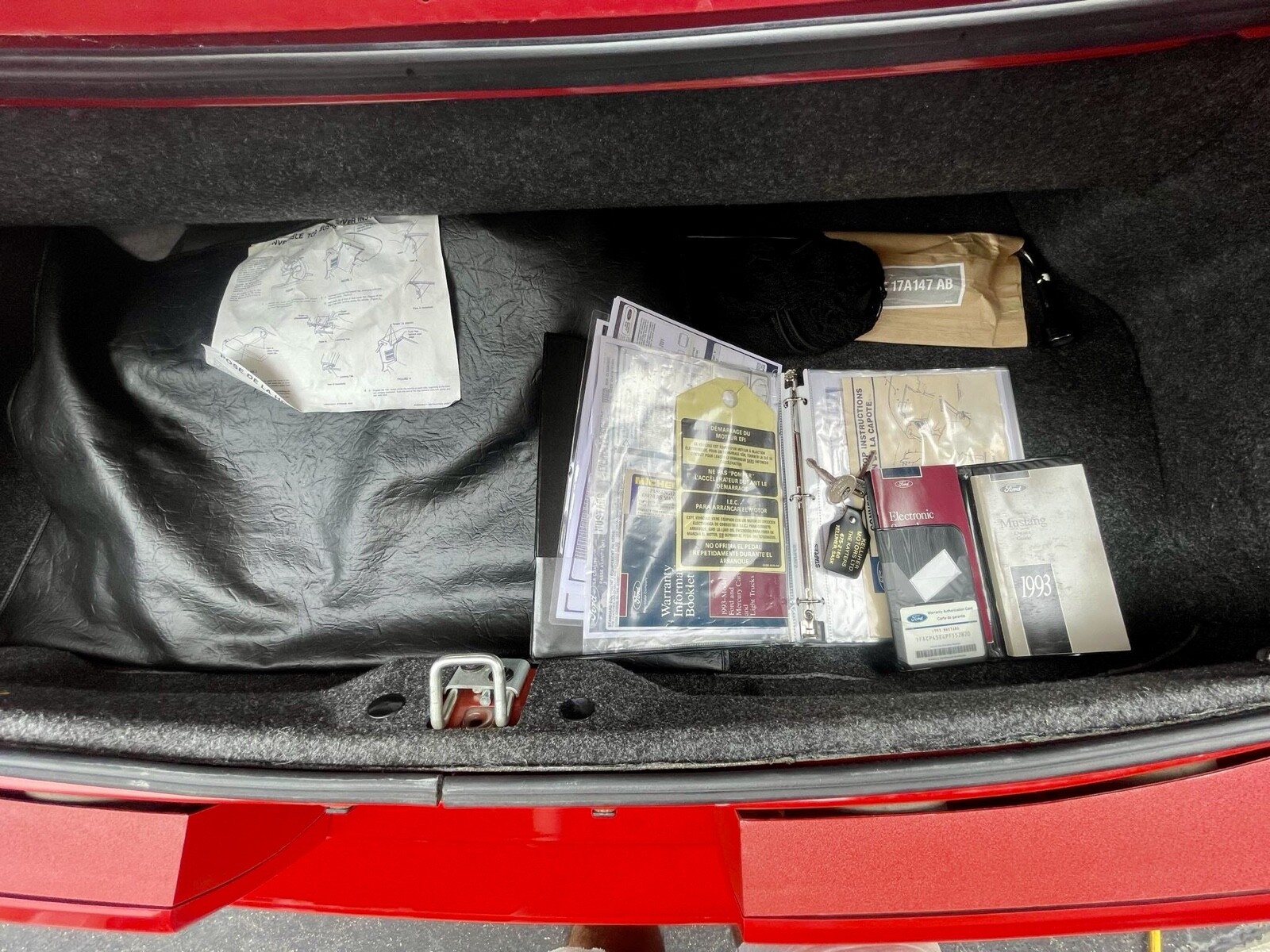 5.0 Automatic with 942 miles or 1516 kilometers. The color is ES Vibrant Red. The same color as the 1993 SVT Cobra. The car was delivered to the Canada Ford dealer in early 1993 where it was kept for most of its life and used at local parades. The dealer did replace the original tires do to there age. So it does have newer tires and battery. It comes with the original window sticker and owners manual.