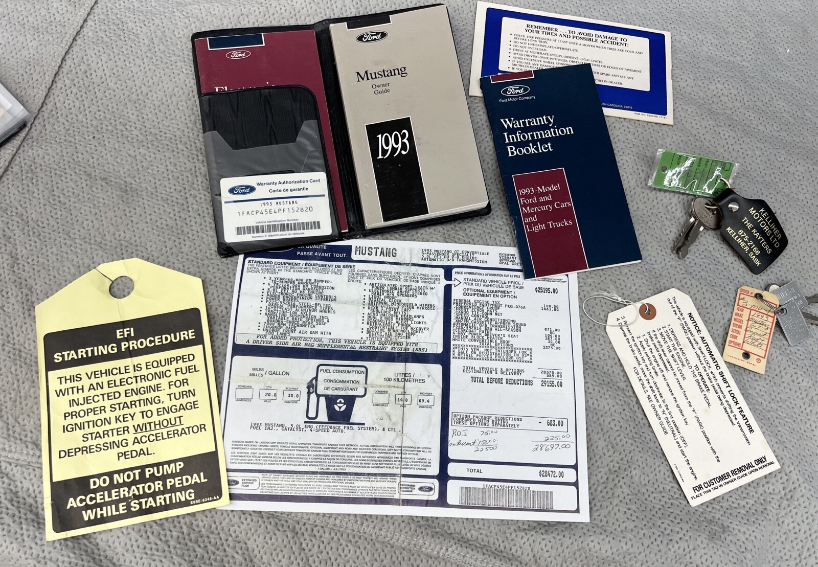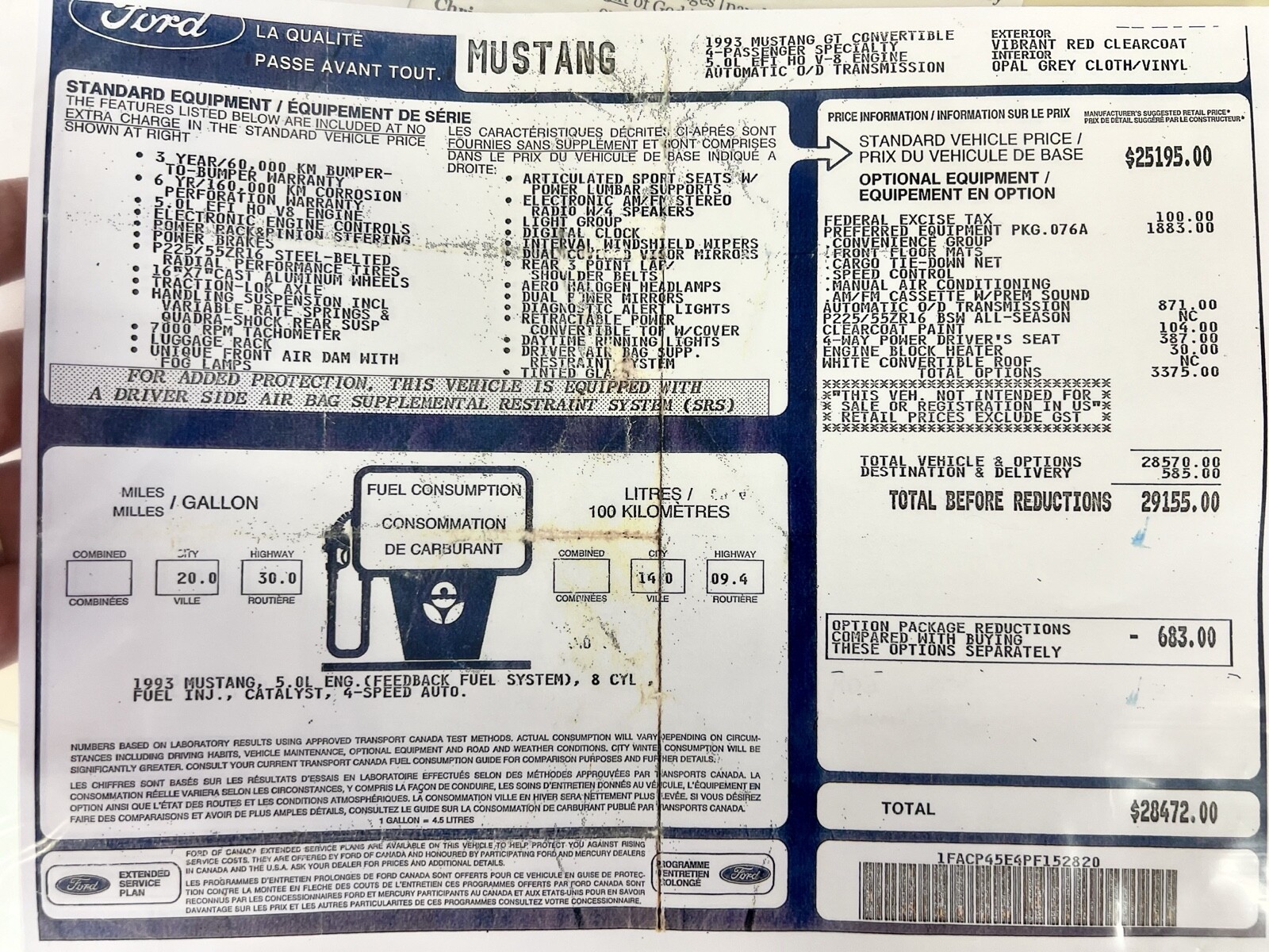 1993 Ford Mustang GT Convertible 5.0 Automatic with 942 miles or 1516 kilometers. The color is ES Vibrant Red with Opal grey cloth. The same color as the 1993 SVT Cobra. The car was delivered to the Canada Ford dealer in early 1993 where it was kept for most of its life and used at local parades. The dealer did replace the original tires do to there age. So it does have newer tires and battery. It comes with the original window sticker and owners manual. I also have a 1993 coupe in Reef Blue that I am sellingSeller's Notes