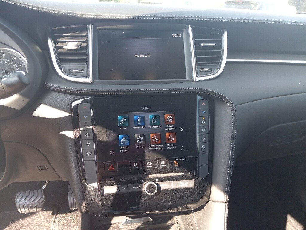 THIS VEHICLE INCLUDES THE FOLLOWING FEATURES AND OPTIONS: 4-Wheel Disc Brakes, 5.846 Axle Ratio, 6 Speakers, ABS brakes, Air Conditioning, Alloy wheels, AM/FM radio: SiriusXM, AM/FM/CD Audio System, Anti-whiplash front head restraints, Apple CarPlay/Android Auto, Auto High-beam Headlights, Automatic temperature control, Blind Spot Warning, Brake assist, Bumpers: body-color, CD player, Cruise Control, Delay-off headlights, Driver door bin, Driver vanity mirror, Dual front impact airbags, Dual front side impact airbags, Electronic Stability Control, Emergency communication system: INFINITI InTouch, Exterior Parking Camera Rear, Floor Mats, Four wheel independent suspension, Front anti-roll bar, Front Bucket Seats, Front Center Armrest, Front dual zone A/C, Front reading lights, Illuminated entry, Knee airbag, Leather Shift Knob, Leatherette Seat Trim, Literature Kit, Low tire pressure warning, Occupant sensing airbag, Outside temperature display, Overhead airbag, Overhead console, Panic alarm, Passenger door bin, Passenger vanity mirror, Power door mirrors, Power driver seat, Power Liftgate, Power passenger seat, Power steering, Power windows, Radio data system, Rear anti-roll bar, Rear Parking Sensors, Rear reading lights, Rear seat center armrest, Rear side impact airbag, Rear window defroster, Rear window wiper, Remote keyless entry, Security system, Speed-sensing steering, Splash Guards (Set of 4), Split folding rear seat, Spoiler, Steering wheel mounted audio controls, Tachometer, Telescoping steering wheel, Tilt steering wheel, Traction control, Trip computer, Turn signal indicator mirrors, Variably intermittent wipers, and Wheels: 19 x 7.5J Silver Painted Alloy.