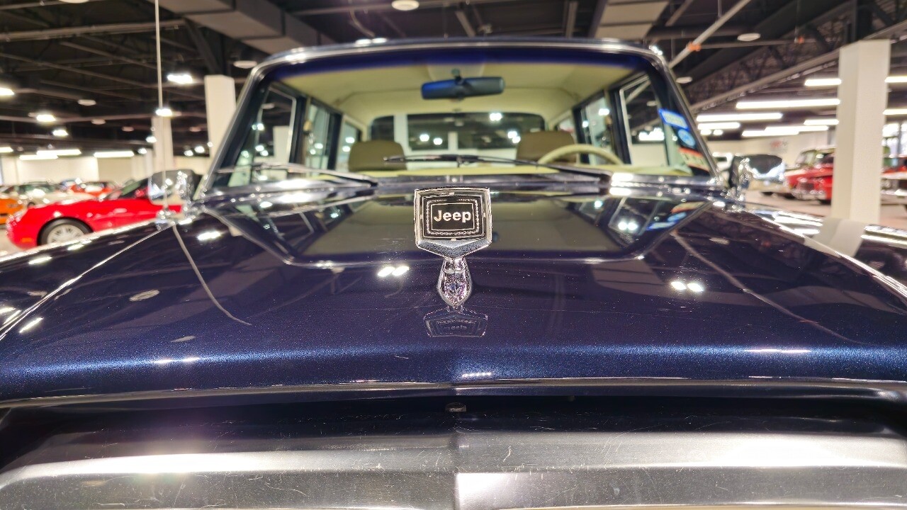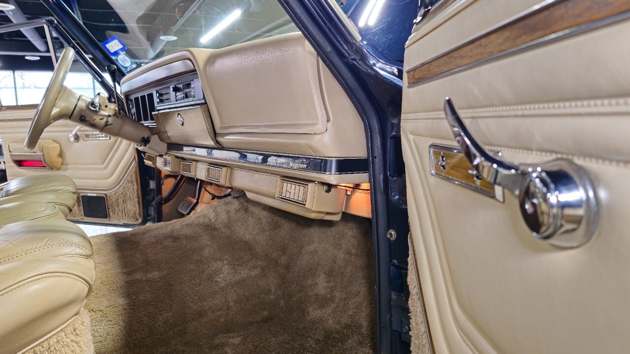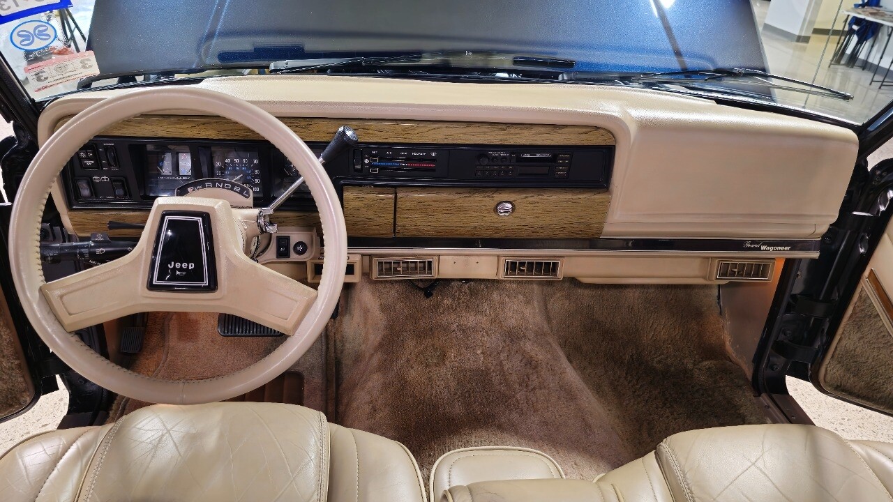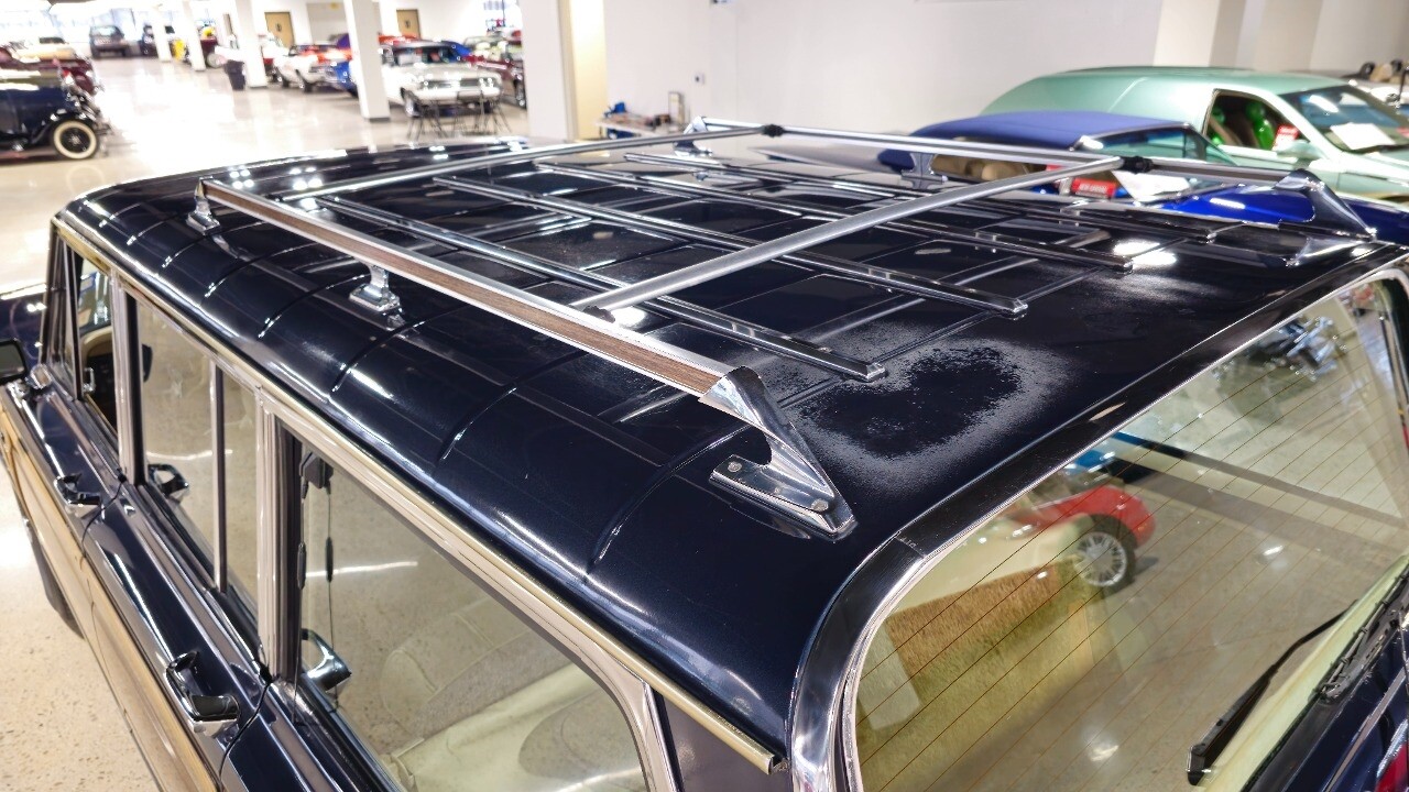 Dressed in a beautiful Dark Blue exterior that harmonizes with the Tan interior, this Grand Wagoneer exudes timeless elegance. It serves as a reminder of an era when SUVs were defined by a blend of rugged capability and refined style.