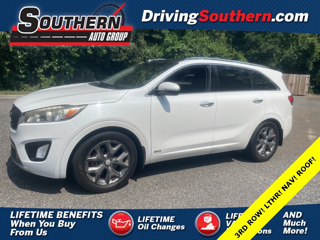Certification Program Details: Southern Certified Certified. Snow White Pearl 2016 Kia Sorento SX AWD 6-Speed Automatic with Sportmatic 3.3L DOHC SOUTHERN CERTIFIED Certified, AWD, Includes Life Time Oil Changes, State Inspections, Towing and much more!!!, Leather Seating!!!, Navigation!!!, Super Clean inside and out!!!, Alloy Wheels, Backup Camera, Bluetooth, Leather Seats, Moonroof, Navigation System, Power Package, Sunroof/Moonroof, ALLOY WHEELS, BACKUP CAMERA, BLUETOOTH, KEYLESS ENTRY, LEATHER SEATS, MOONROOF, NAVIGATION, POWER PACKAGE, THIRD ROW SEAT, PUSH BUTTON START, 10 Speakers, 4-Wheel Disc Brakes, ABS brakes, Air Conditioning, Alloy wheels, Auto-dimming Rear-View mirror, Brake assist, Bumpers: body-color, CD player, Delay-off headlights, Driver door bin, Driver vanity mirror, Dual front impact airbags, Dual front side impact airbags, Exterior Parking Camera Rear, Four wheel independent suspension, Front fog lights, Front reading lights, Fully automatic headlights, Heated door mirrors, Heated Front Bucket Seats, Heated front seats, Illuminated entry, Memory seat, Navigation System, Occupant sensing airbag, Outside temperature display, Overhead airbag, Overhead console, Panic alarm, Passenger vanity mirror, Power door mirrors, Power driver seat, Power Liftgate, Power moonroof, Power steering, Power windows, Premium Leather Seat Trim, Radio: UVO eServices with Premium Navigation, Rear air conditioning, Rear reading lights, Rear seat center armrest, Rear window wiper, Remote keyless entry, Roof rack: rails only, Security system, Speed-sensing steering, Split folding rear seat, Spoiler, Steering wheel mounted audio controls, Tachometer, Telescoping steering wheel, Tilt steering wheel, Traction control, Trip computer, Variably intermittent wipers, Ventilated front seats, Wheels: 19 x 7.5 Spoke Cap Alloy.