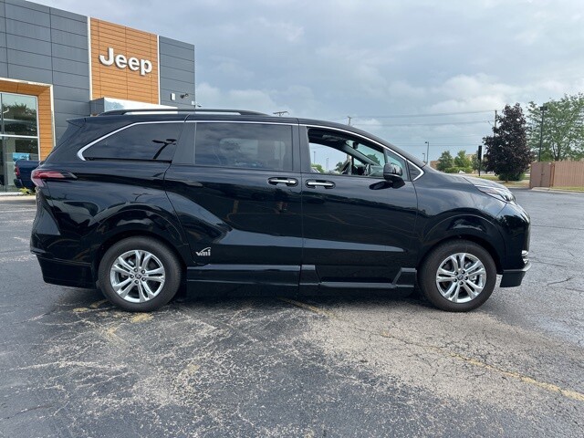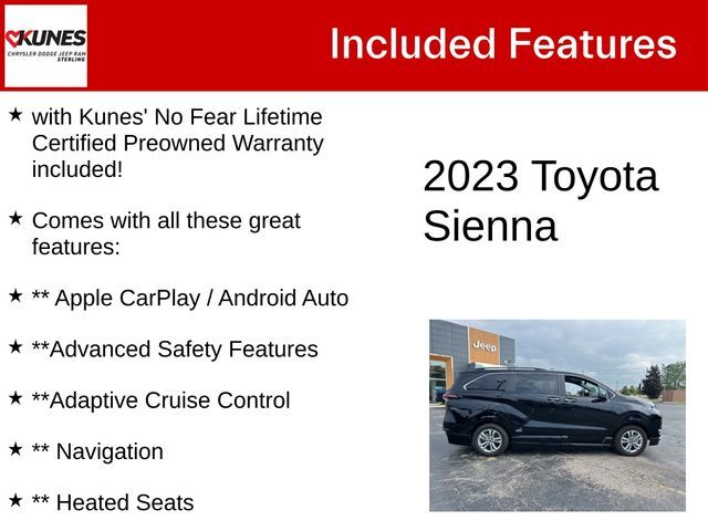 Midnight Black Metallic 2023 Toyota Sienna XSE Mobility Van XSE Mobility Van Pricing includes $2000 Trade In Assistance, and incentive to finance with Dealership. Must trade in 10 year or newer vehicle with less than 100,000 miles. with Kunes' No Fear Lifetime Certified Preowned Warranty included!, Comes with all these great features:, ** Apple CarPlay / Android Auto, **Advanced Safety Features, **Adaptive Cruise Control, ** Navigation, ** Heated Seats, ** Steering Wheel Controls, ** Keyless Entry, ** Automatic Headlights, ** Bluetooth, ** Back up Camera, **Rear Park Assist, **SIRIUS XM, Sienna XSE Mobility Van, 4D Passenger Van, AWD, Midnight Black Metallic, ABS brakes, Alloy wheels, Compass, Electronic Stability Control, Front dual zone A/C, Heated door mirrors, Heated front seats, Illuminated entry, Low tire pressure warning, Power Liftgate, Power moonroof, Rear dual zone A/C, Remote keyless entry, Traction control.