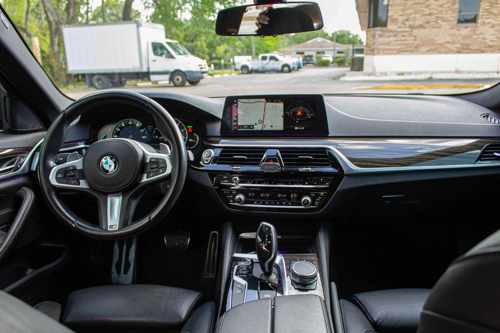 This 5 series comes with the BMW M-Sport package. The car has heated, leather, M-Sport bucket seats, premium 19 inch M-Sport wheels, the M-Sport front bumper, and the M-Sport steering wheel. The car has fog lights, full, 360-surround camera, and a heads up display. The oil, brakes, and tires, have all been recently changed.
