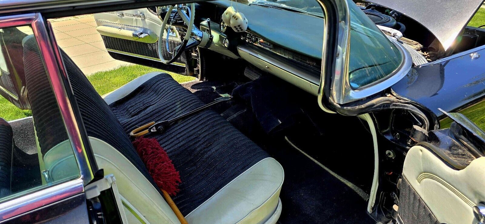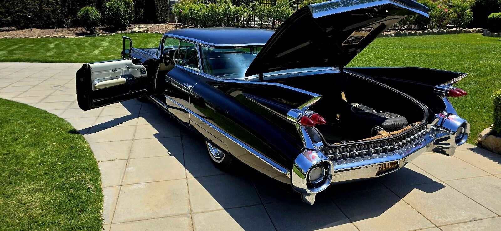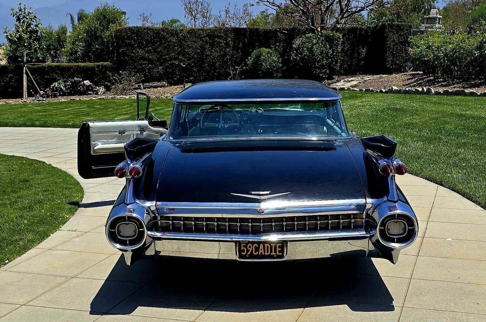 This 1959 Cadillac Sedan DeVille is entirely original, featuring factory jet black paint, interior, engine, and transmission. The odometer shows just over 78,000 original miles. As a classic 1959 Cadillac Series 62 Sedan DeVille, it boasts the iconic 4-window (Flat Top) design, reflecting the 1950s glitz with low-slung bodies and soaring tailfins tipped with dual "bullet" taillights. It remains a striking and rare vehicle, untouched by restoration.
