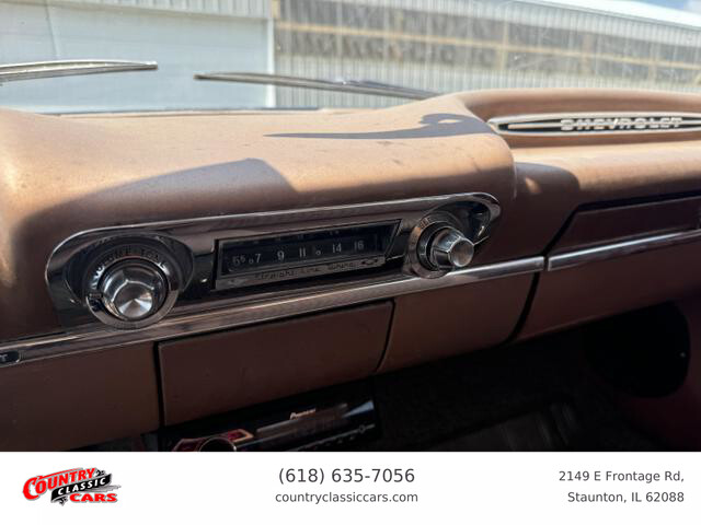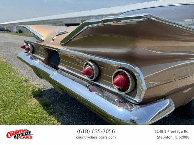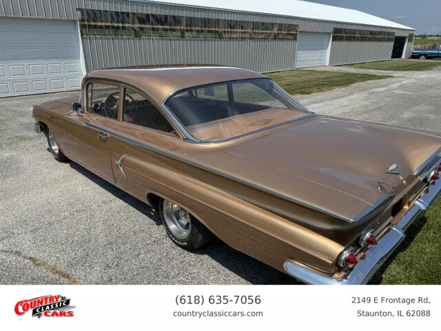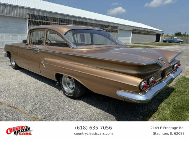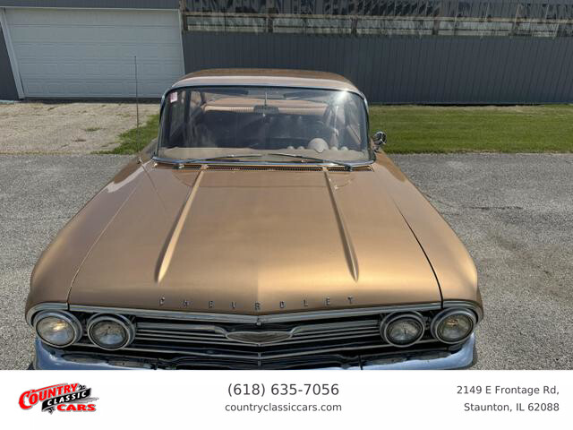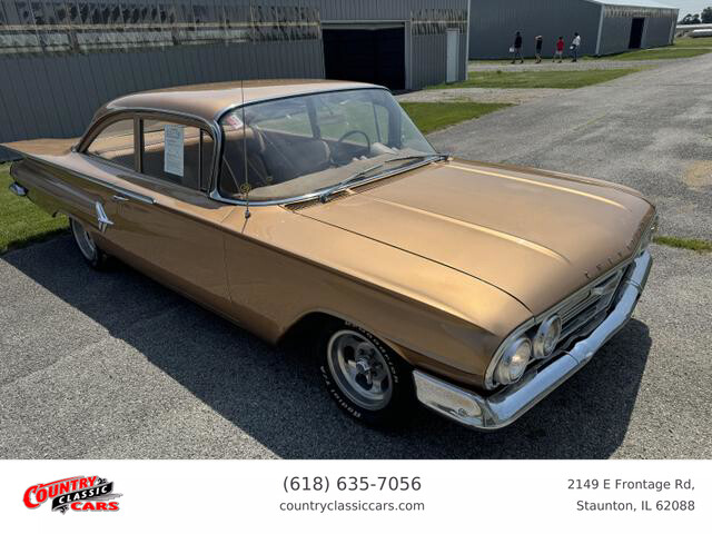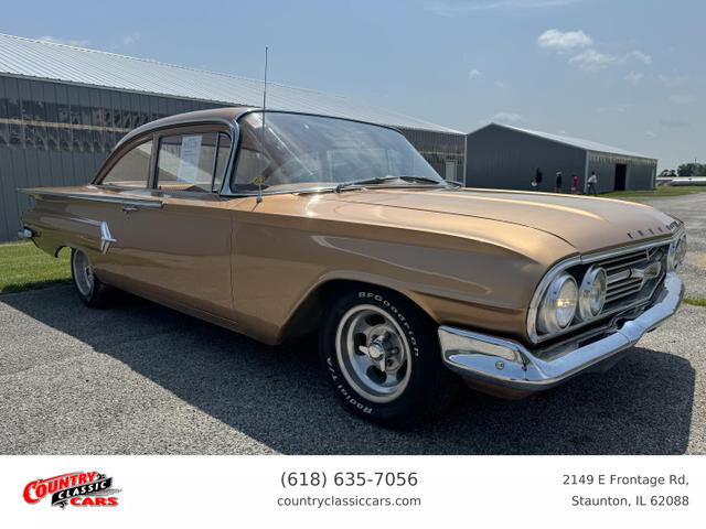 Available now is this 1960 Chevrolet Bel Air 2 Door finished in a copper/gold paint over a copper and white two-tone interior. This Bel Air is powered by a small block Chevy V8 mated to a 3 speed manual column shift transmission. It has dual side exit exhaust, power brakes, aluminum slot wheels, and runs and drives well. Interior was refinished a few years ago by the previous owner and is in very nice overall condition. The paint is new on the exterior and it is in great condition. It is missing a couple of trim pieces. There are very few of these 1960 Bel Air 2-doors that come on the market.