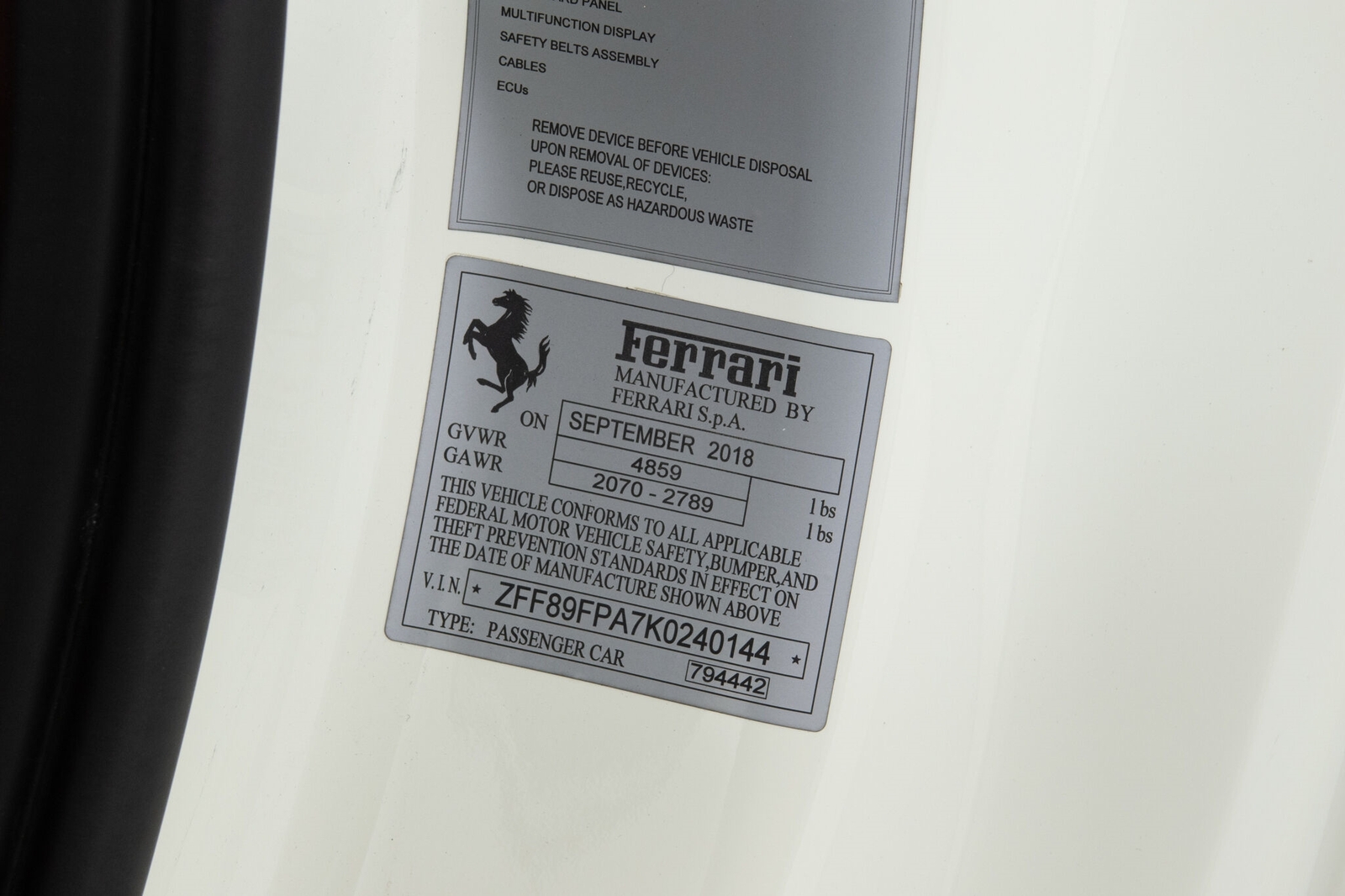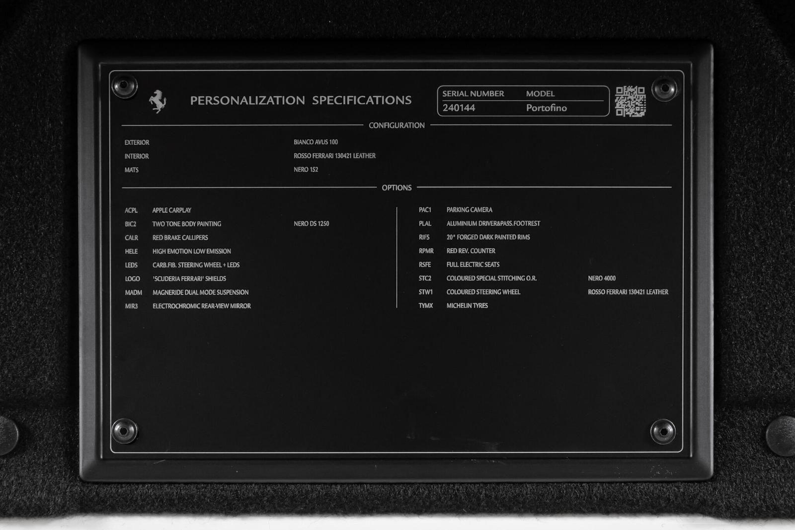 Ferrari South Bay is pleased to bring to market this One-Owner, Ferrari-Certified 2019 Portofino, finished in Two-Tone Bianco Avus with a Nero Black Roof and stunning Rosso Ferrari Leather on the interior. It is in remarkable condition, as one would expect from a car with just over 2,000 miles showing on the odometer.The Portofino is a terrific balance of relaxed grand tourer with a sports car lurking just under your right foot. A push of a button drops the retractable hard top for some al fresco thrills while listening to the opera produced by Ferrari's award-winning 3.9 liter twin-turbocharged that lives under the bonnet.The exterior is finished in Two Tone Bianco Avus with Nero Black Roof, highlighting the cockpit and showing off the sleek curves of the body panels. 20" Forged Rims are painted Argento Opaco and wrap around Carbon Ceramic Brakes with Red Brake Calipers, with Ferrari's iconic Scuderia shields on the front fenders. With 592 horsepower on tap, delivered through a paddle-shifted 7-speed Dual Clutch transmission, every drive is an adventure, whether headed to your favorite restaurant or attacking the most challenging canyon.Inside, you'll find glorious Rosso Ferrari Leather covering Fully Electric Seats, with contrasting Nero Black stitching on the doors and dashboard. The Steering Wheel is Carbon Fiber trimmed with Rosso Ferrari Leather, and is fitted with Ferrari's famous LED Shift Lights, and frames a Tachometer finished in Red and Carbon Fiber F1 Shift Paddles. A Magneride Dual Mode Suspension guarantees a comfortable ride regardless of the road surface, and the Reversing Camera ensures parking is a breeze.This Portofino is offered complete with with 2 keys, books, car cover, battery tender, and the factory wind deflector. As a Ferrari CPO vehicle, it has passed Ferrari's stringent 101-point inspection, and is eligible for two years of warranty at the time of purchase. The Ferrari Genuine Maintenance Program is active until December 12, 2025. If you'd like to know more about this sensational Portofino, please contact our knowledgeable sales team for more information or to schedule an appointment for viewing.