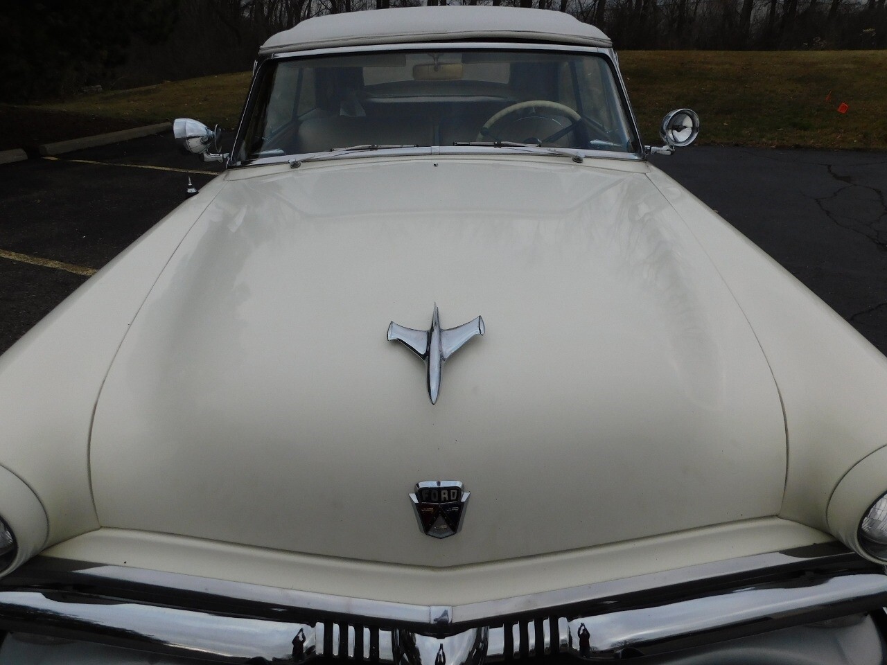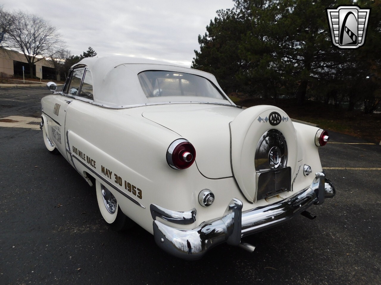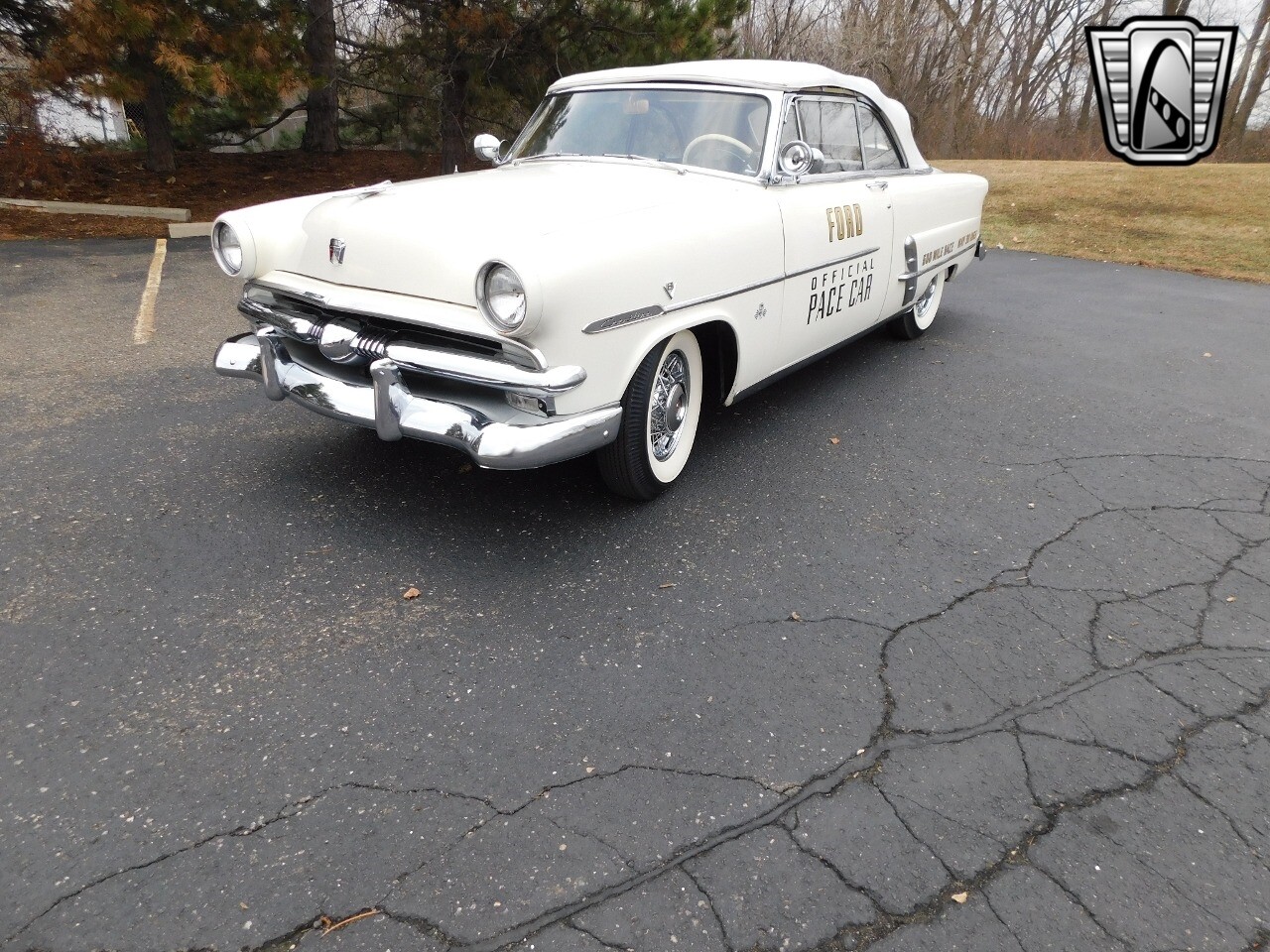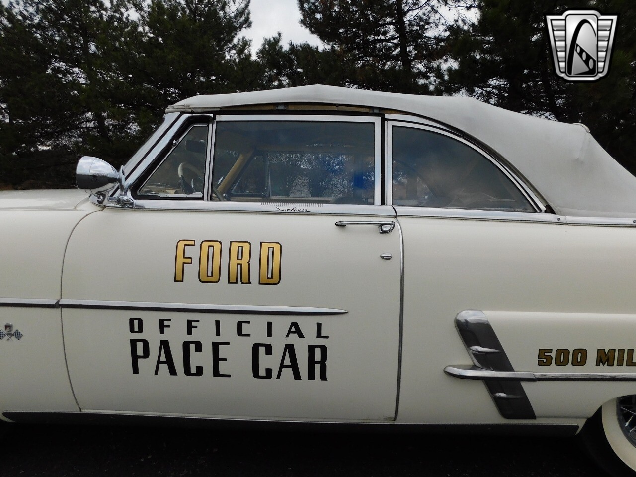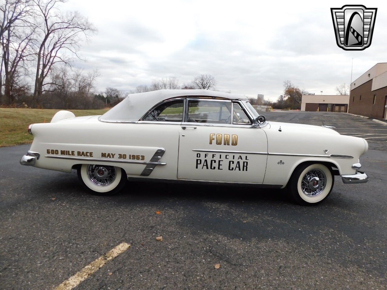 Gateway classic cars of Detroit is proud to present this 1953 Ford Crestline Sunliner Pace car. Ford Motor Company gifted the original race-used pace car to The Henry Ford, where it remains today. Ford Motor also produced some 2,000 replicas for sale to the public. This one, was 1 of 2 that was a AAA car at Indianapolis the day of the race. The one used as the pace car can be found at the Henry Ford museum, and this one was the backup car. Each replica included the same features (Ford-O-Matic transmission, power steering, Continental spare tire kit), along with Sungate Ivory paint, and gold lettering. The Ivory and gold continue on the interior with the beautiful vinyl seats. Reportedly, it was the first time a manufacturer offered pace car copies for purchase by the general public, something that is now a well-established tradition in its own right. The serial number confirms it's a 110 HP Crestline Sunliner Convertible-all Pace Cars came with the higher-output Flathead V-8. Features include: Am radio, automatic convertible top (not working, must be done by hand) wire wheels (recently restored by Dayton wire wheels with stainless steel spokes).