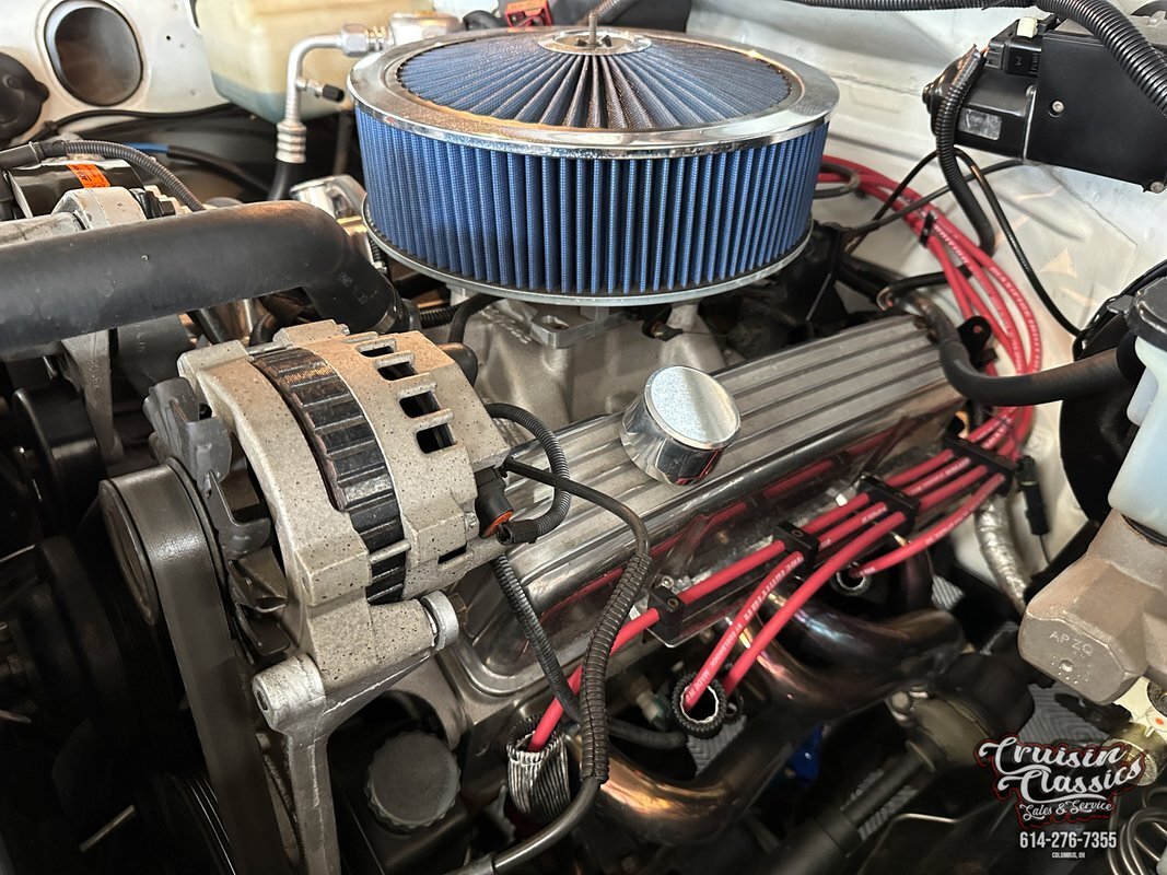 When you lift the hood a courtesy light pops on to illuminate the clean and tidy engine bay. The star of the show is a 383 Stroker crate motor (installed in 2021) that is ready to roar! This powerhouse features forged dish pistons, Scat crank and rods, NKB 200cc Runner plug heads, and a Melling high-volume oil pump. The engine is further enhanced with Erson tie-bar lifters, Comp. aluminum roller rockers, a PBM Billet true roller timing chain, and a Chevy high-performance cam. The engine is topped off with finned polished valve covers, an Edelbrock aluminum intake, SPR Performance 650cfm throttle body fuel injection, and a Spectre air cleaner. Exhaust flows through headers and a newer stainless exhaust to exit the tips with an aggressive growl. Other items of note under the hood are power steering, power brakes (disc/drum) with stainless lines, and working 134A air conditioning. The powerful V-8 is mated to a 700R4 4-speed automatic overdrive transmission that was rebuilt approximately 2K miles ago - an awesome powertrain combo!