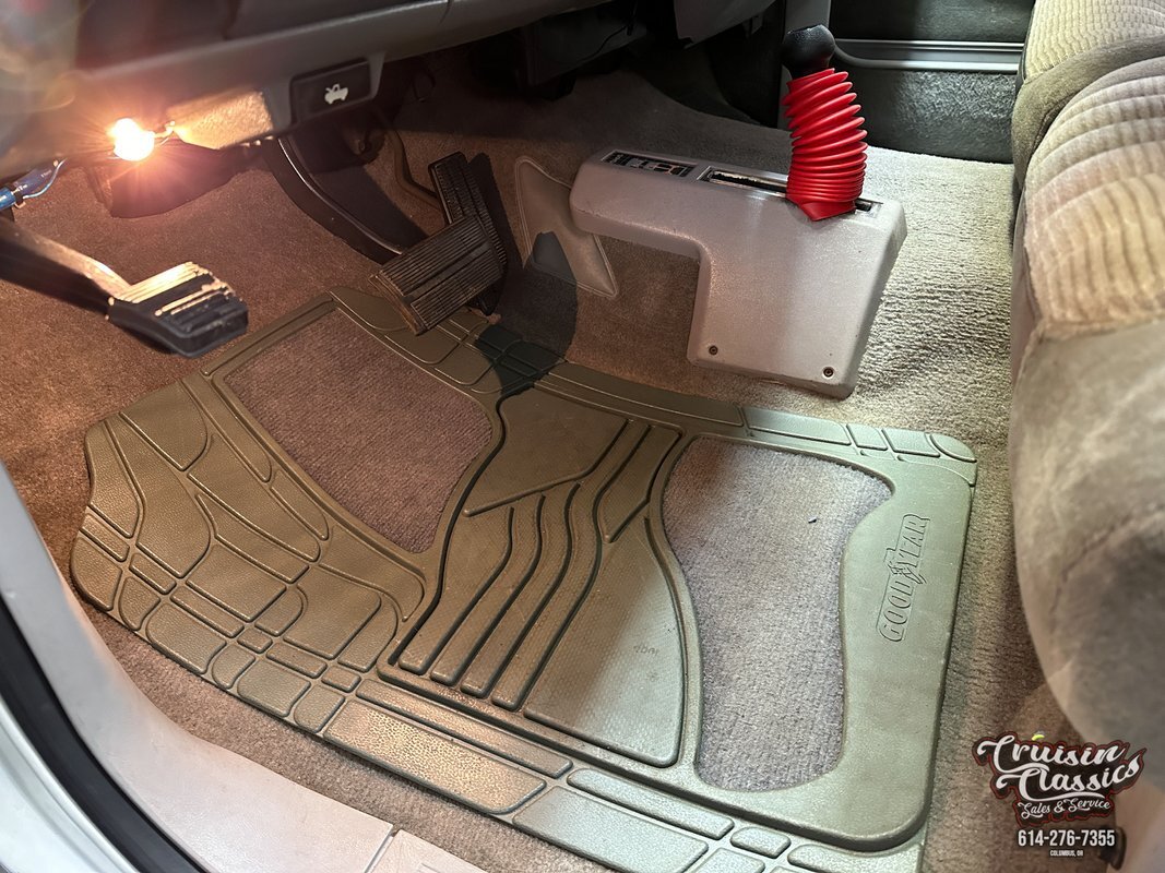 Open the driver's door and hop up into the cab to find an exceedingly clean and well-kept grey interior. The 60/40 split bench seat is covered in soft comfortable grey fabric that is free of any signs of wear. The OEM door panels offer power windows and locks and they look great. Stain-free grey carpet covers the floors and grey rubber & carpet floormats keep it looking nice. On the floor to the right of the driver is the shifter for the 4WD that offers "on-the-fly" shifting in high gears. Overhead you'll find a tight grey cloth headliner and a working courtesy light. The grey dash is crack-free and in excellent shape. There are working gauges for oil, temp, gas, and battery as well as an 85mph speedometer. The odometer reads 173,966 and the actual miles title backs that up. Also in the dash are climate controls with an LED screen (working heat & A/C) and an Alpine AM/FM/CD/Bluetooth stereo. The stereo plays not just through the stock dash speakers but also 2 6X9s and a 10" subwoofer powered by two amplifiers – all MTX Audio products – behind the bench seat. This sound system is seriously loud with a fantastic sound! The driver is treated to a leather-wrapped steering wheel on a tilt column. A tinted 4-panel sliding rear window adds a nice touch to an already outstanding interior. The original owner's manual and Alpine stereo manual can be found in the glovebox. This Sierra also comes with a clean CarFax and a folder of receipts documenting the engine, transmission rebuild, exhaust, and more.