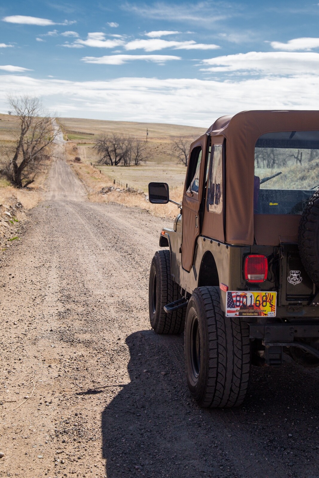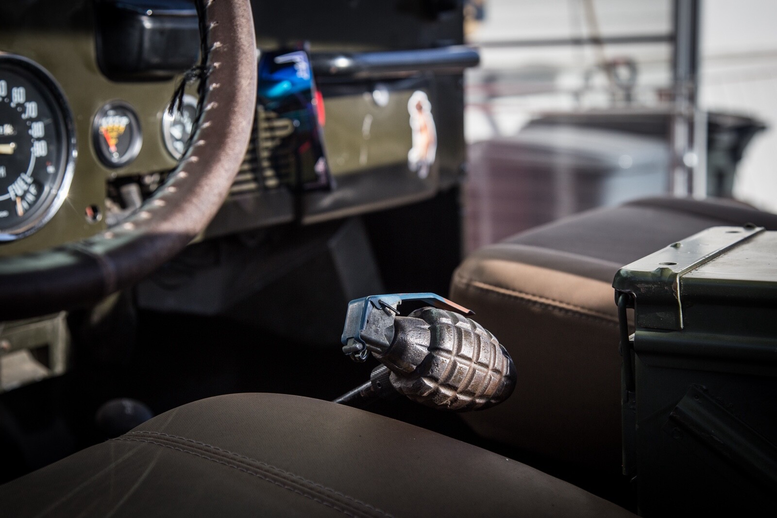 The interior flooring has been Rhino-Lined, to give under foot traction, keep the metal protected against the elements, and uphold the rugged look. Matching with the top are Bestop Trailmax II Low-back seats, to include a rear bench seat. Hard to miss is the Real (and inert) Mk II Grenade, as the most fitting shift knob for a vehicle that has its historical roots in military service. This 1977 CJ5 was owned by a retired Aircraft Weapons Maintainer and currently maintained and owned by an F-16 Crew Chief. It has lived on three military bases, and is more than a weekend warrior; It is a blacktop bomber stoplight to stoplight, and can climb some of the toughest mountains without breaking a sweat.