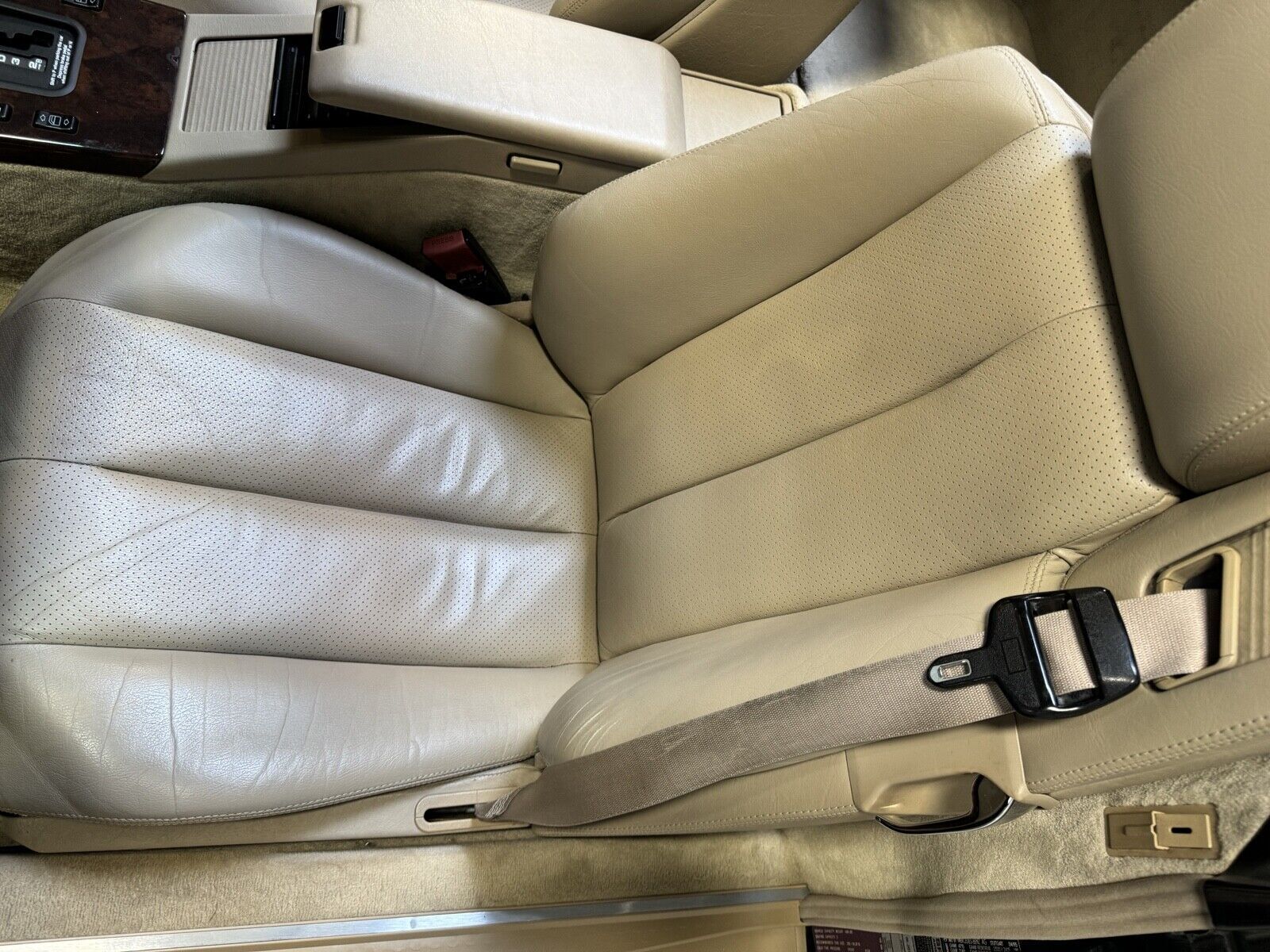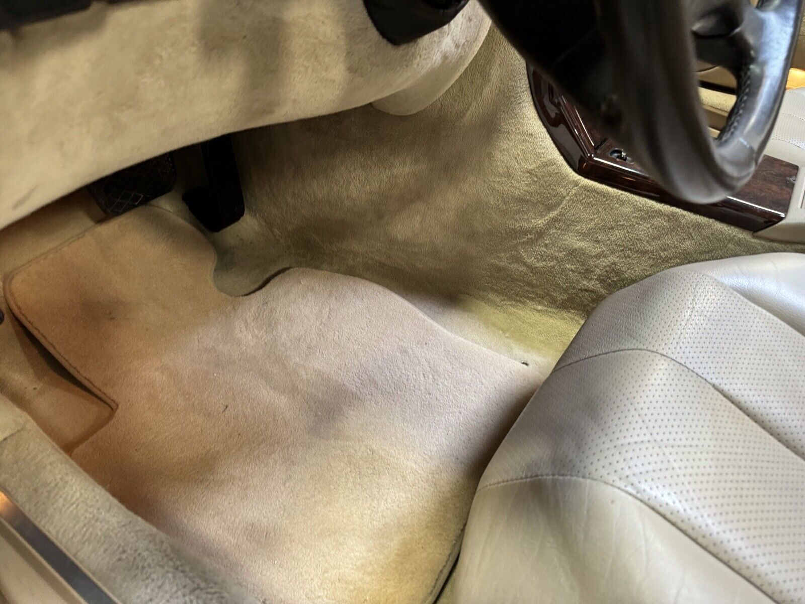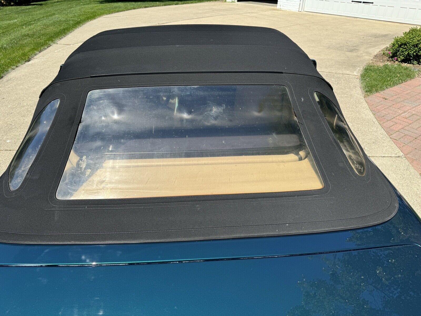 The interior is in exceptional condition with super clean leather, carpet, door panels, and dash. The wood trim is in excellent condition. All the buttons and switches operate. The headliner on the hard top has begun to sag up near the front. It looks like it should glue back up with ease. The soft tops operates with ease but the rear plastic window should be replaced or hand sewn in two small areas. The black soft top portion is in excellent shape.