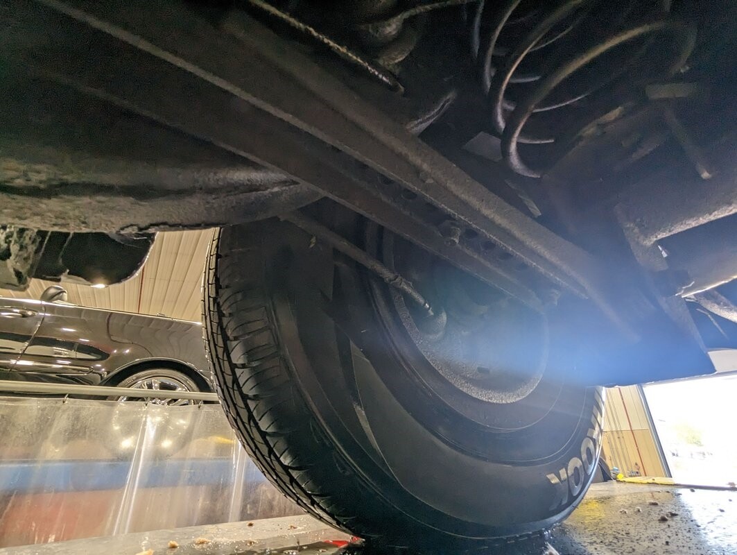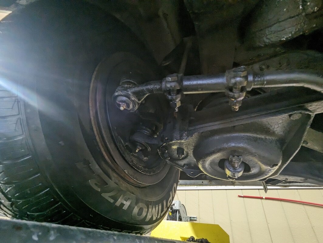 UNDERSIDE: Underneath the car appears to be solid and maintained as needed. The dual exhaust looks recent with glass pack style mufflers. The fuel tank has been replaced. The front end has been inspected and serviced. The shocks and springs look like they were replaced. The starter was just rebuilt. It has the original Hydramatic trans, the 1962 tag is still attached.