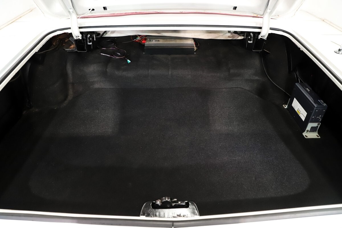 TRUNK COMPARTMENT: Giant trunk! Under the lid and jamb were repainted. It's lined in felt and has a custom floor panel. Underneath it is the spare and jack. There is also a CD changer and amp too.