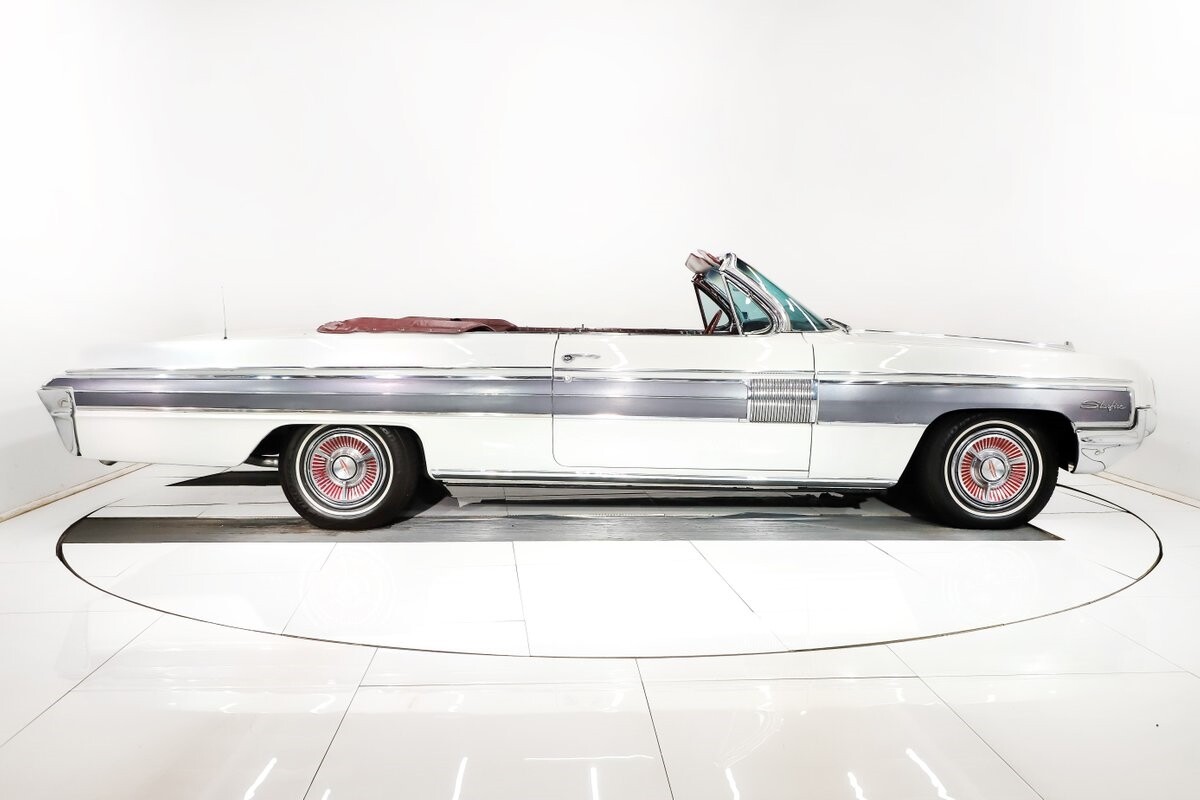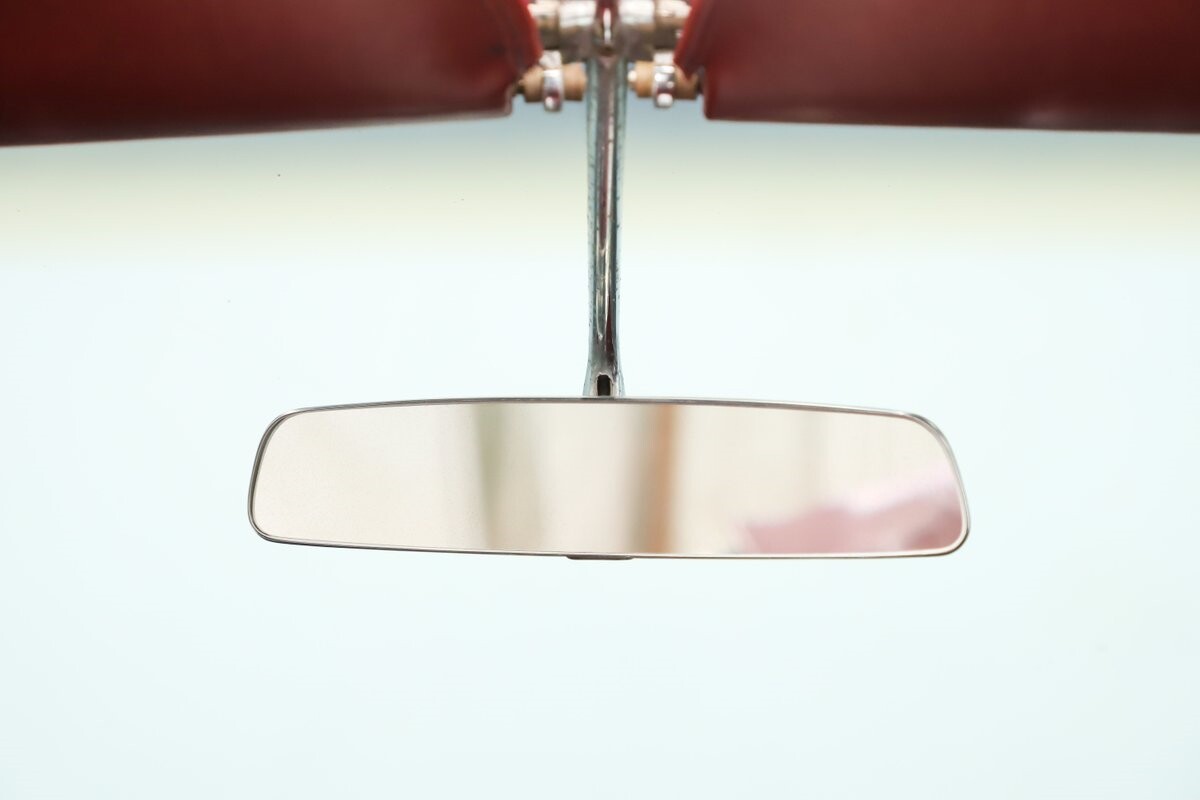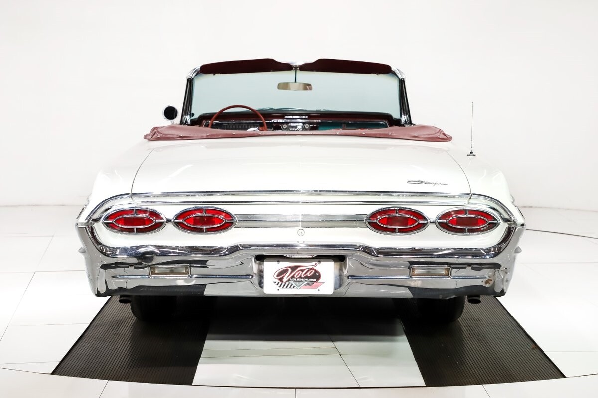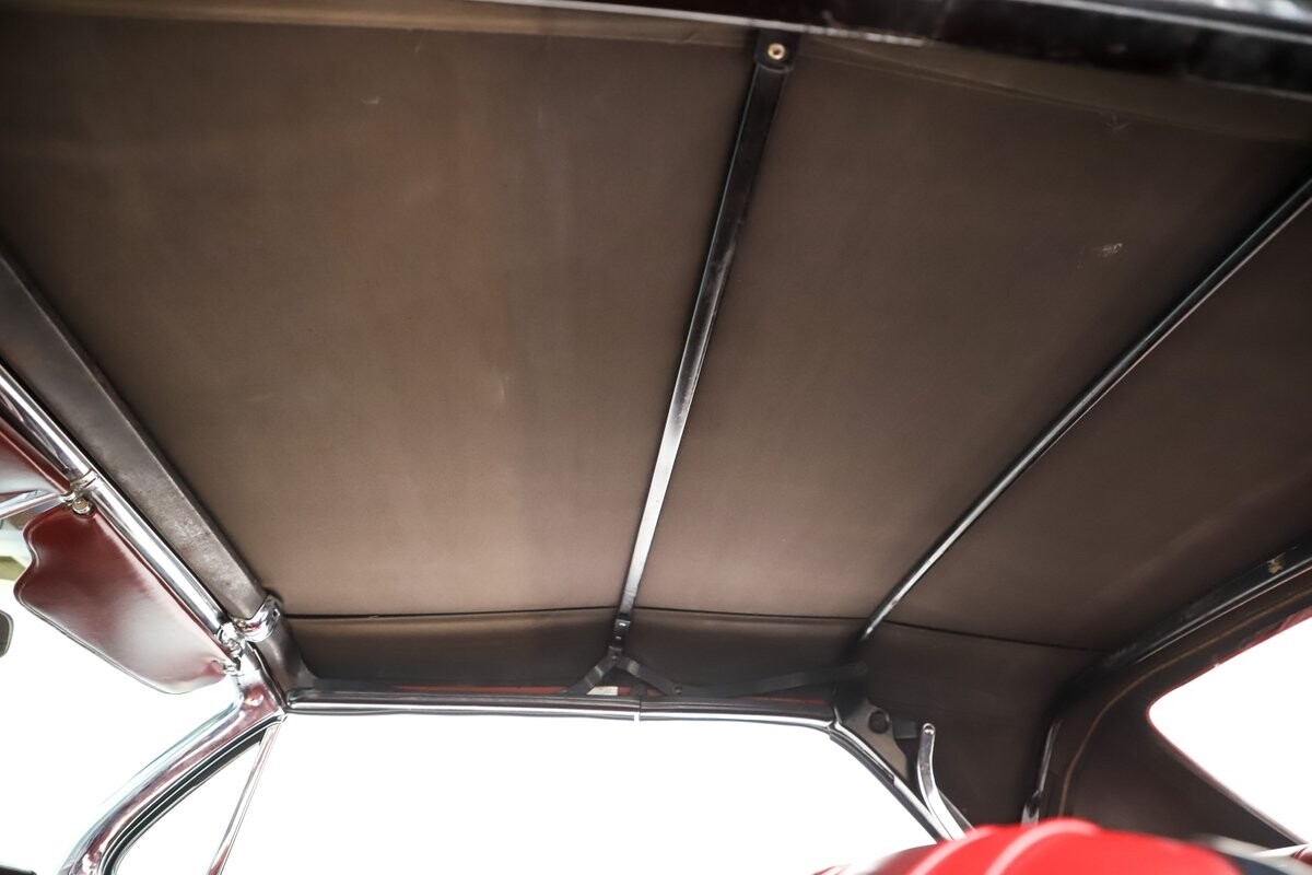 EXTERIOR: Overall it's a great looking car. I would be proud to go to any cruise night or car show with it. Very solid, straight and fits good. The paint is a white metal flake that is smooth and glossy. It's an older paint job with minor flaws if you look for them. The chrome and trim are original and present nicely. There is a dent in the rear bumper. Original glass, weather strips were replaced. Dark red convertible top looks sharp!