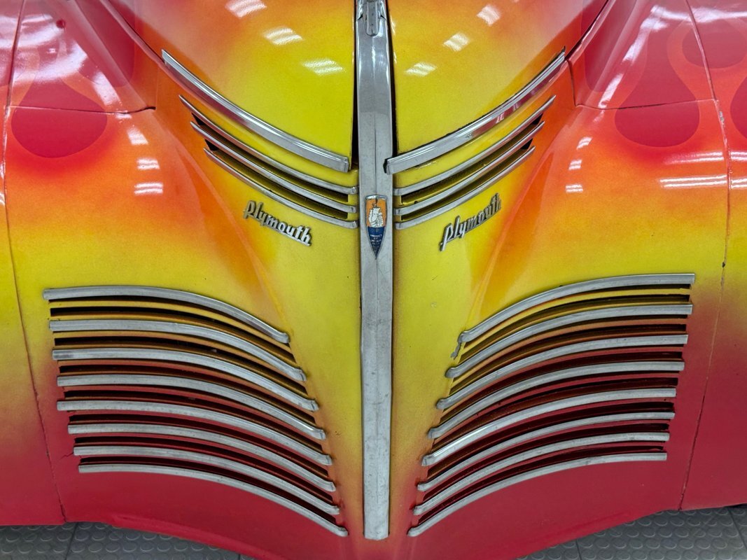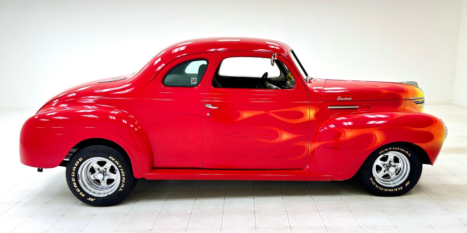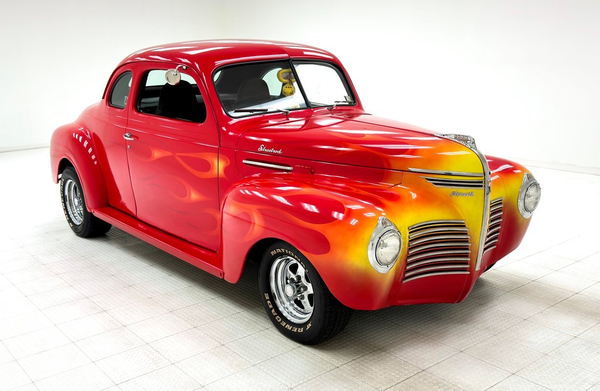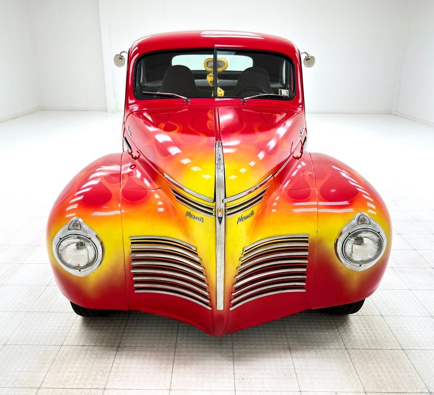 For consignment, a 1940 Plymouth Deluxe P10 Business Coupe, long retired from the sales workforce and now a textbook street rod with all the desirable ingredients. Flames on red paint? Check. Chrome wheels? Yep. A 350ci under the hood? Absolutely. It's been carefully maintained over the past 20 years and is ready for a new caretaker.