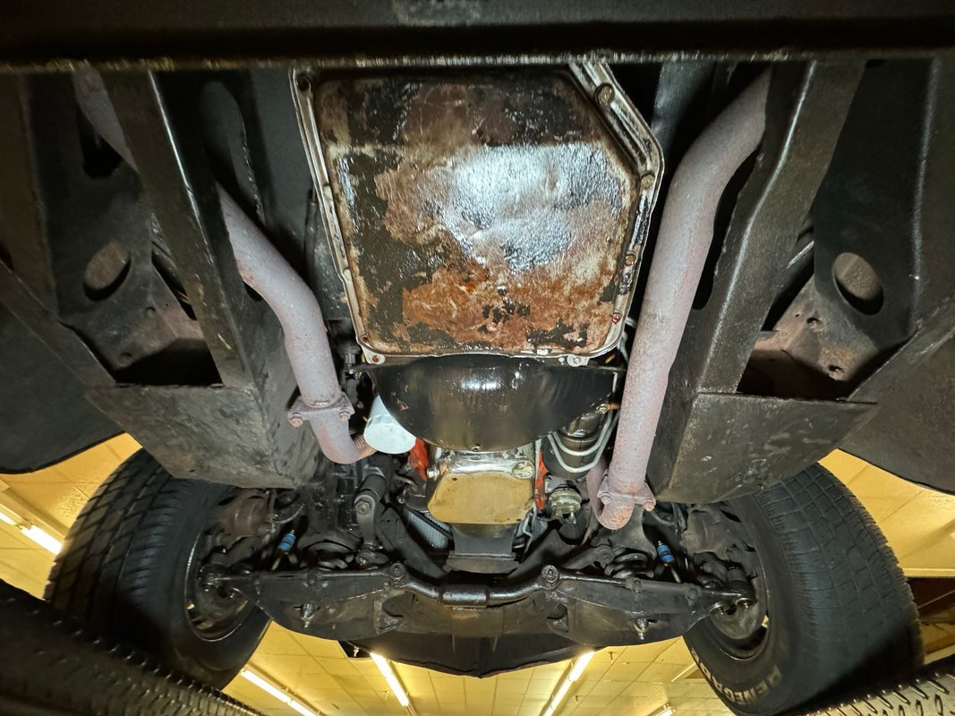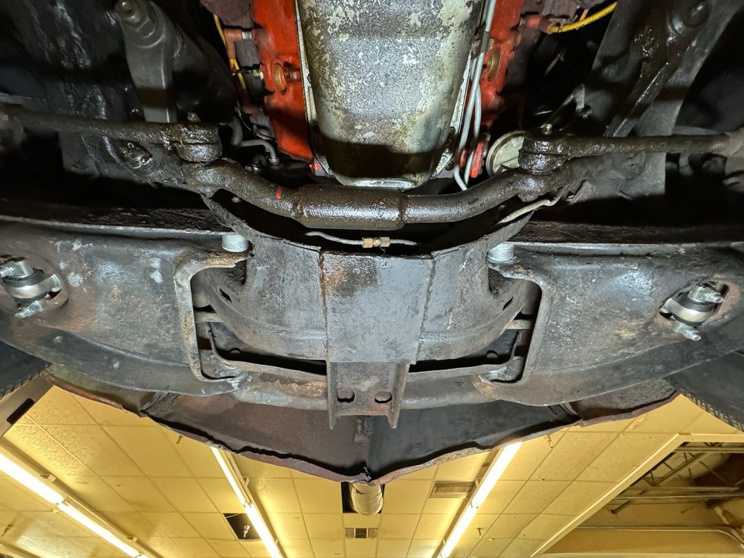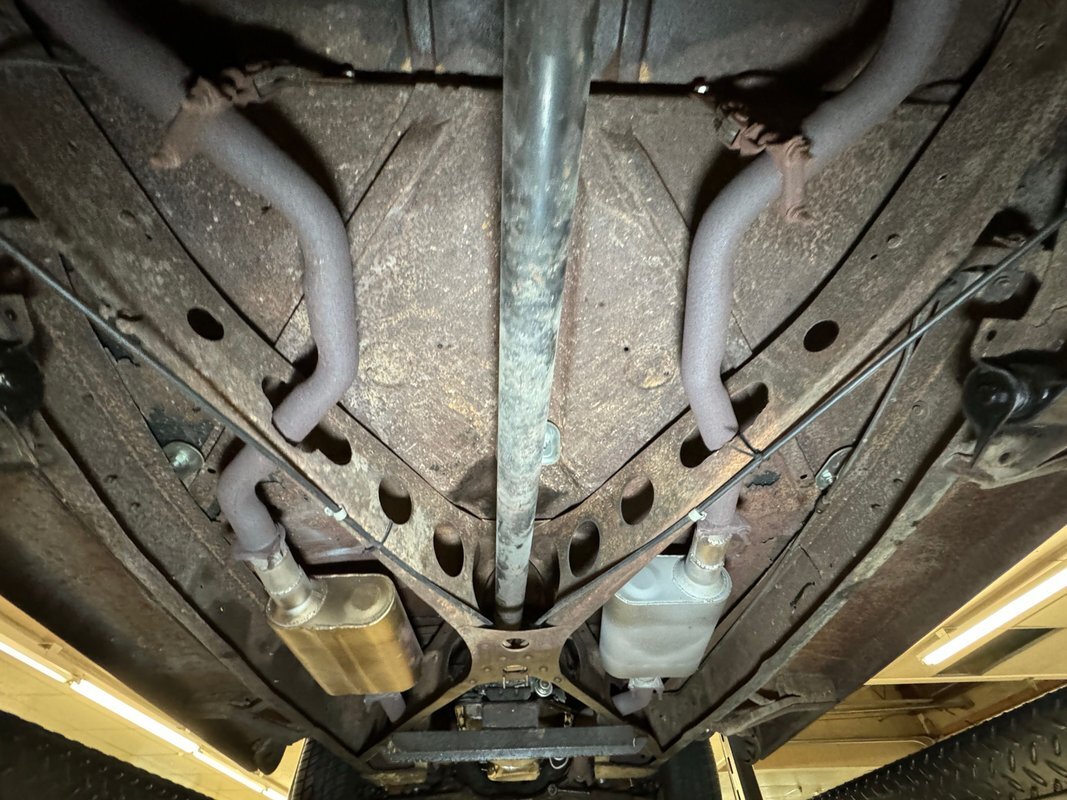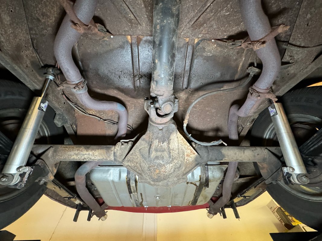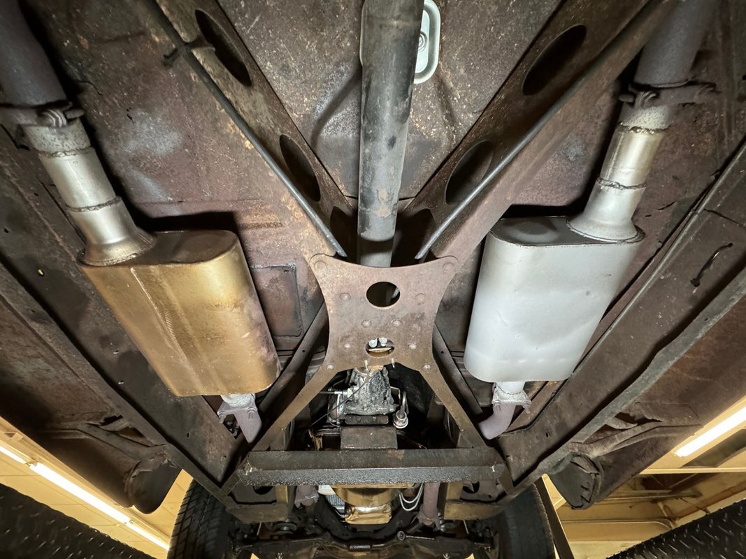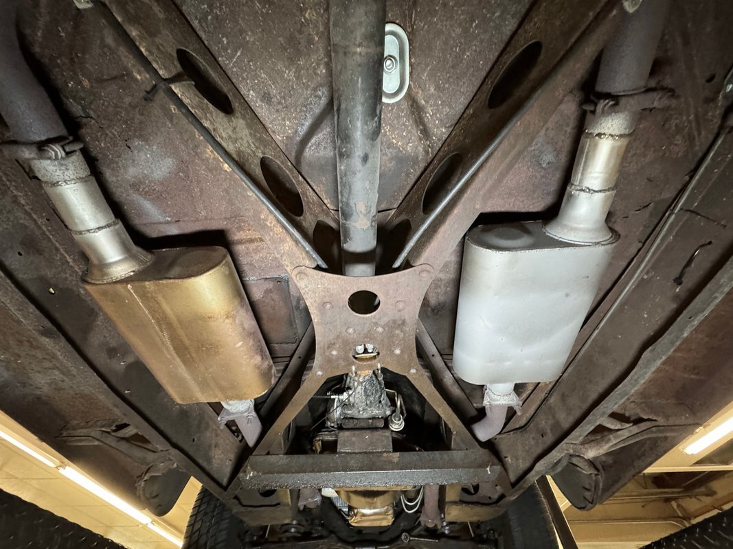 Driver quality conditions prevail underneath with plenty of non invasive surface rust, some oil on the pan, and some flaking rust on an inner body bracket and inner rocker panel. There's quite a bit on the underside panels as well. The dual exhaust runs through the X-frame and encounters Flowmaster mufflers before exiting out back. Coil spring suspension is up front with leaf springs in the back. In 2016 the springs, shocks, and a sway bar were replaced.