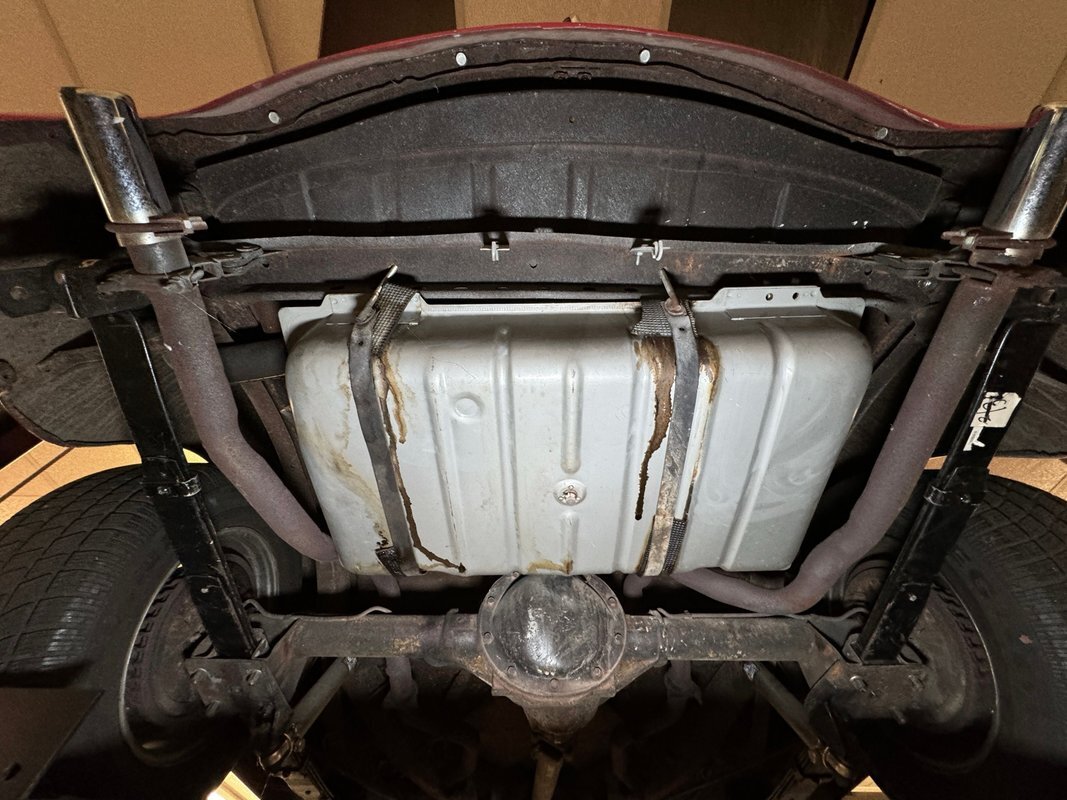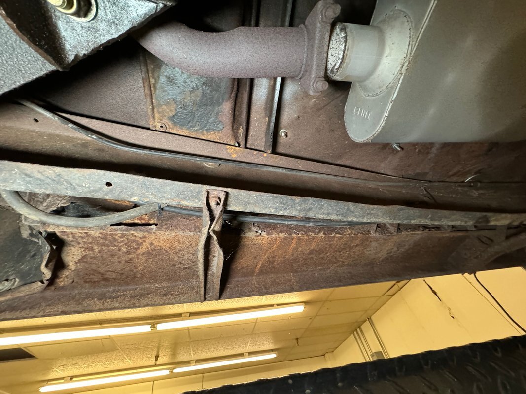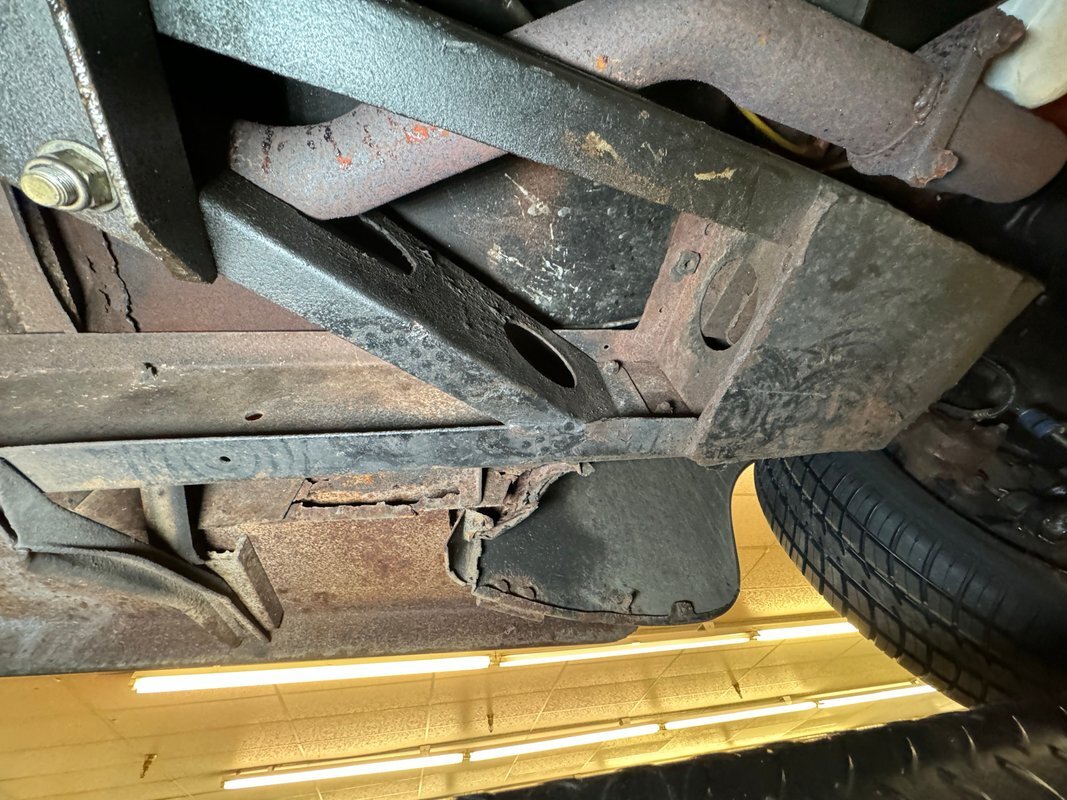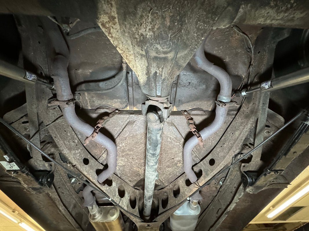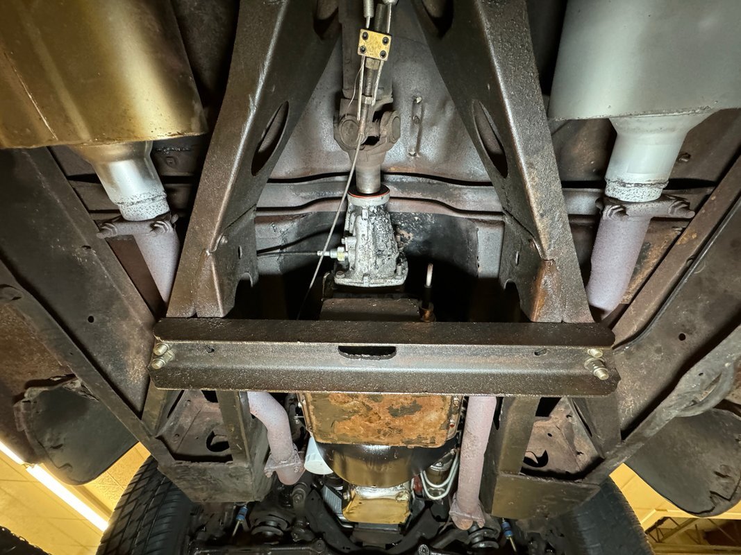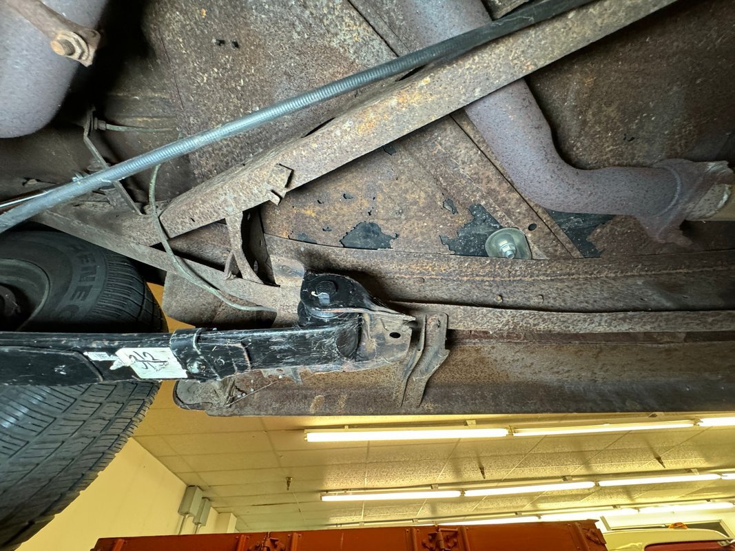 Driver quality conditions prevail underneath with plenty of non invasive surface rust, some oil on the pan, and some flaking rust on an inner body bracket and inner rocker panel. There's quite a bit on the underside panels as well. The dual exhaust runs through the X-frame and encounters Flowmaster mufflers before exiting out back. Coil spring suspension is up front with leaf springs in the back. In 2016 the springs, shocks, and a sway bar were replaced.