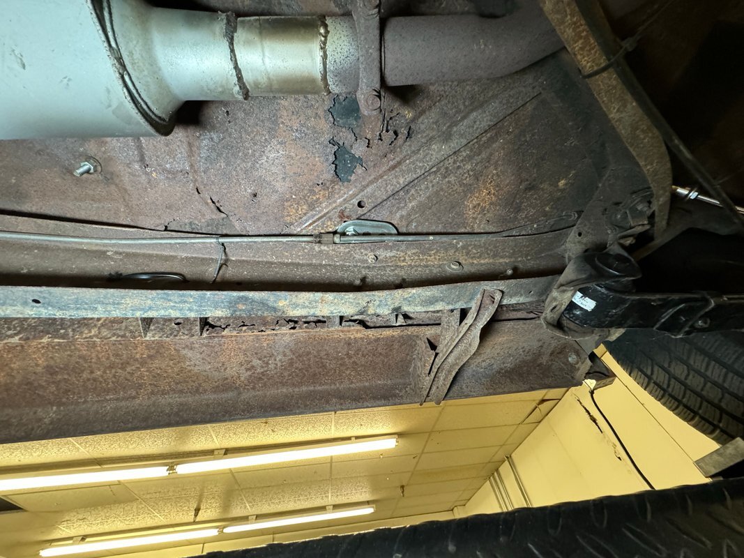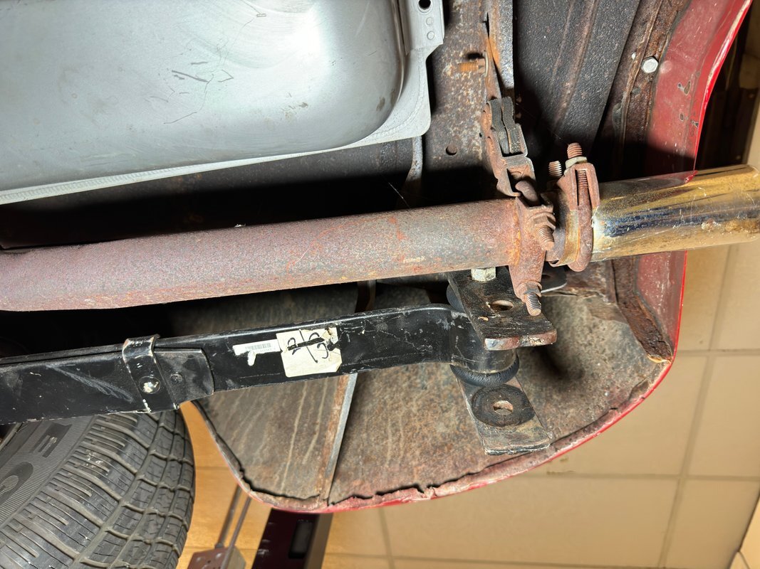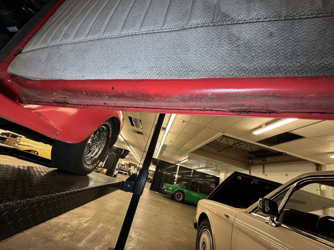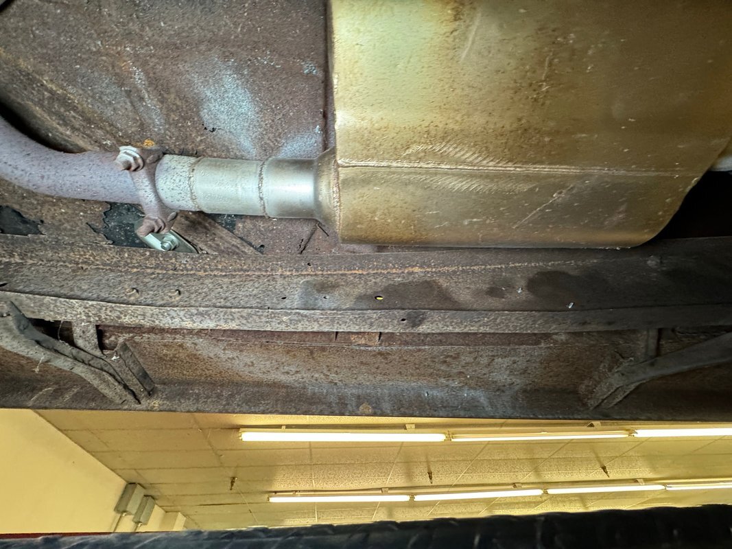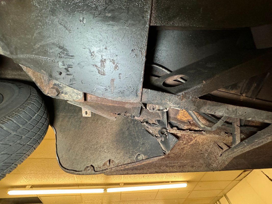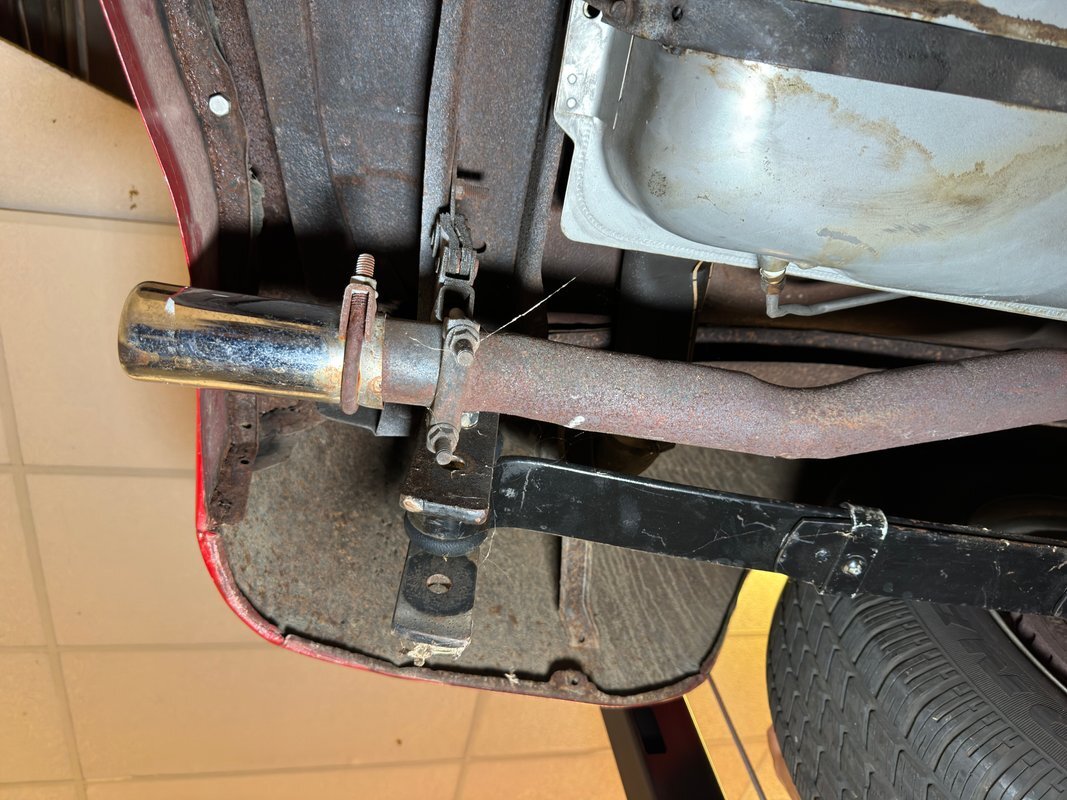 Driver quality conditions prevail underneath with plenty of non invasive surface rust, some oil on the pan, and some flaking rust on an inner body bracket and inner rocker panel. There's quite a bit on the underside panels as well. The dual exhaust runs through the X-frame and encounters Flowmaster mufflers before exiting out back. Coil spring suspension is up front with leaf springs in the back. In 2016 the springs, shocks, and a sway bar were replaced.