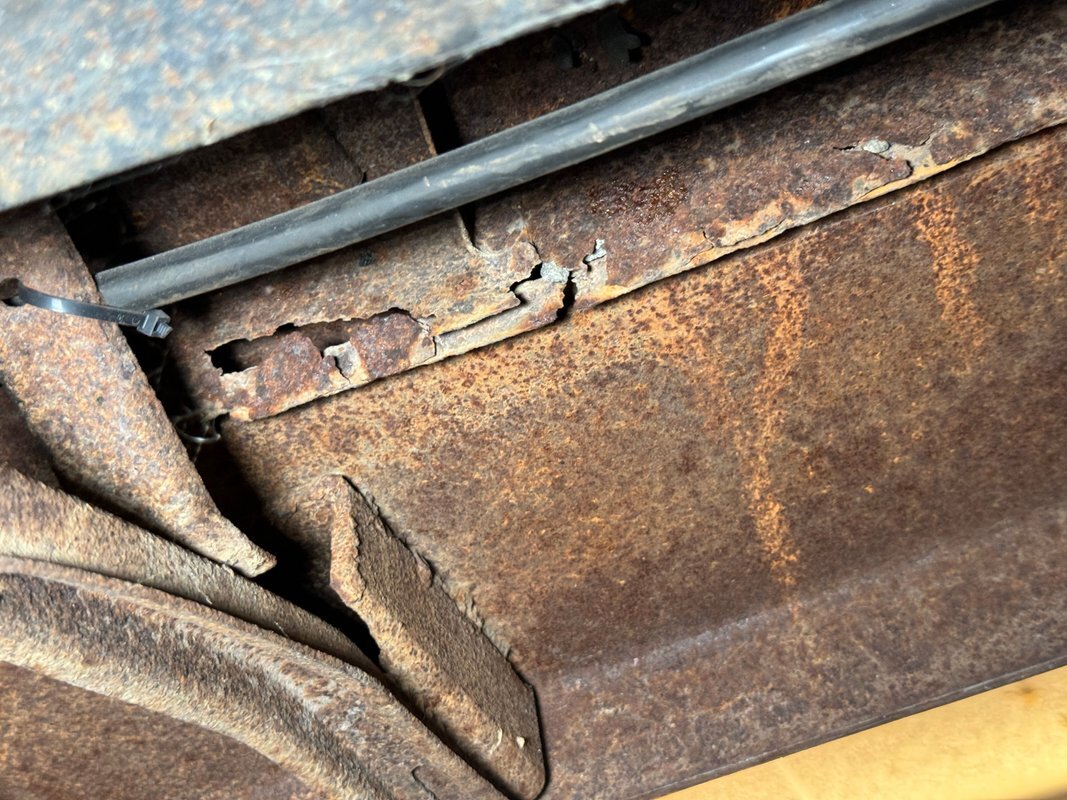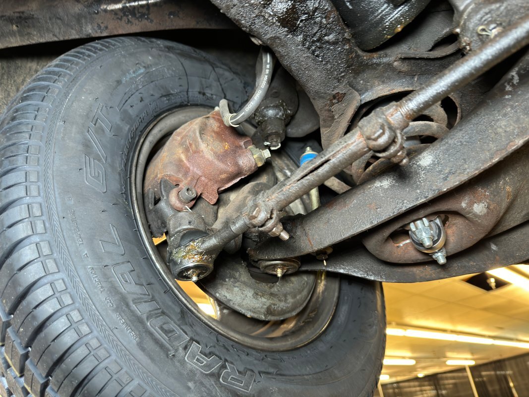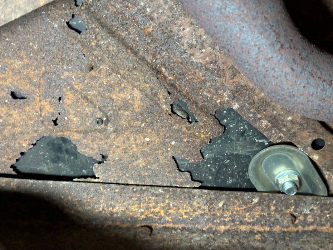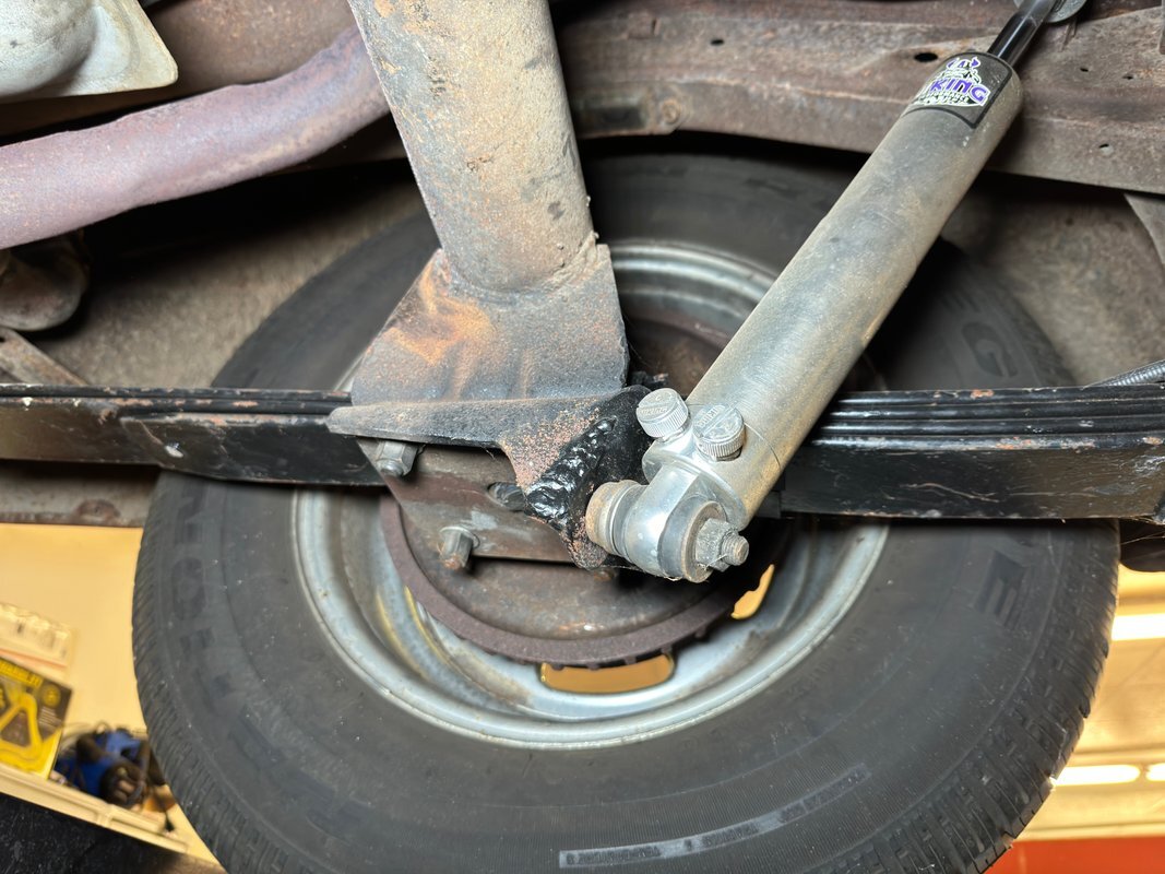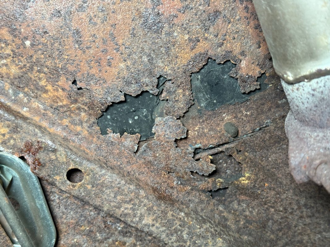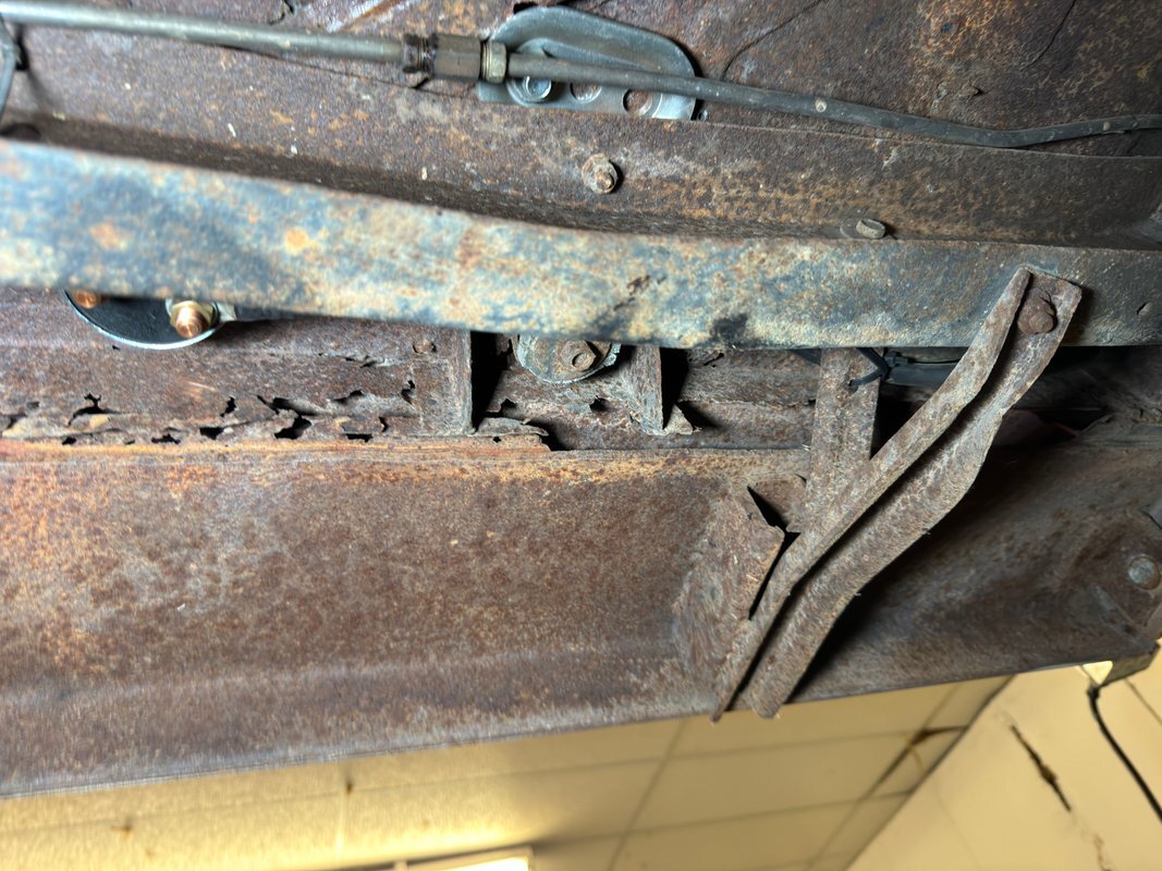 Driver quality conditions prevail underneath with plenty of non invasive surface rust, some oil on the pan, and some flaking rust on an inner body bracket and inner rocker panel. There's quite a bit on the underside panels as well. The dual exhaust runs through the X-frame and encounters Flowmaster mufflers before exiting out back. Coil spring suspension is up front with leaf springs in the back. In 2016 the springs, shocks, and a sway bar were replaced.