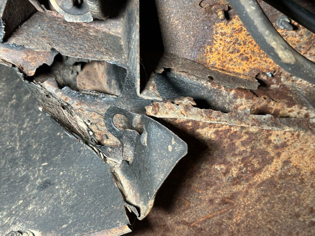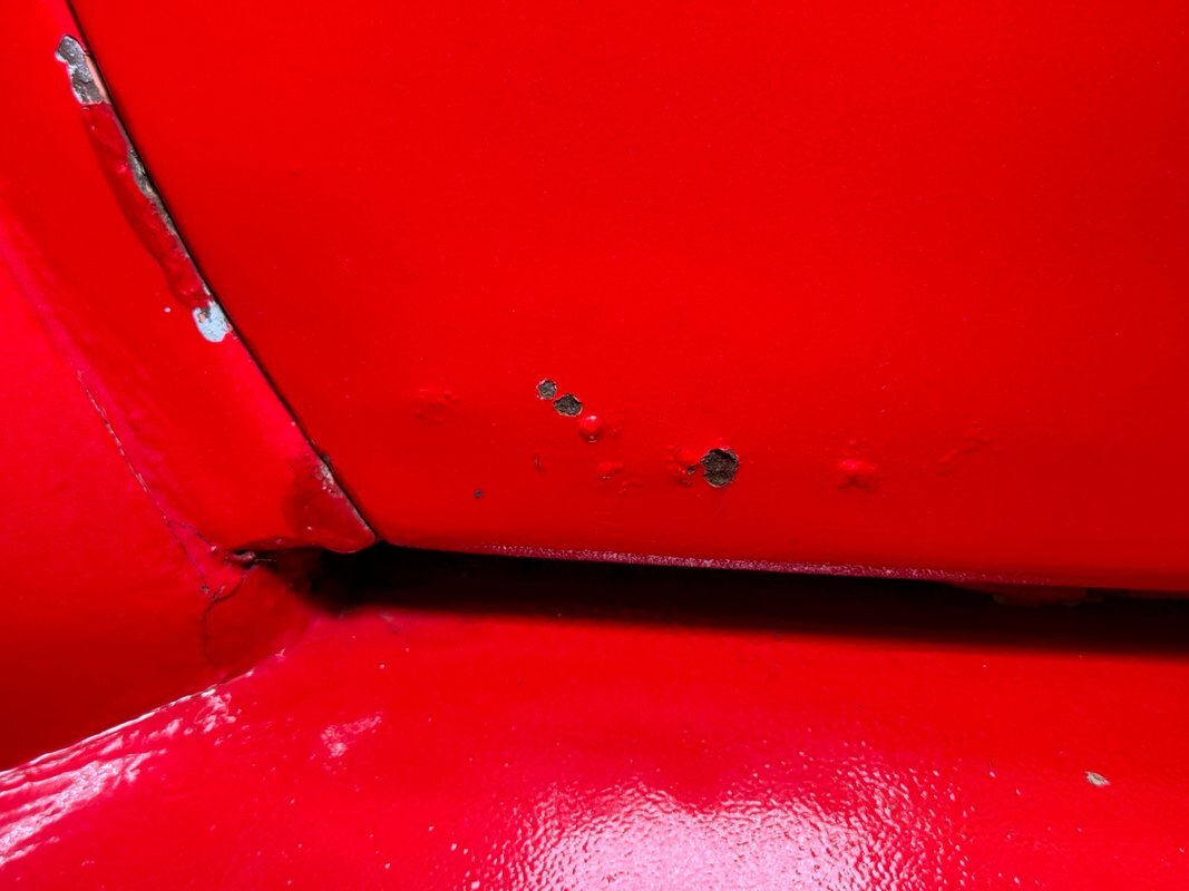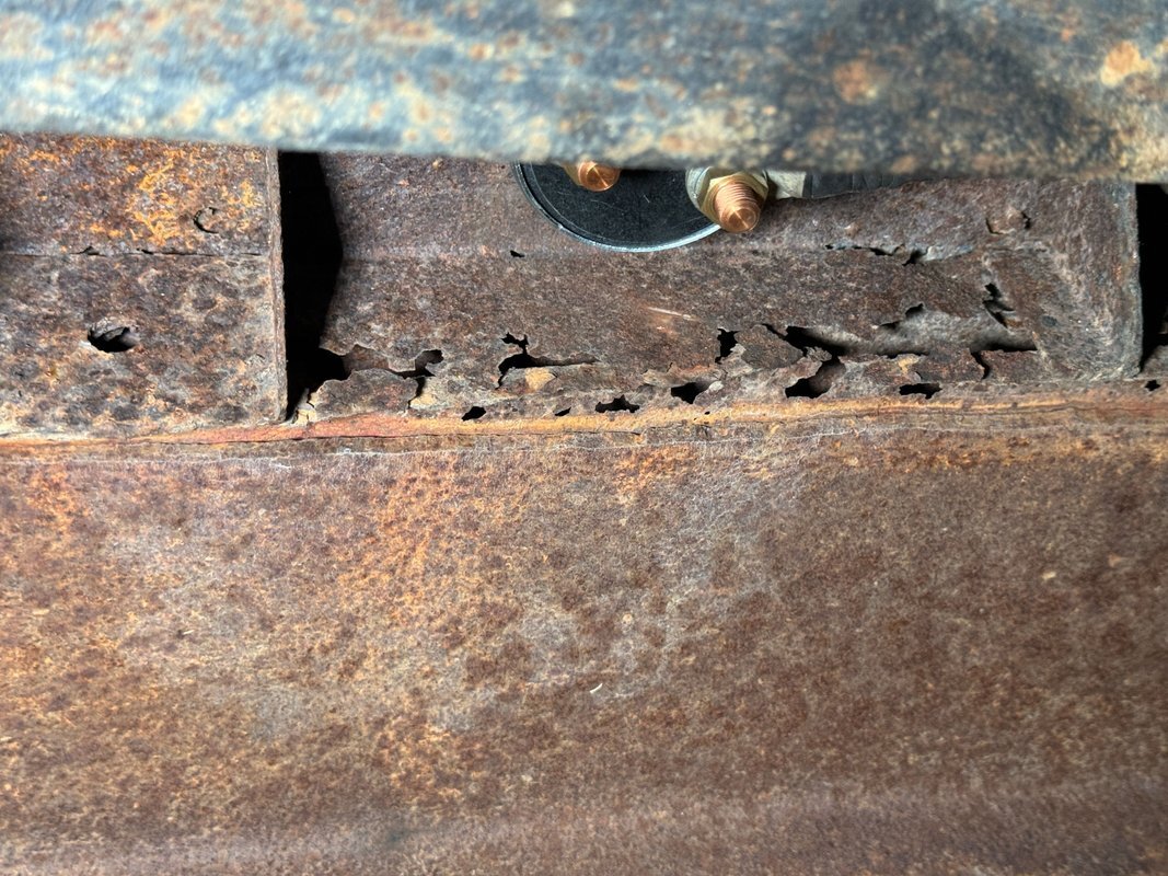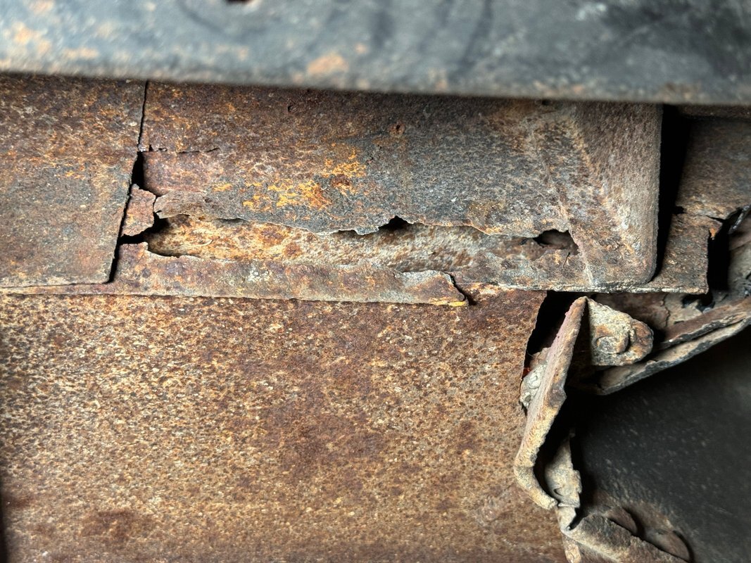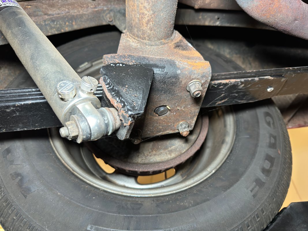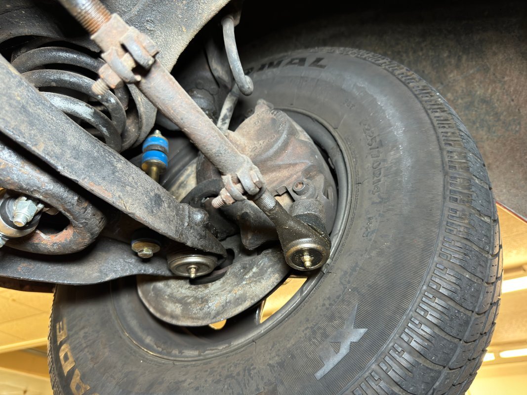 Driver quality conditions prevail underneath with plenty of non invasive surface rust, some oil on the pan, and some flaking rust on an inner body bracket and inner rocker panel. There's quite a bit on the underside panels as well. The dual exhaust runs through the X-frame and encounters Flowmaster mufflers before exiting out back. Coil spring suspension is up front with leaf springs in the back. In 2016 the springs, shocks, and a sway bar were replaced.