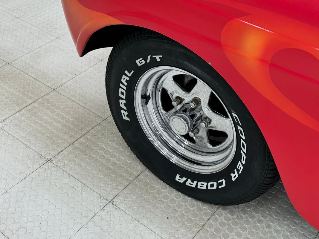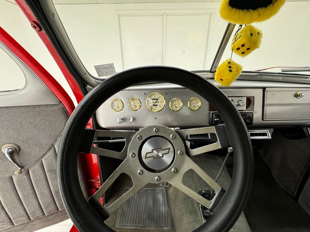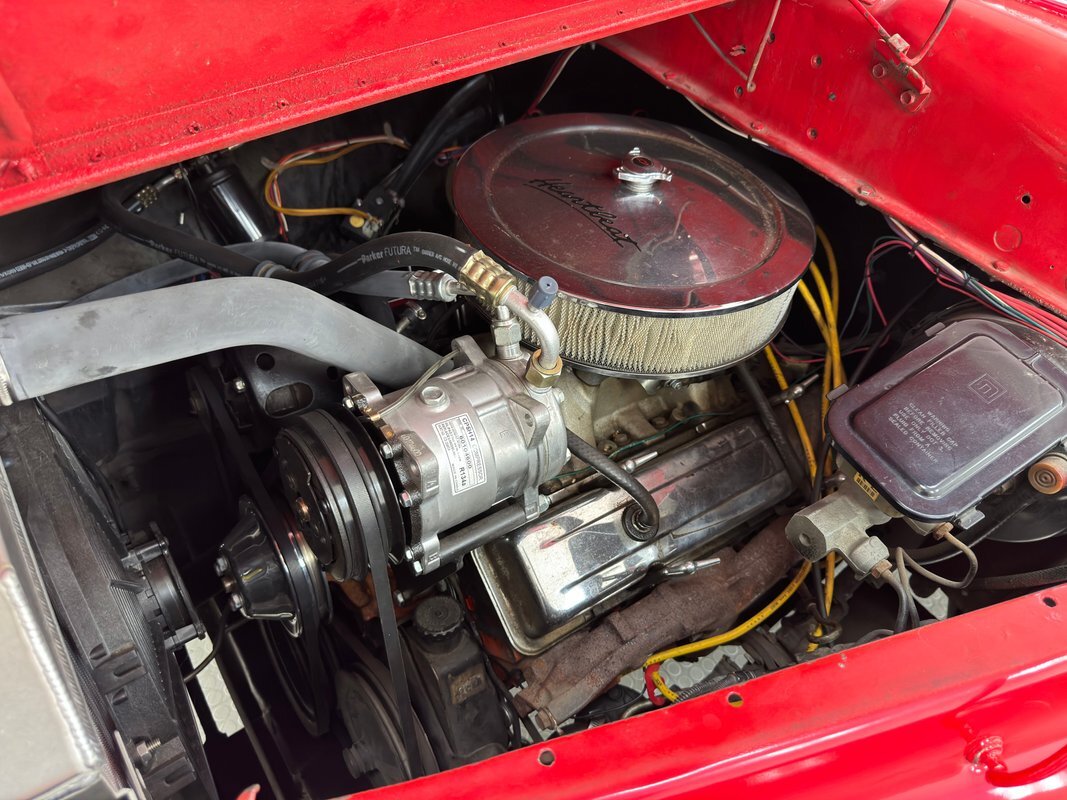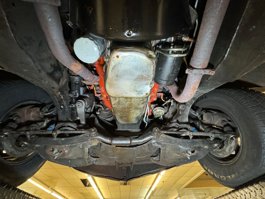 Lift the top of the hood and we find the driver quality 350ci V8 with a 4-barrel carburetor over an Edelbrock intake manifold. Behind it, a TH350 3-speed automatic transmission that was overhauled in 2018, sends power to the rear 10 bolt. Heat and A/C were installed in 2019. Power brakes are on the car with disc up front and drum out back.