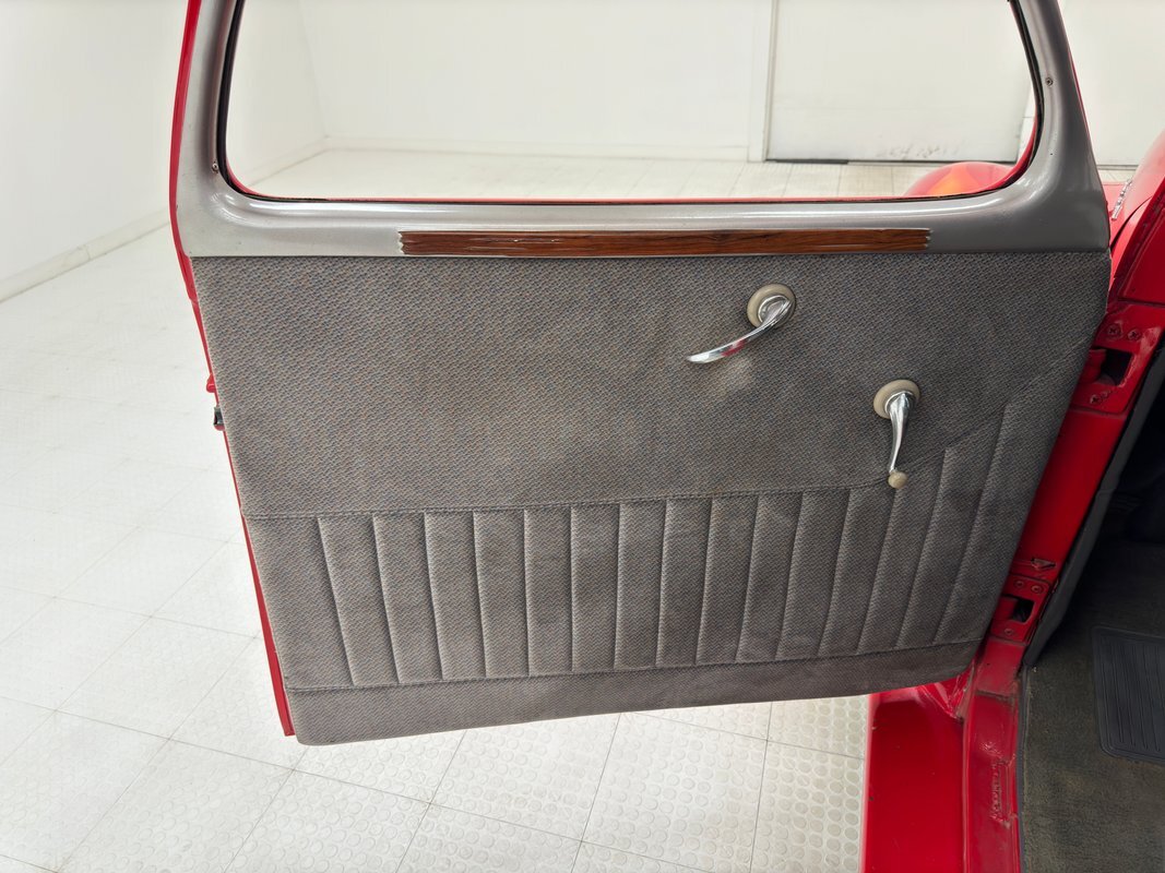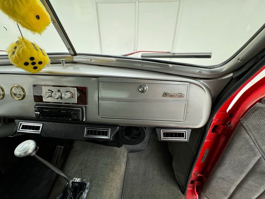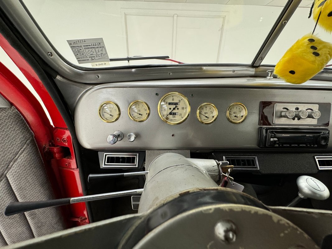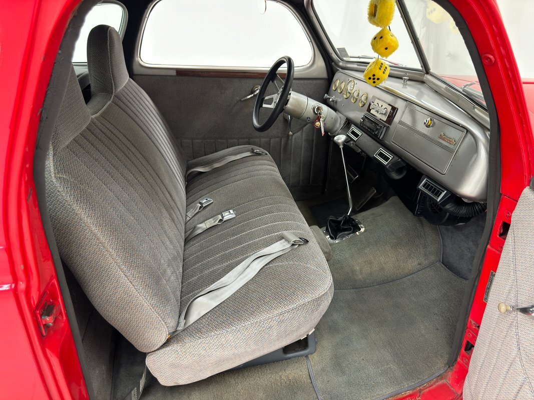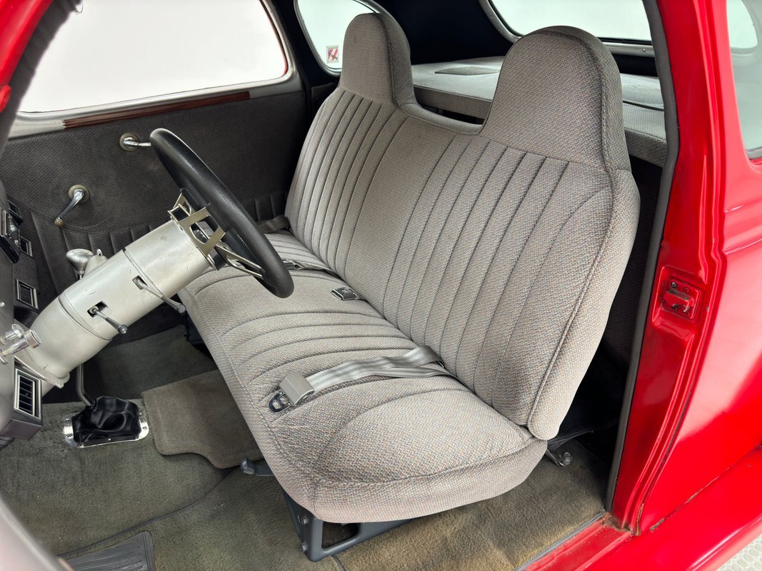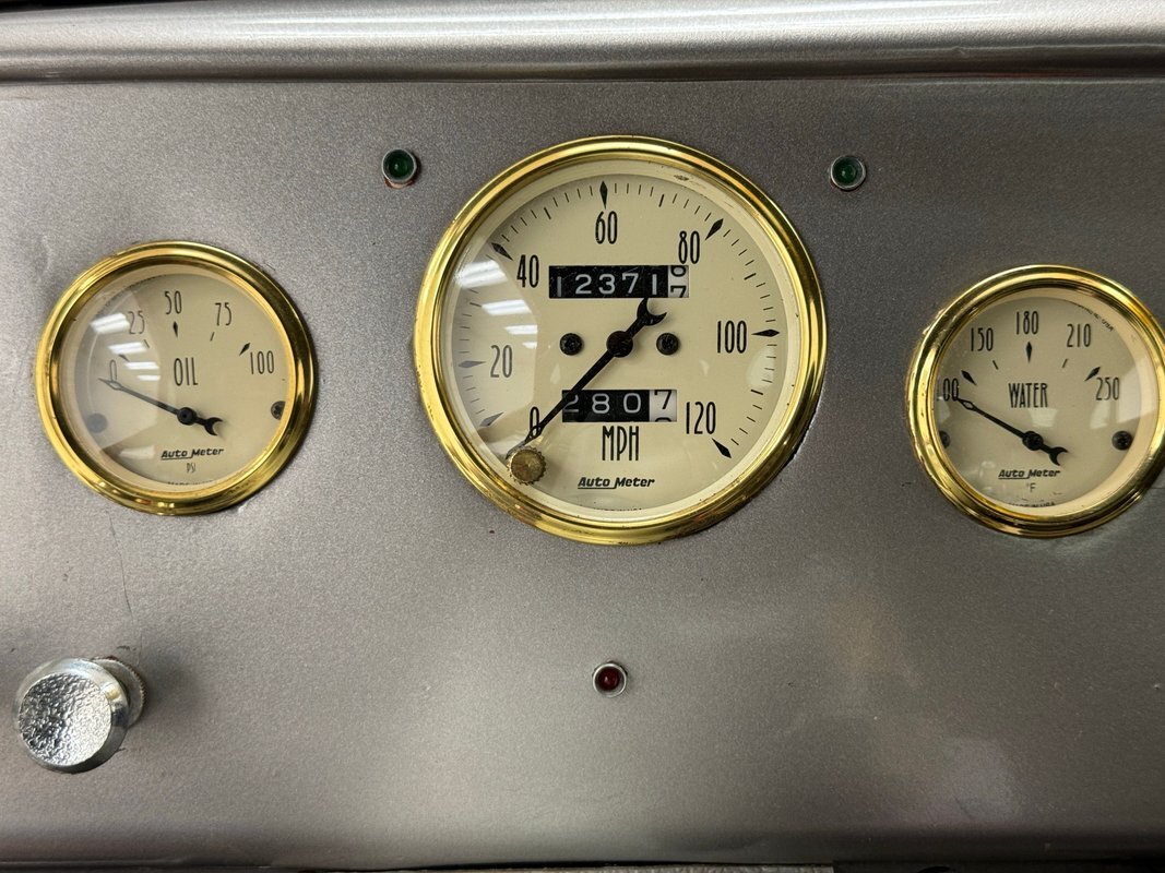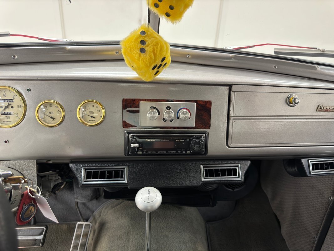 Gray velour door panels are neat and clean and contain vintage hardware and the material continues on the front bench seats borrowed from a more modern car, all tidy. A 4 spoke steering wheel front the metal dash painted aluminum color with brass rimmed and white faced AutoMeter gauges filling the sightline of the driver. A billet style knob panel handles the A/C and a Pioneer AM/FM/CD radio sits just below. A Lokar shifter is tall and floor mounted over low-pile gray carpet in good condition and loosely fitted. The gray headliner is in excellent shape and visors are intact and in place.
