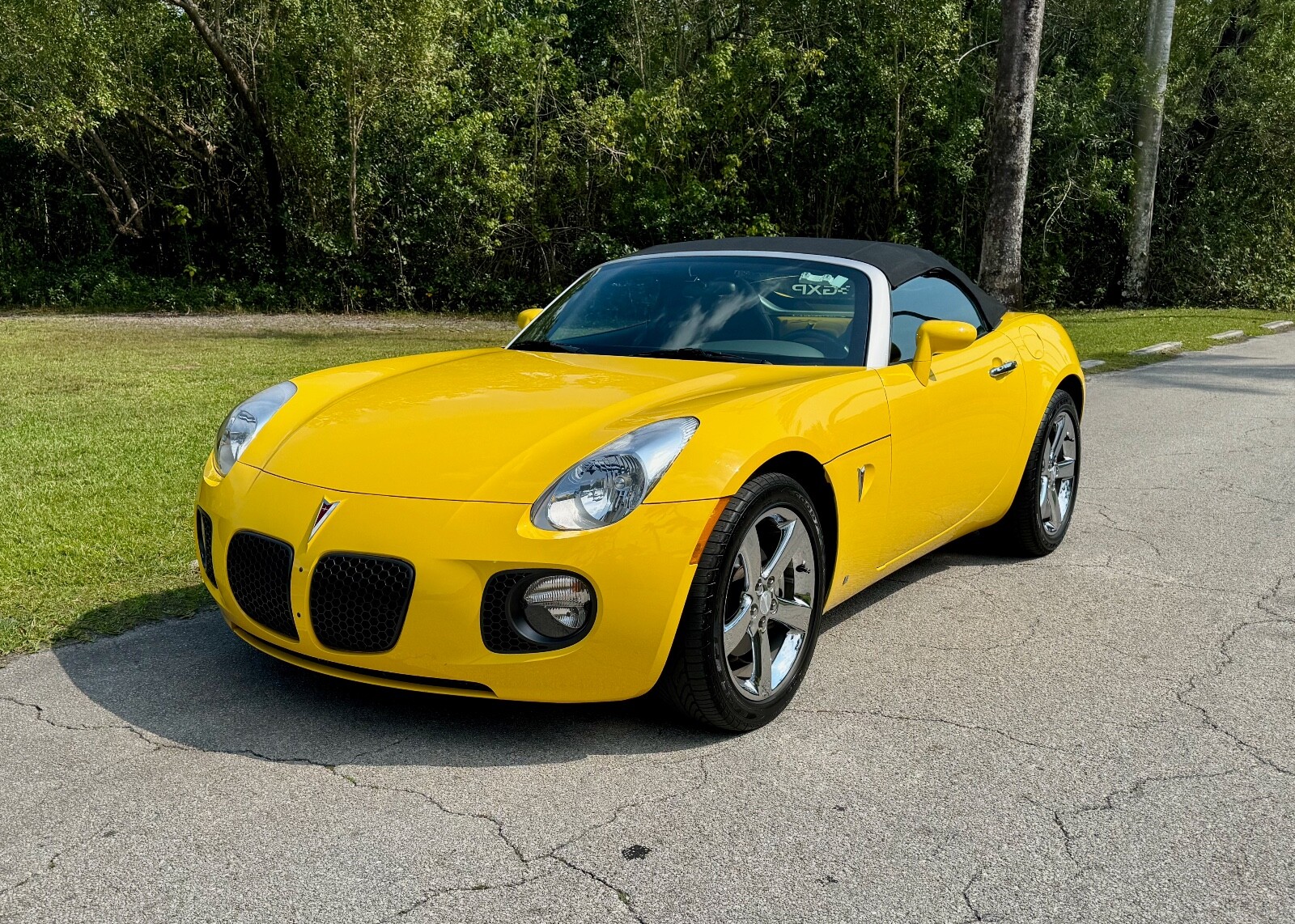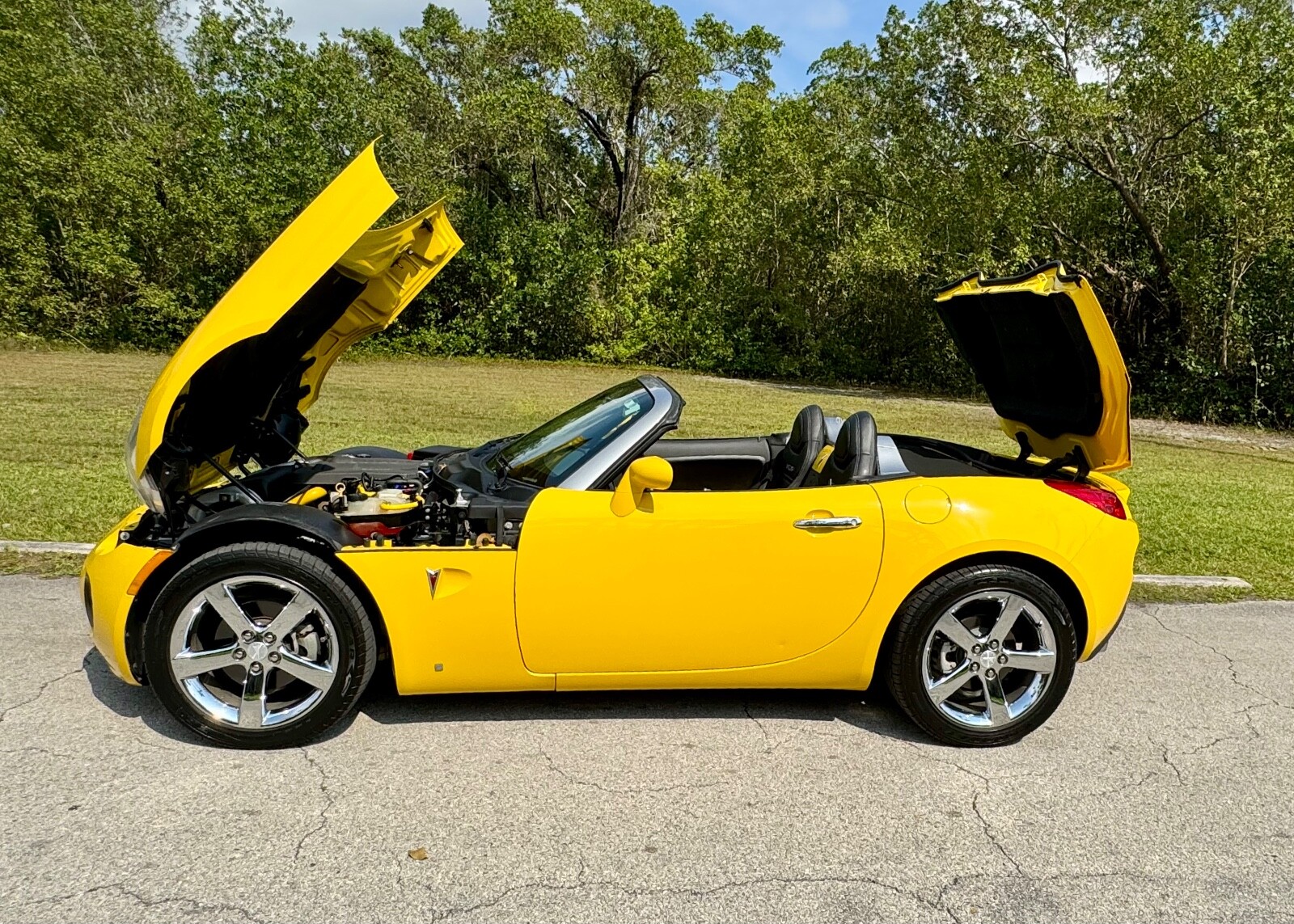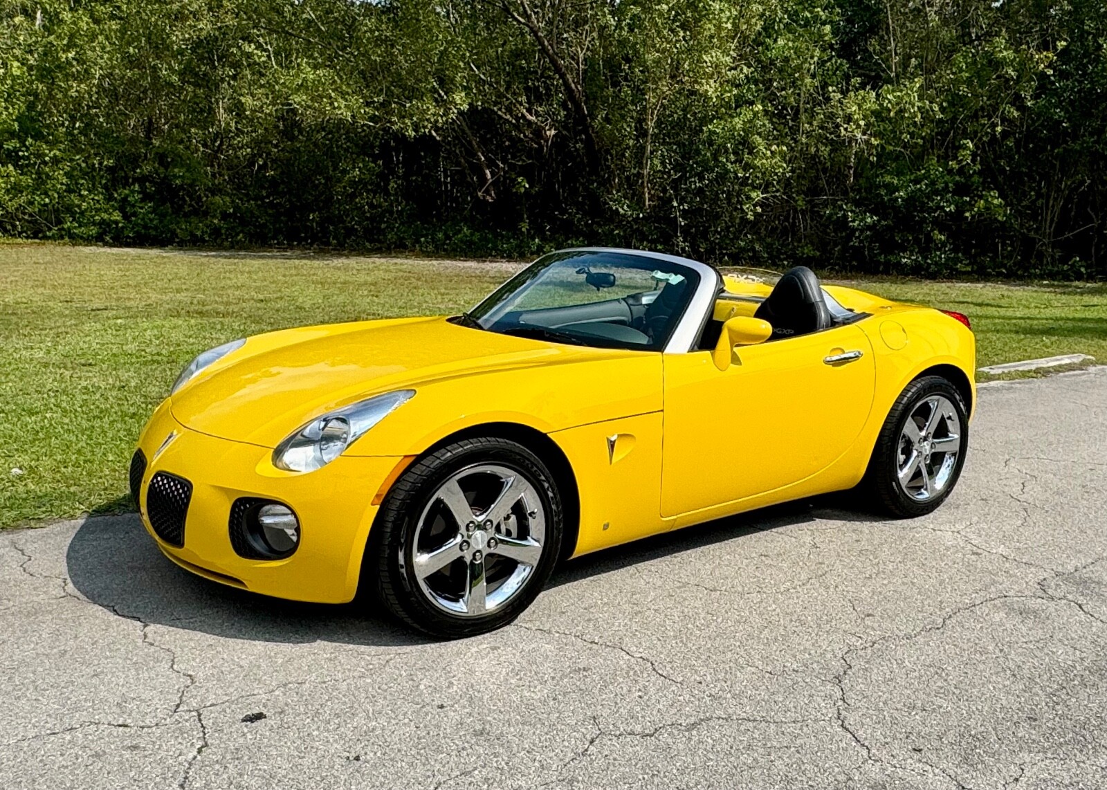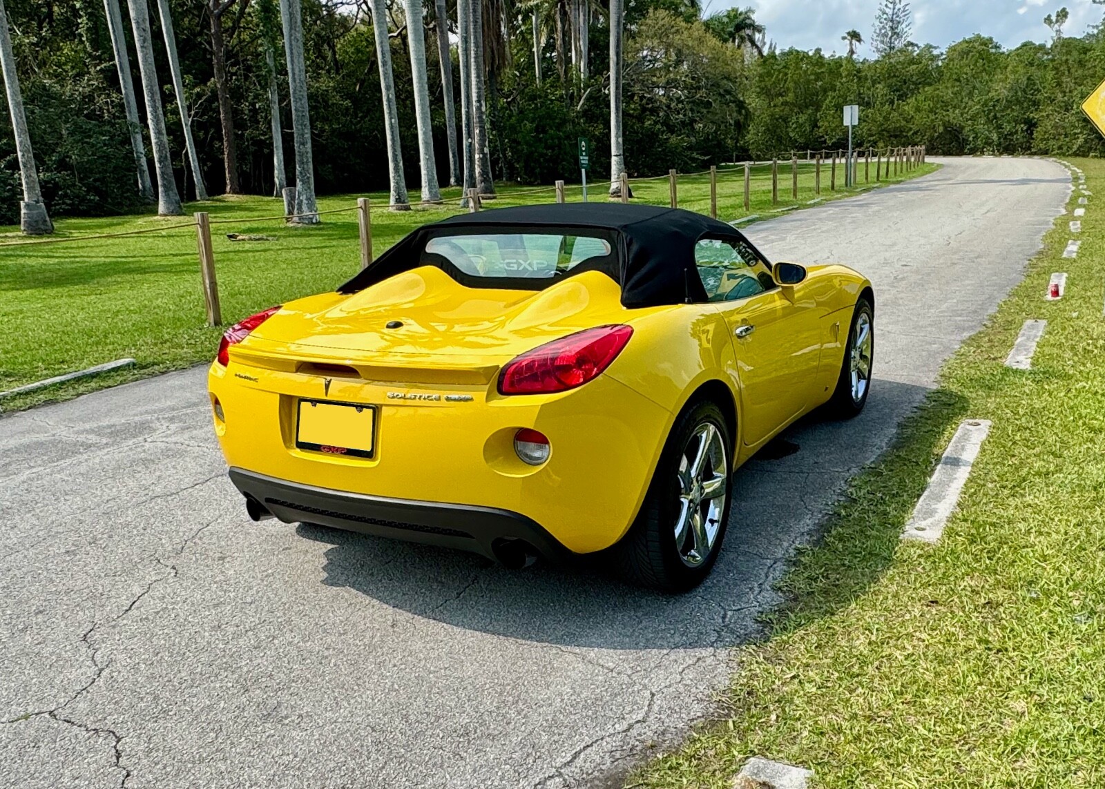 Outstanding 2007 Pontiac Solstace GXP Convertible in the signature Mean Yellow finish! This car checks all the boxes any Solstace buyer would be looking for, a very original car featuring a manual 5-speed transmission, no paintwork, no accidents, only one previous owner and a total of under 18,000 documented miles on the odometer. I purchased this Florida car with about 14,500 miles on her about three years ago and I love driving it when I have a chance. However, it is now being offered for sale to make way for a new vehicle. The vehicle has always been treated as a valuable classic, keeping in covered, clean and dry at all times. The vehicle has received several intelligent upgrades that will add to the owners driving enjoyment, while keeping the vehicle unmodified and very original. These upgrades include silicone yellow and black engine and turbo hoses, a racing backbone replaces the thin backbone that comes with the car to enhance stability, rigidity, and handling. Also a high-performance fuel filter was installed to prevent bad gas from entering the engine. Other important upgrades include a remote control battery kill switch, an always-on airbag bypass that activates driver and passanger airbags in the event of a crash, original equipment trunk spoiler, etched glass wind restrictor with multi-color LED lighting remote control, outstanding SIRIUS ready sound system with a stubby radio antenna, bluetooth phone and streaming music ready, saddle bags storage for center console, original books, maintenance records, two keys with remote controls, two of battery kill switch remote controls, assorted spare parts, accessories, and all original parts that had been upgraded.