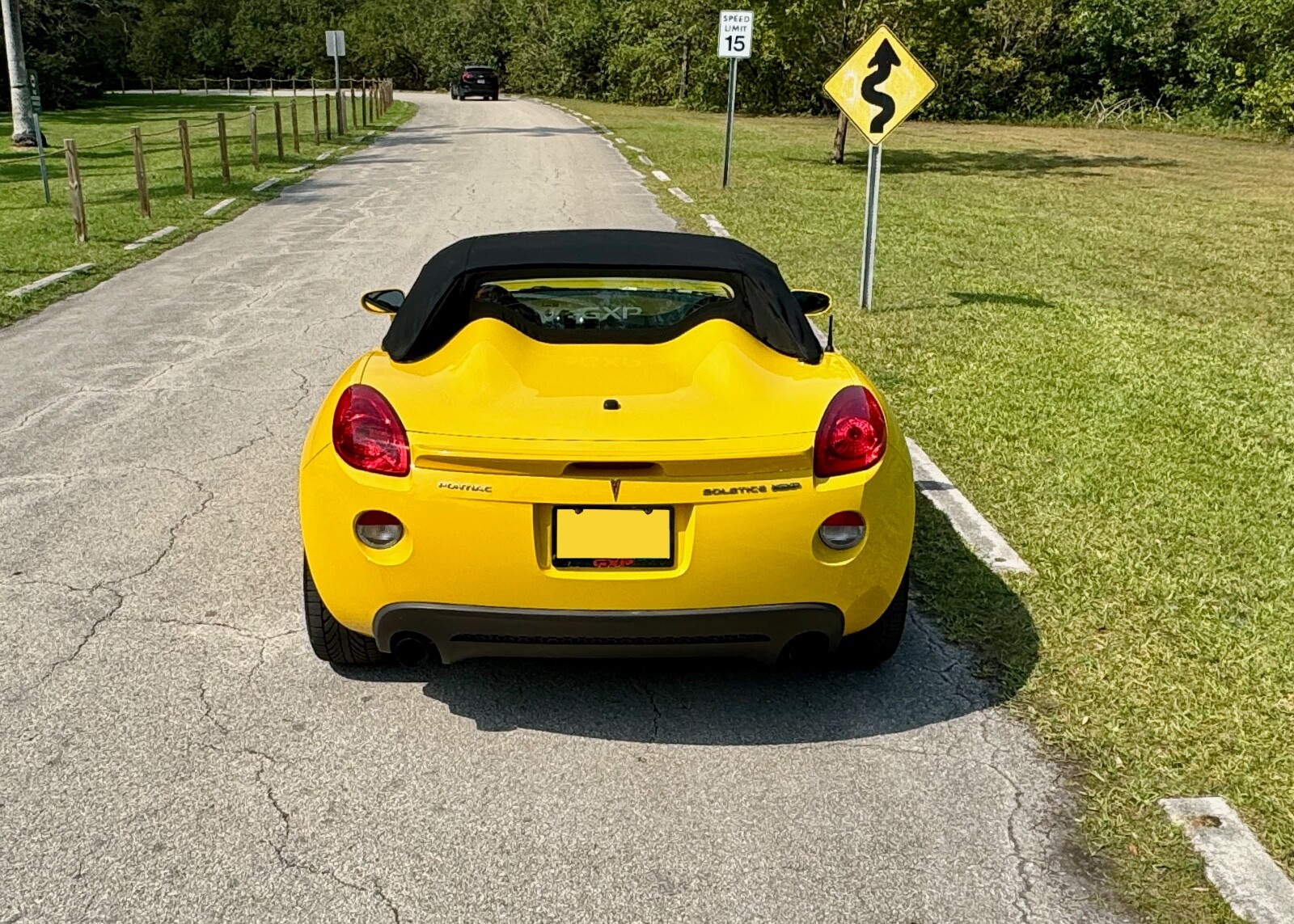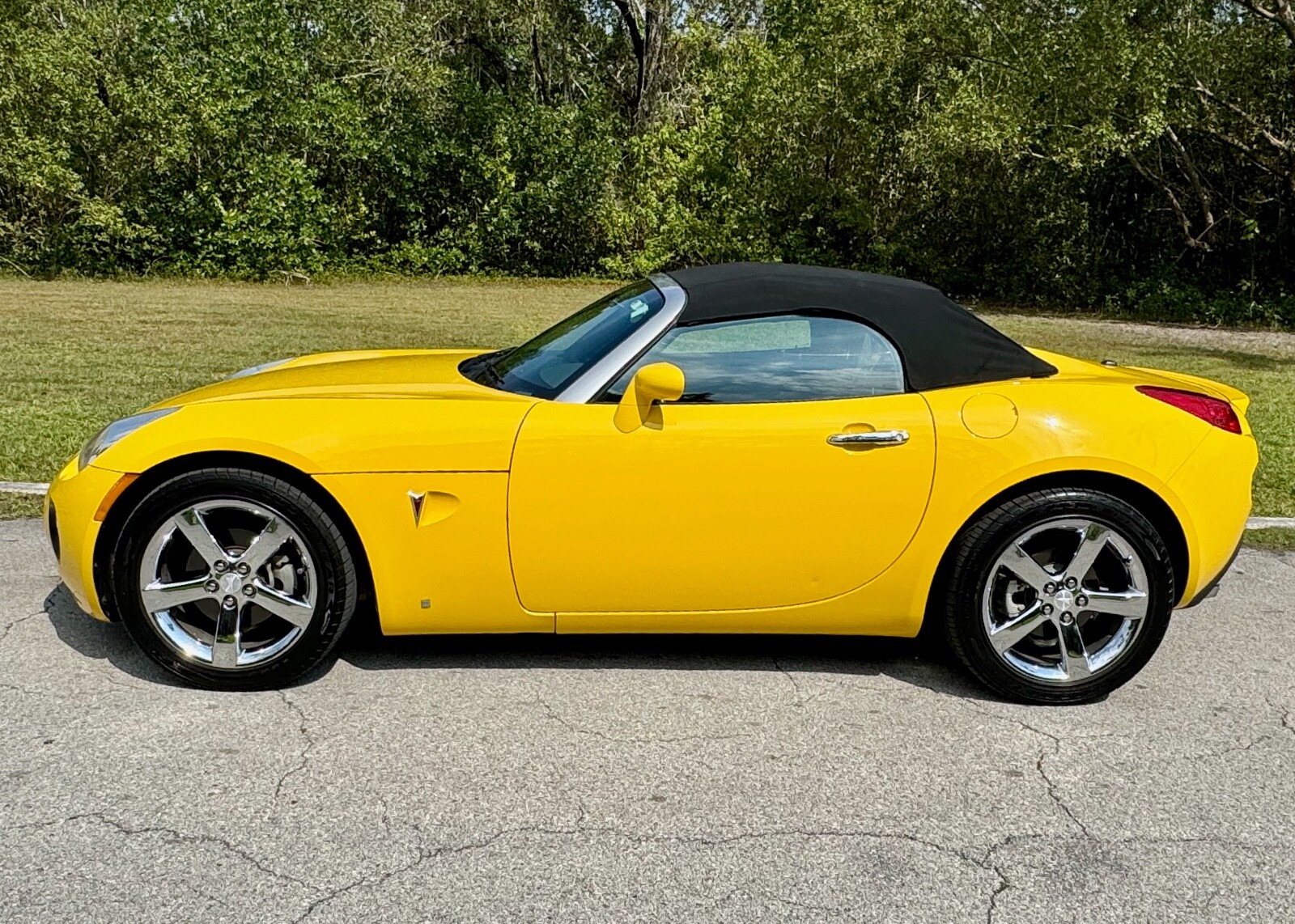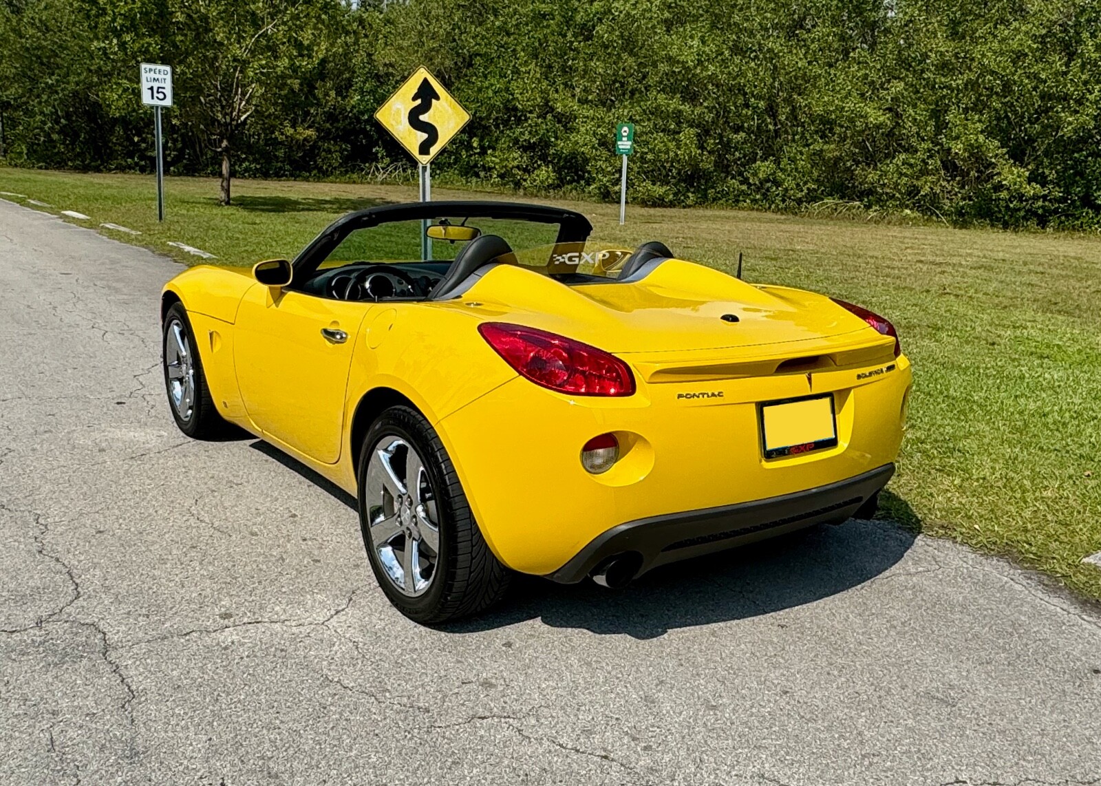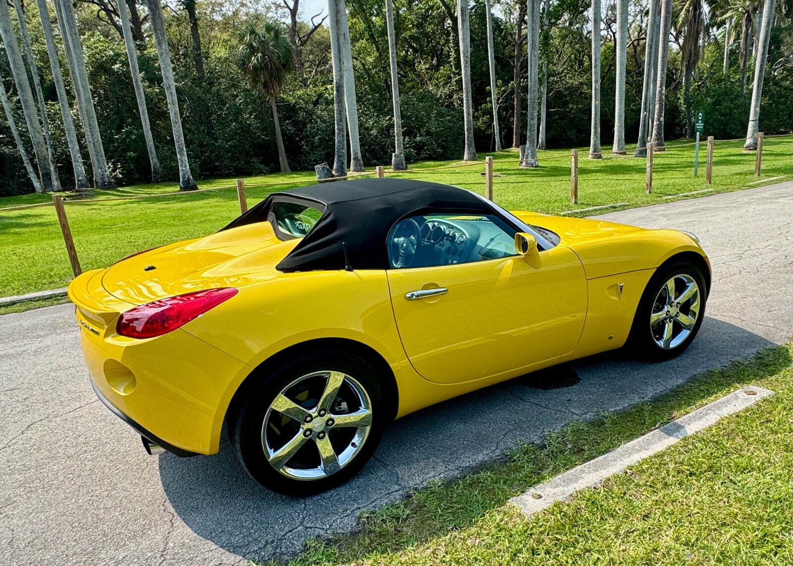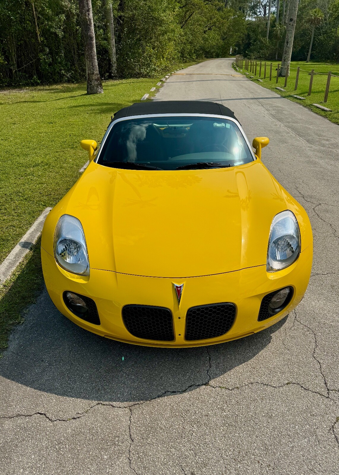 Outstanding 2007 Pontiac Solstace GXP Convertible in the signature Mean Yellow finish! This car checks all the boxes any Solstace buyer would be looking for, a very original car featuring a manual 5-speed transmission, no paintwork, no accidents, only one previous owner and a total of under 18,000 documented miles on the odometer. I purchased this Florida car with about 14,500 miles on her about three years ago and I love driving it when I have a chance. However, it is now being offered for sale to make way for a new vehicle. The vehicle has always been treated as a valuable classic, keeping in covered, clean and dry at all times. The vehicle has received several intelligent upgrades that will add to the owners driving enjoyment, while keeping the vehicle unmodified and very original. These upgrades include silicone yellow and black engine and turbo hoses, a racing backbone replaces the thin backbone that comes with the car to enhance stability, rigidity, and handling. Also a high-performance fuel filter was installed to prevent bad gas from entering the engine. Other important upgrades include a remote control battery kill switch, an always-on airbag bypass that activates driver and passanger airbags in the event of a crash, original equipment trunk spoiler, etched glass wind restrictor with multi-color LED lighting remote control, outstanding SIRIUS ready sound system with a stubby radio antenna, bluetooth phone and streaming music ready, saddle bags storage for center console, original books, maintenance records, two keys with remote controls, two of battery kill switch remote controls, assorted spare parts, accessories, and all original parts that had been upgraded.
