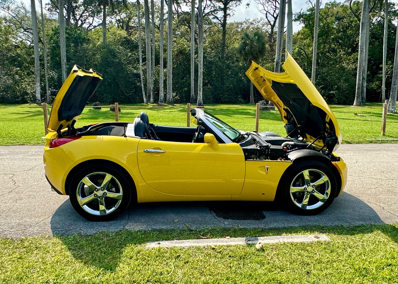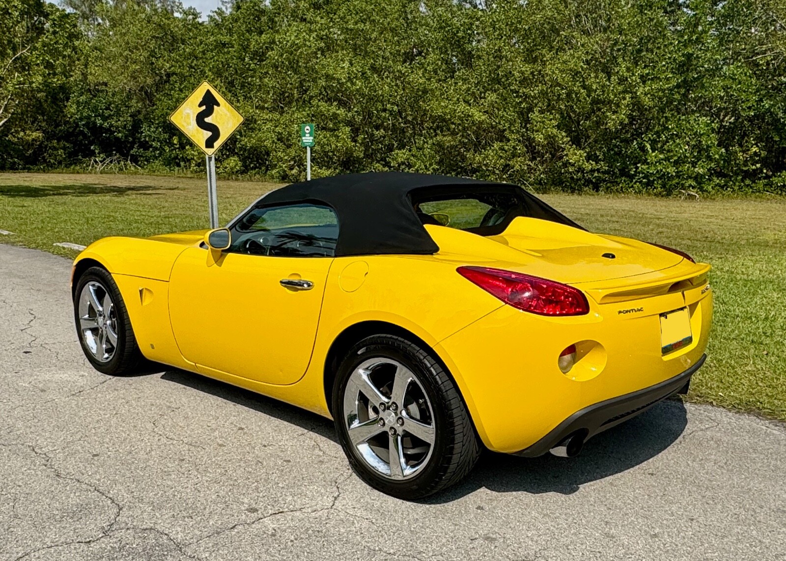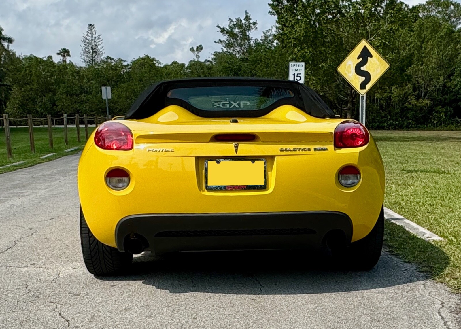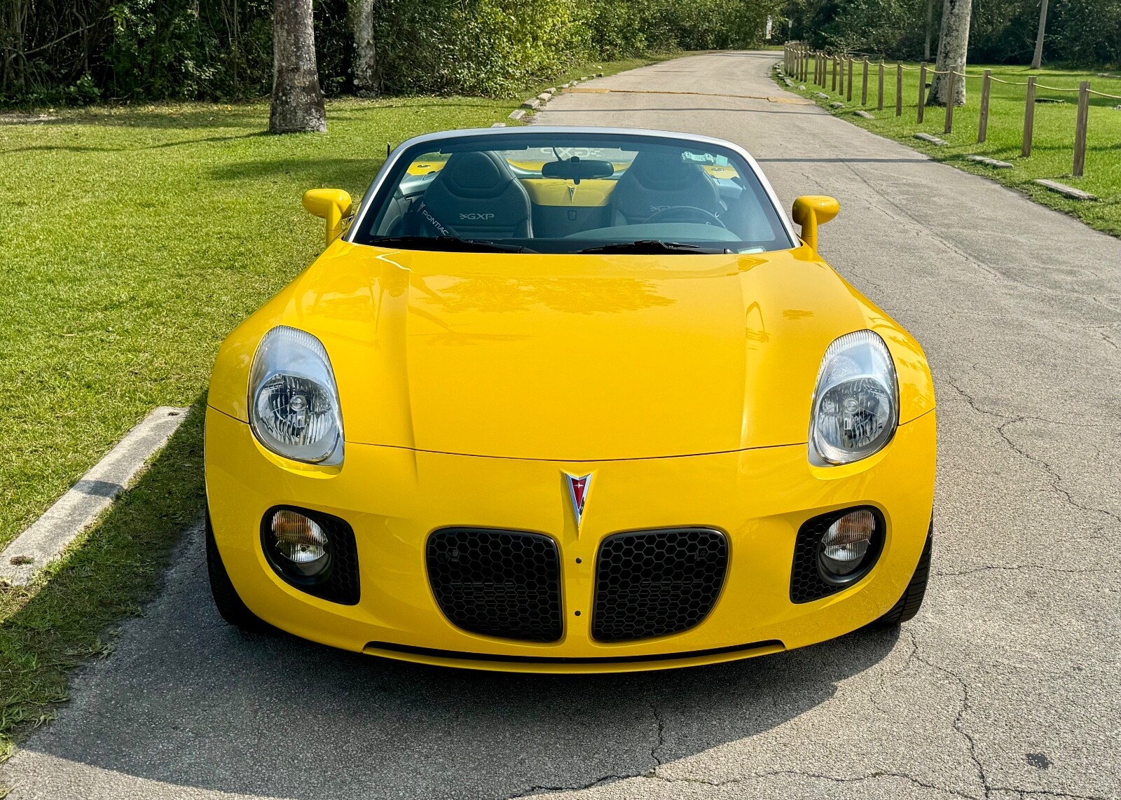 Outstanding 2007 Pontiac Solstace GXP Convertible in the signature Mean Yellow finish! This car checks all the boxes any Solstace buyer would be looking for, a very original car featuring a manual 5-speed transmission, no paintwork, no accidents, only one previous owner and a total of under 18,000 documented miles on the odometer. I purchased this Florida car with about 14,500 miles on her about three years ago and I love driving it when I have a chance. However, it is now being offered for sale to make way for a new vehicle. The vehicle has always been treated as a valuable classic, keeping in covered, clean and dry at all times. The vehicle has received several intelligent upgrades that will add to the owners driving enjoyment, while keeping the vehicle unmodified and very original. These upgrades include silicone yellow and black engine and turbo hoses, a racing backbone replaces the thin backbone that comes with the car to enhance stability, rigidity, and handling. Also a high-performance fuel filter was installed to prevent bad gas from entering the engine. Other important upgrades include a remote control battery kill switch, an always-on airbag bypass that activates driver and passanger airbags in the event of a crash, original equipment trunk spoiler, etched glass wind restrictor with multi-color LED lighting remote control, outstanding SIRIUS ready sound system with a stubby radio antenna, bluetooth phone and streaming music ready, saddle bags storage for center console, original books, maintenance records, two keys with remote controls, two of battery kill switch remote controls, assorted spare parts, accessories, and all original parts that had been upgraded.